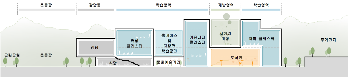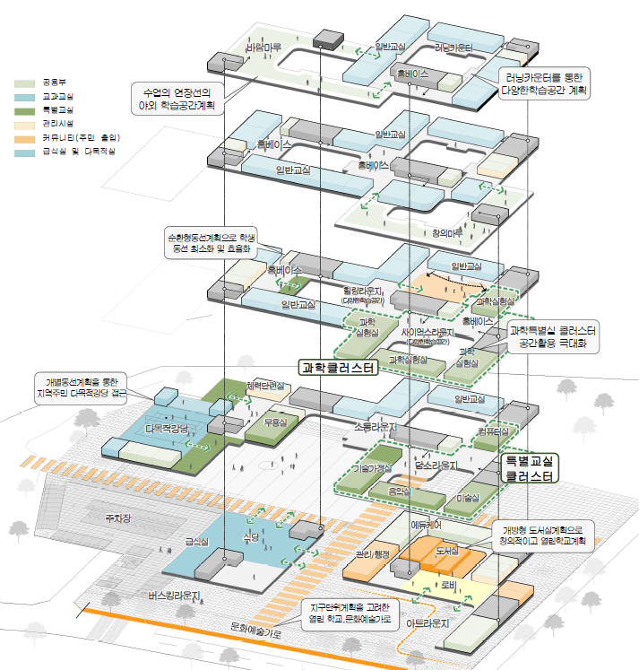이를 통해 산책로, 근린공원, 커뮤니티가로를 연결하고, 그 안에서 다양한 소통공간을 조성하여 학생들과 지역사회가 관계 맺을 수 있는 환경을 구축하였다. 이러한 축을 중심으로 학습영역과 개방영역을 배치하고, 영역 사이에 지역 개방공간과 진입광장 등의 매개공간을 조성함으로써 지역사회와 함께 성장하는 문화예술 이벤트 공간을 마련하였다.