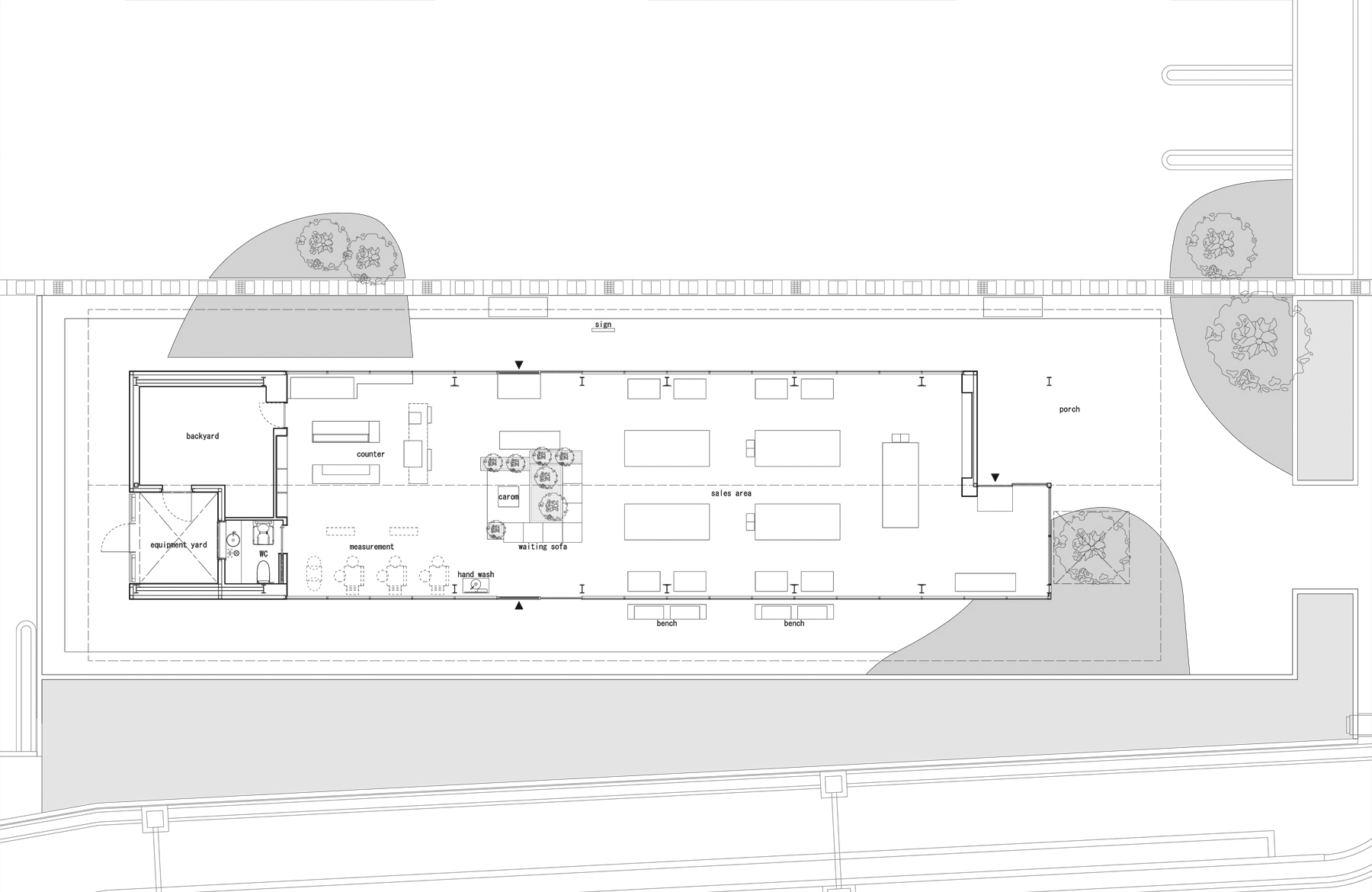 건축가는 비와 호수가 가진 자연환경을 반영하여 매장의 대규모 공간을 가볍고 긴 지붕으로 덮었다. 길게 뻗은 처마 아래 넓은 공간에는 식재를 심어 카페처럼 쉴 수 있게 했다.