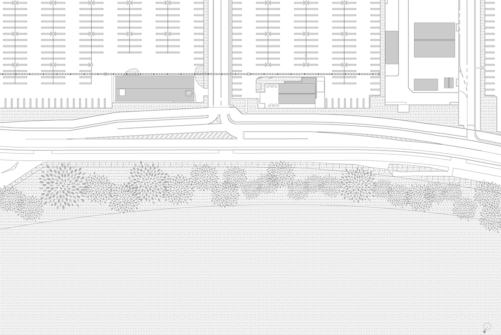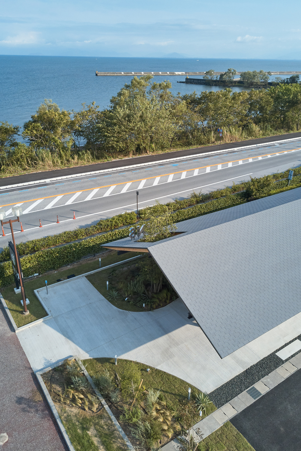 건축가는 비와 호수가 가진 자연환경을 반영하여 매장의 대규모 공간을 가볍고 긴 지붕으로 덮었다. 길게 뻗은 처마 아래 넓은 공간에는 식재를 심어 카페처럼 쉴 수 있게 했다.