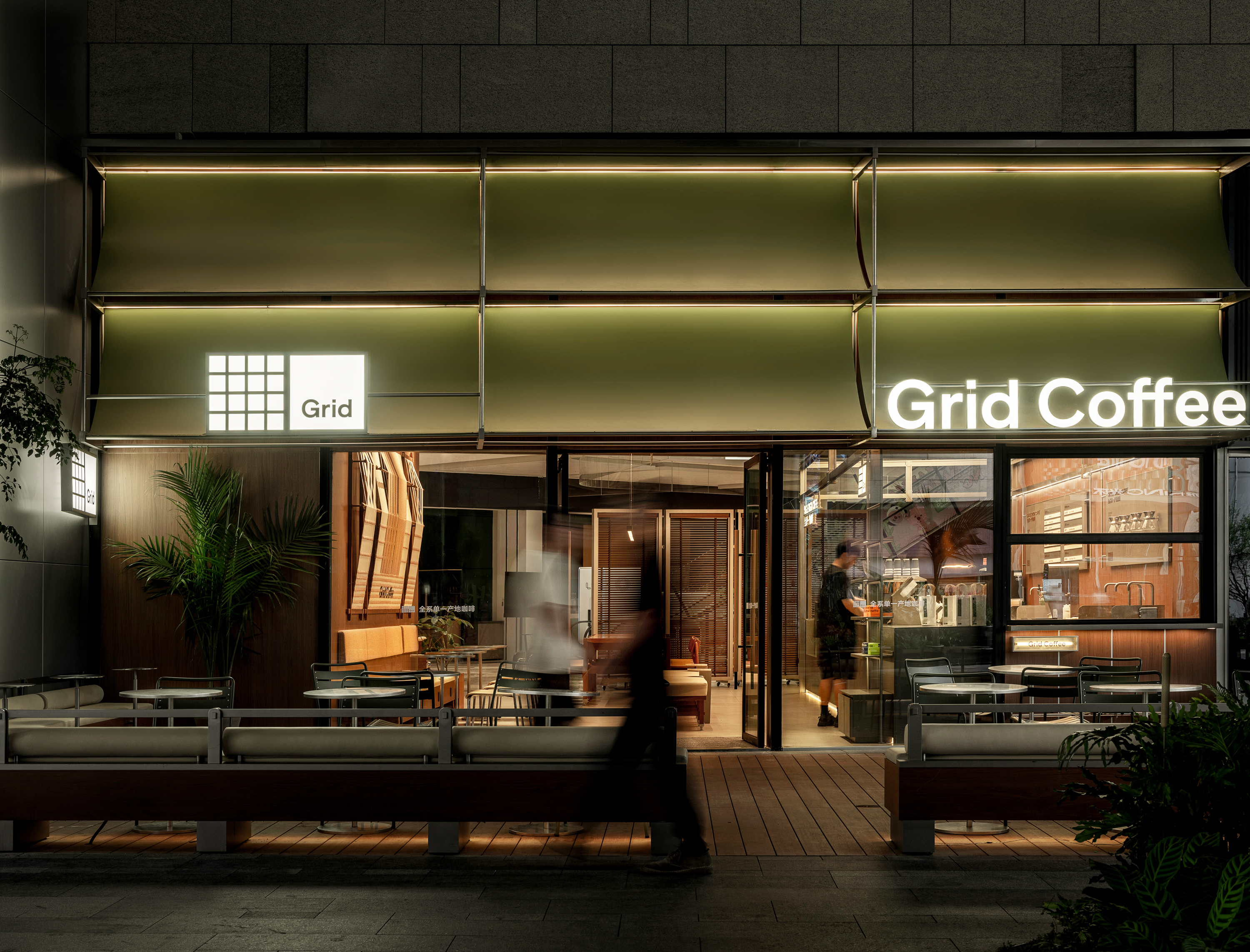 ‘청두 더 링’ 쇼핑센터에 위치한 그리드 커피 매장은 유동 인구가 많은 두 개의 상업용 건물 사이에 자리 잡고 있다. 디자이너는 그리드의 패턴과 브랜드 시그니처 색상인 녹색을 사용하여 보행자의 시선을 사로잡을 수 있는 파사드를 제안했다. 엇갈린 각도의 그리드 패턴은 커피 농장의 구불구불한 언덕을 연상시키며 브랜드의 친환경적인 아이덴티티를 강조한다.