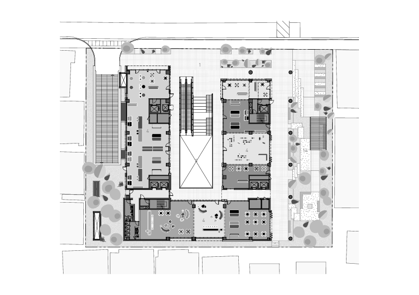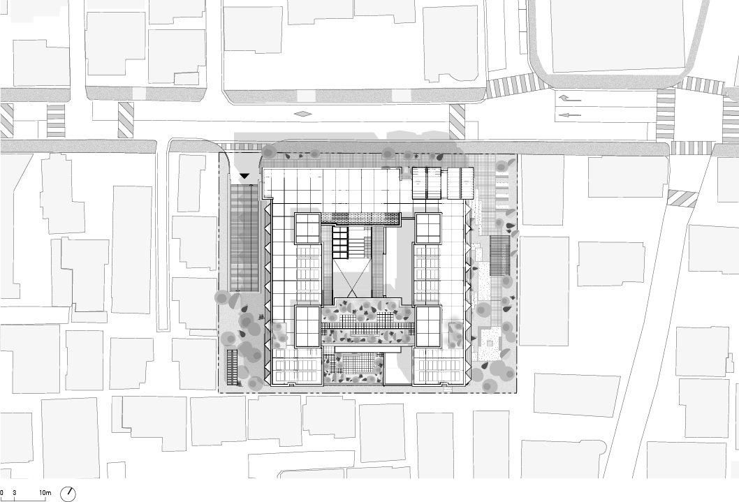 오픈 스페이스인 라운지와 중정은 보행자와 주민의 쉼터가 되며, 지역 커뮤니티를 활성화하는 지역 연계 프로그램이 진행된다. 여기에 공유 주거, 공유 오피스, 공유 주방과 같은 공유 프로그램을 통해 지역을 체험하고 자신만의 삶의 방식을 찾아 나갈 수 있다. 로컬스티치 크리에이터 타운 서교는 7개 층으로 주변 건축물에 비해 상대적으로 볼륨이 크게 지어졌다. 이러한 물리적인 규모의 차이를 해소하기 위해 저층부 일부를 시각적으로 분리하여 기존 건축물들과 어우러지도록 계획했다. 1, 2층과 상층부는 박공형 디자인과 외관 재료의 대비를 통해 완전히 분리했다. 저층부는 따뜻한 느낌의 붉은 벽돌으로 마감되었으며, 고층은 도시의 색을 담는 것과 동시에 주변 환경에서 익숙하게 찾아볼 수 있는 콘크리트 블록 쌓기 방식으로 지어졌다. 이로 인해 저층은 분산된 마을의 이미지를 가지며, 지역 가로변의 휴먼 스케일과 자연스럽게 동화되는 이미지를 느낄 수 있다.