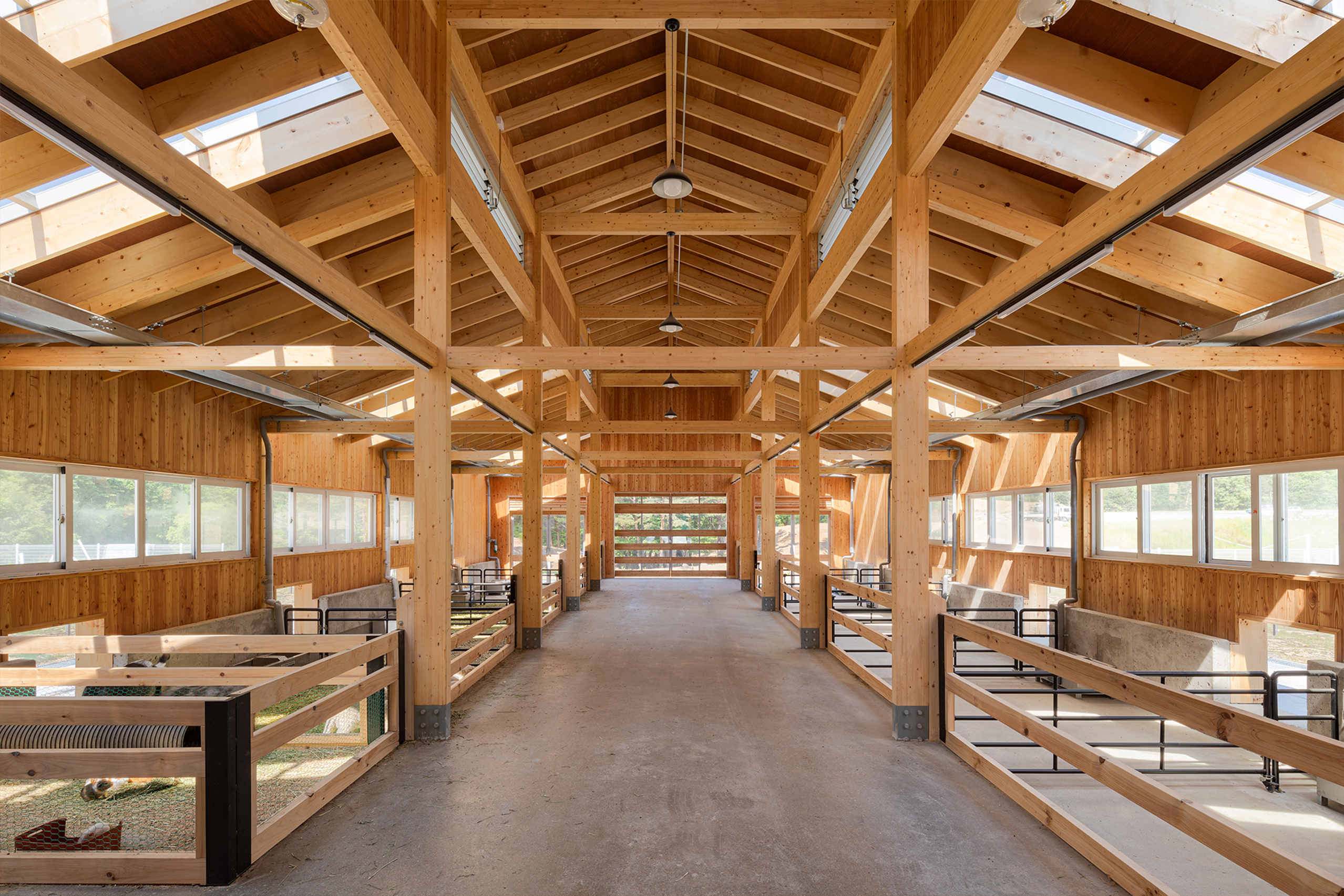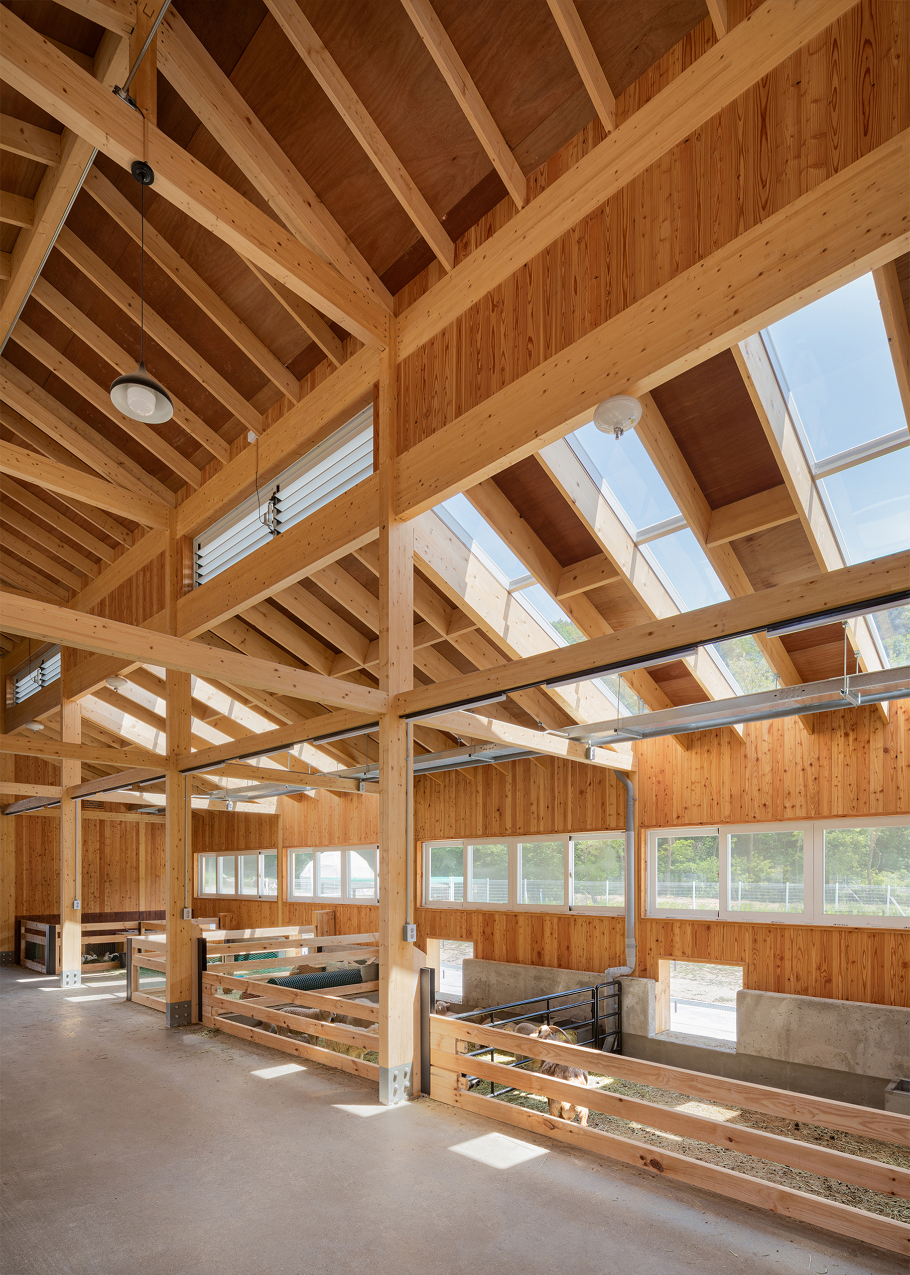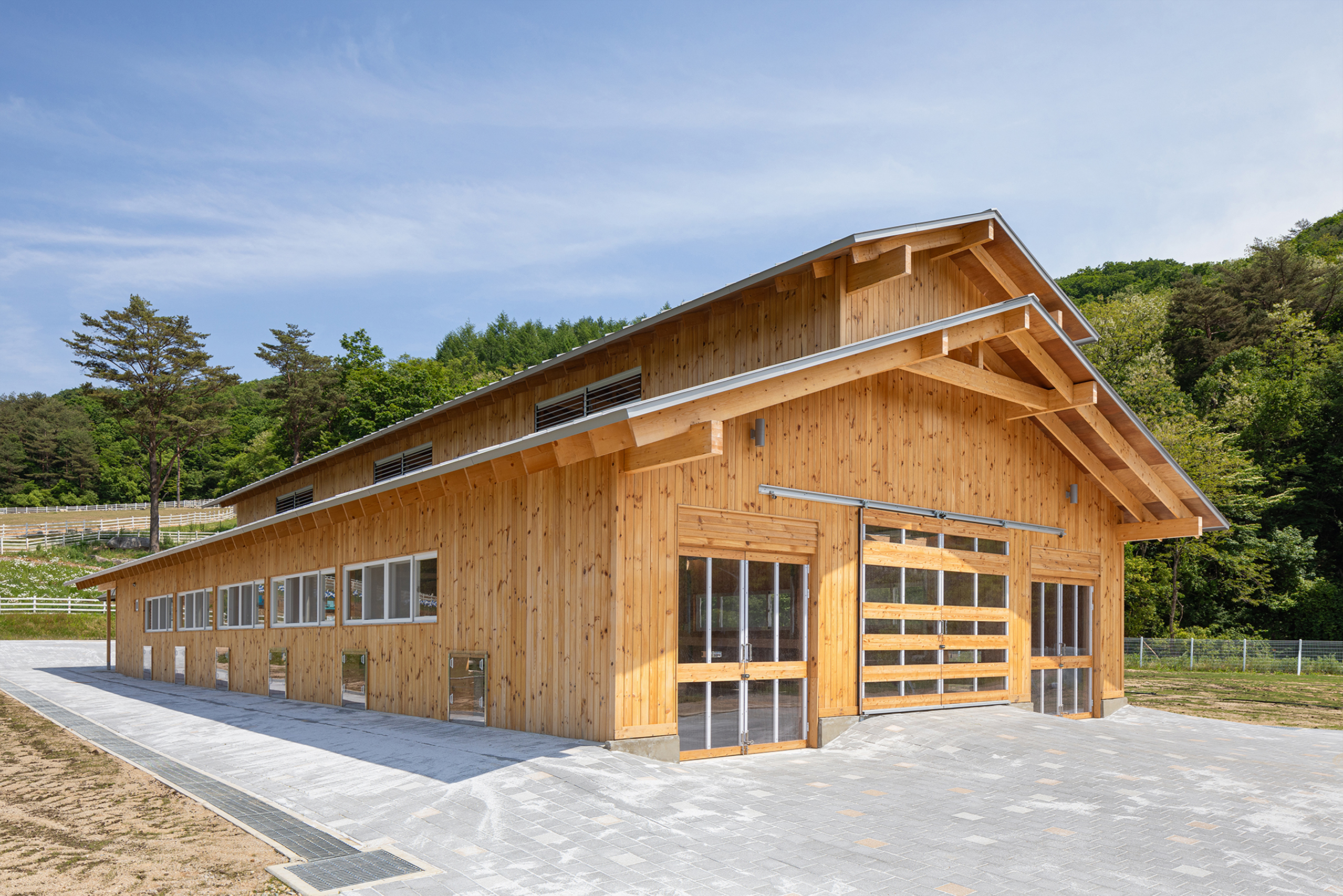 축사는 마감재에서 비교적 자유로운 용도의 건축물인데, 다양한 공간으로 활용할 수 있도록 대형 목조 공간을 구현하기 위해 중목구조를 선택했다. 기본적인 목구조의 구조 방식을 담백하게 담으며 강풍과 폭설에 대비해 구조를 강화했고, 양들의 전용 출입구를 별도로 계획하여 외부 방사 공간과 자연스럽게 연결했다. 목장 특성상 유지관리에도 불편함이 없어야 했는데, 이를 위해 시설의 특수성을 감안한 직관적인 설비 시스템을 마련했다.