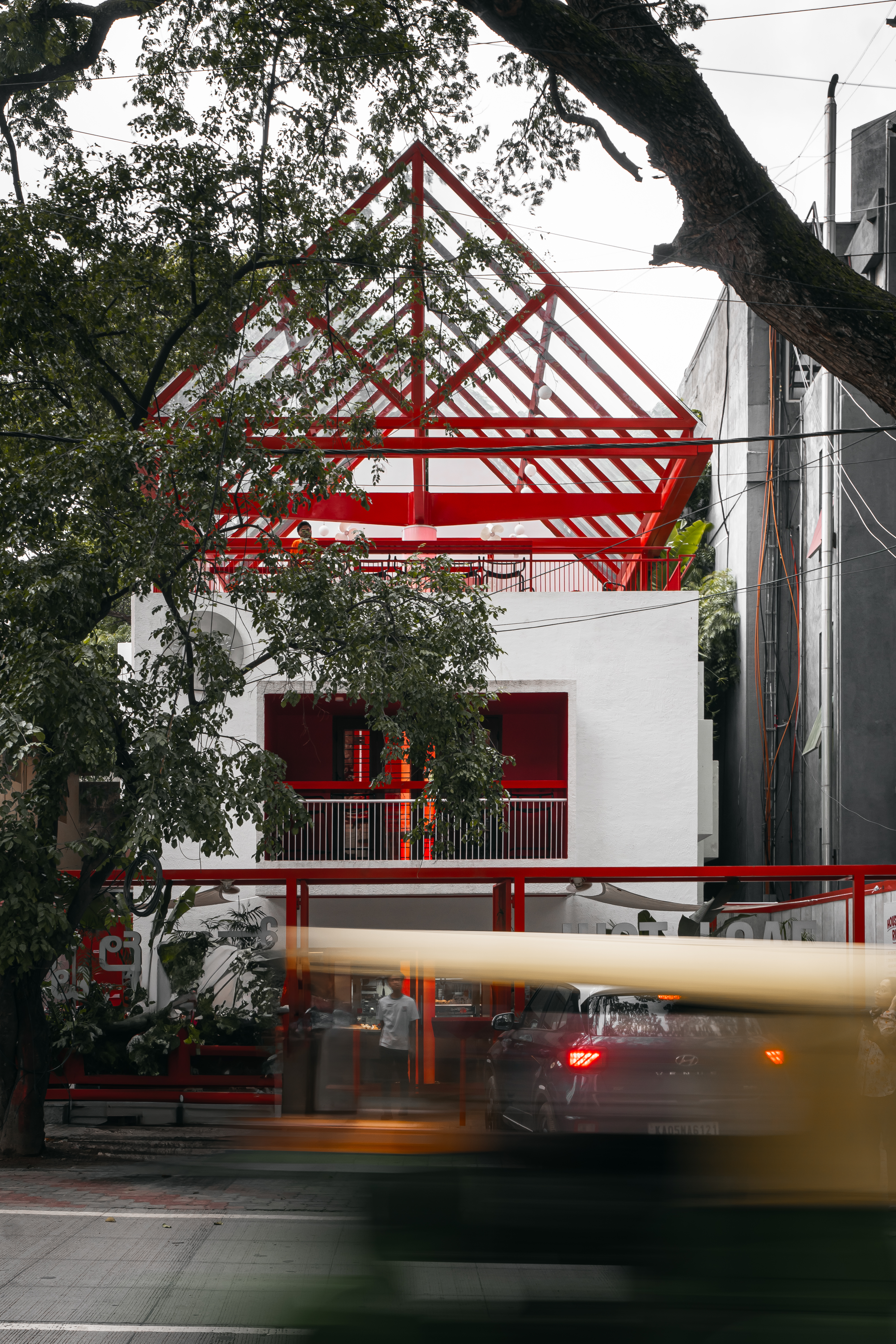 방갈로르 도심 한가운데, 40년 된 콘크리트 건물이 울창한 레인 트리 아래 자리하고 있다. 전형적인 도시와 마찬가지로 건물은 양옆이 다른 건물들로 막혀 있었고, 유일하게 열린 공간은 도로와 하늘뿐이었다. 이러한 조건 속에서 건축가는 부분적으로 높이를 다르게 하여 수직적 확장을 구상했다.