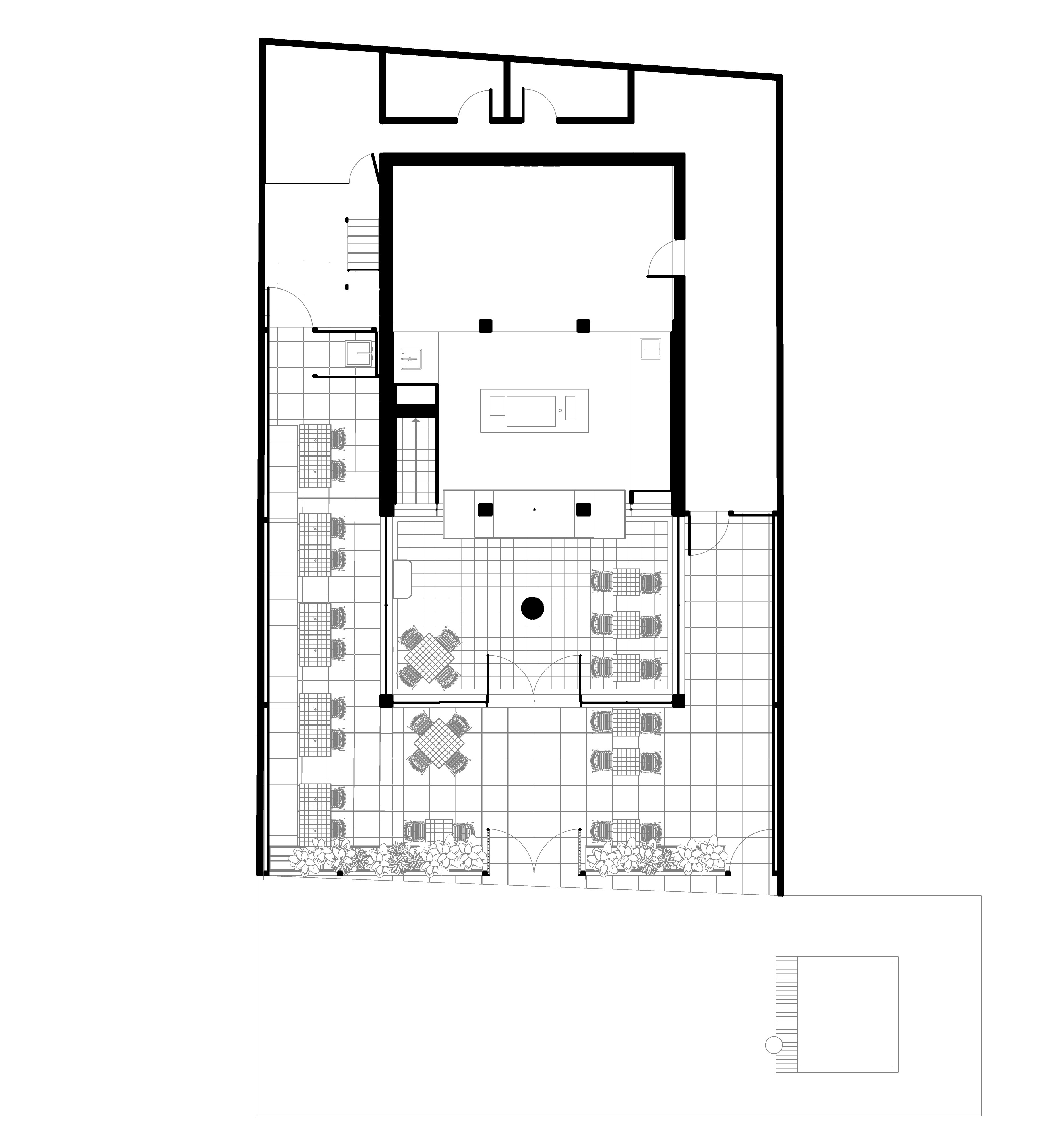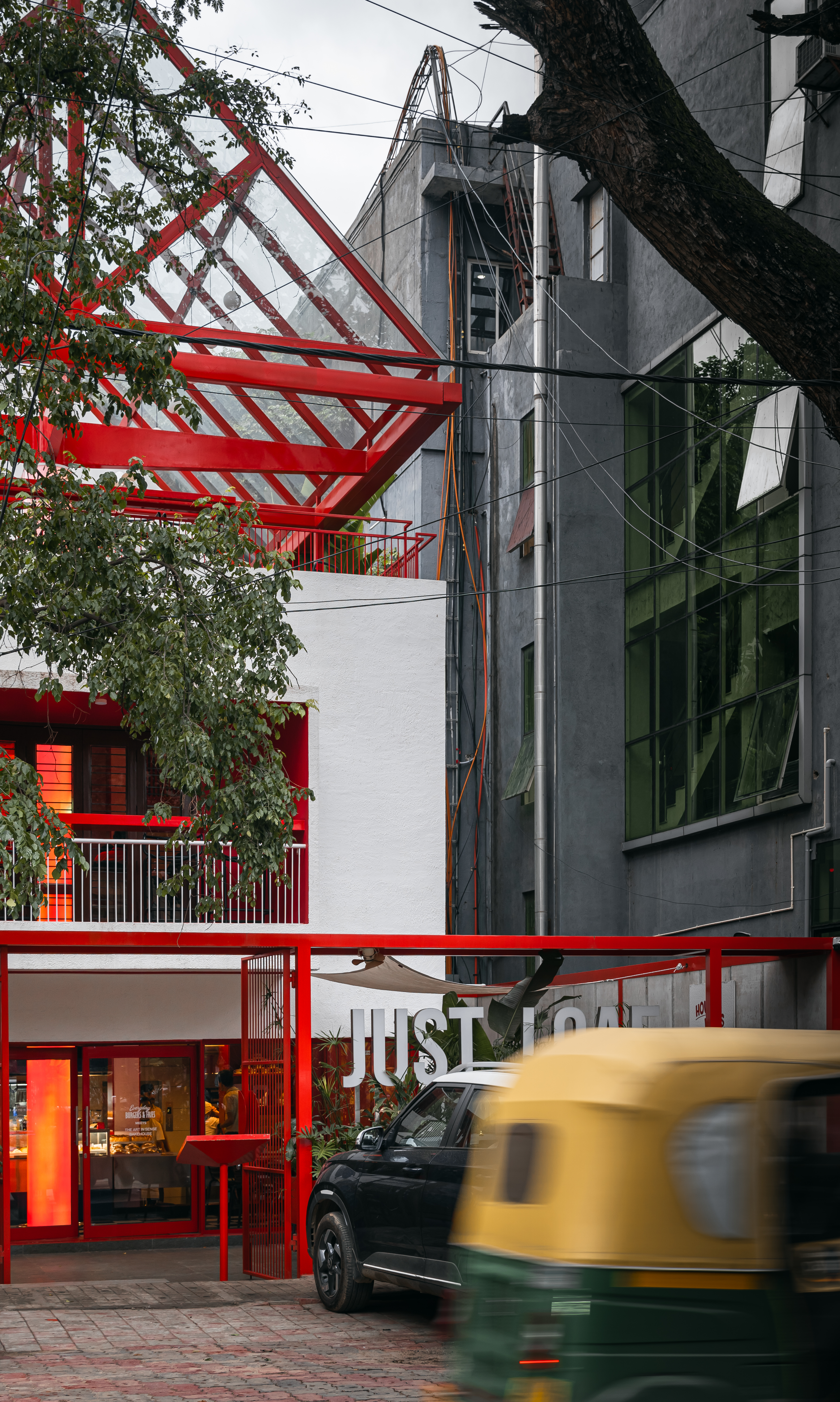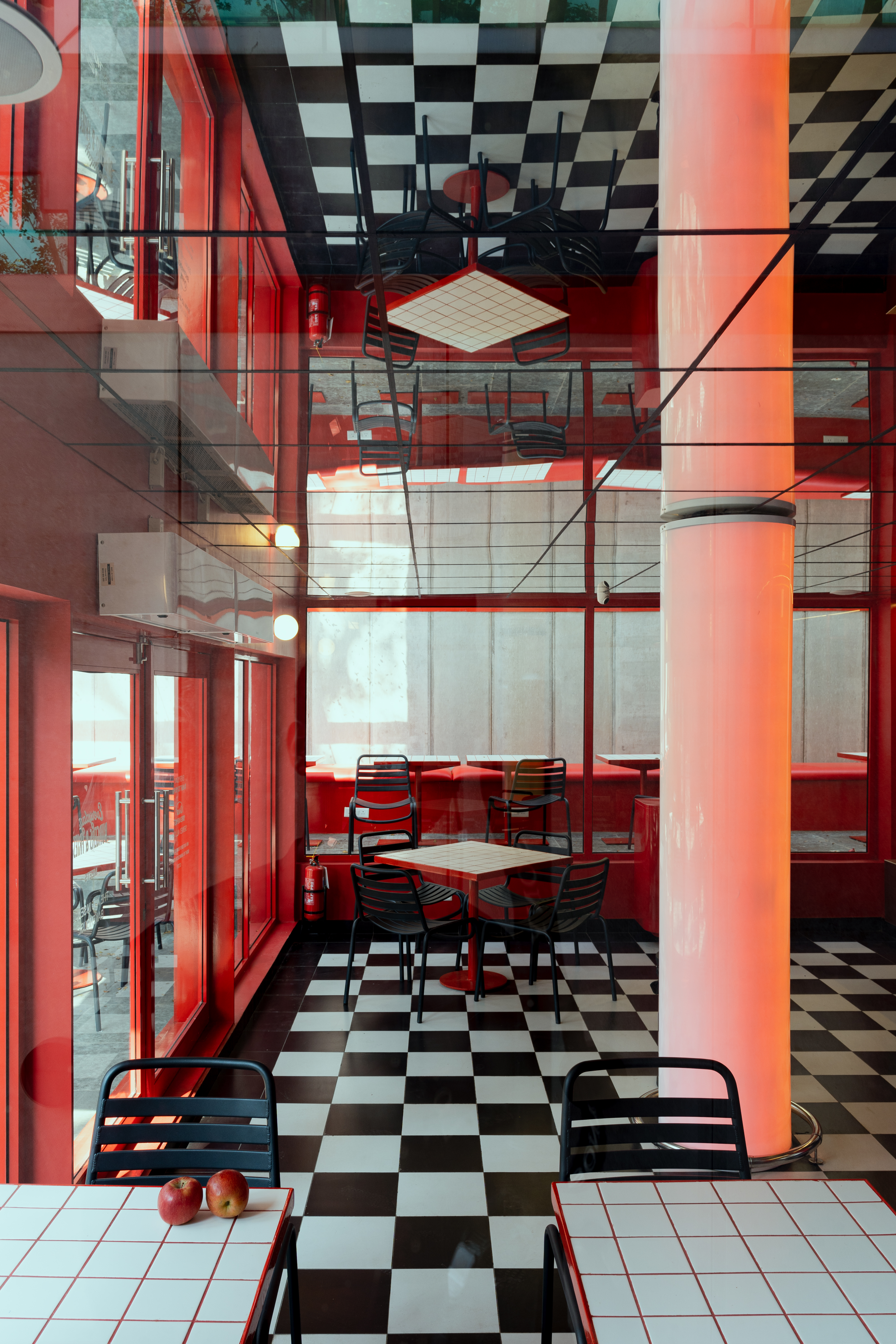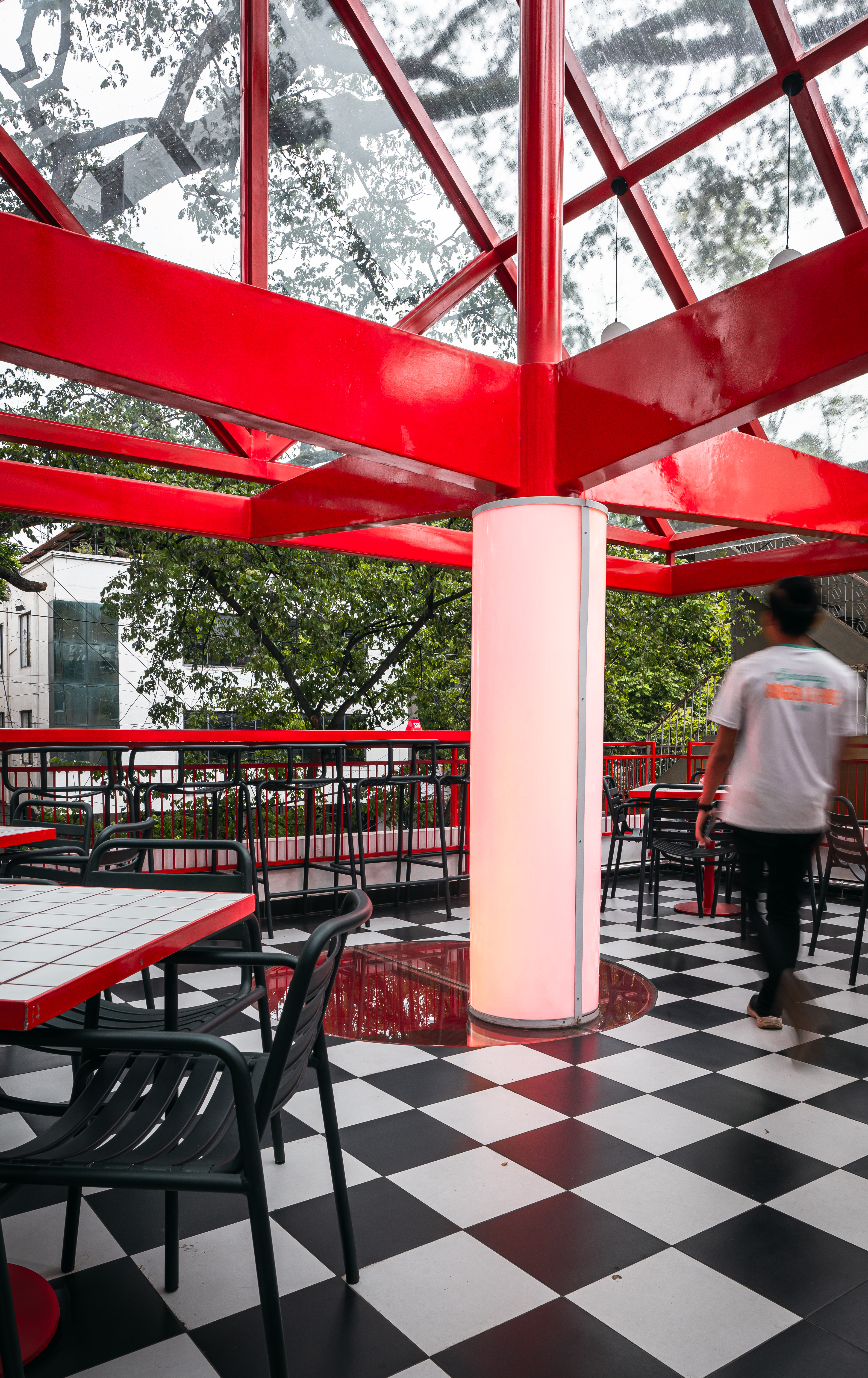 색감은 방갈로르의 활기찬 펍 문화를 연상시키며, 흑백 체커보드 타일은 미국식 다이너의 레트로 감성을 불러일으킨다. 한정된 면적 안에서도 소재를 조화롭게 배치해 개방감을 극대화했으며, 유리를 적극 활용해 실내와 실외가 자연스럽게 연결되도록 했다. 자연광은 건물의 가장 낮은 층까지 스며들어, 원래 어둡고 폐쇄적일 수 있는 공간을 환하게 비춘다. 지하층에서도 하늘을 바라볼 수 있도록 설계하여, 빛과 그림자가 시간에 따라 변화하는 과정을 경험할 수 있다.