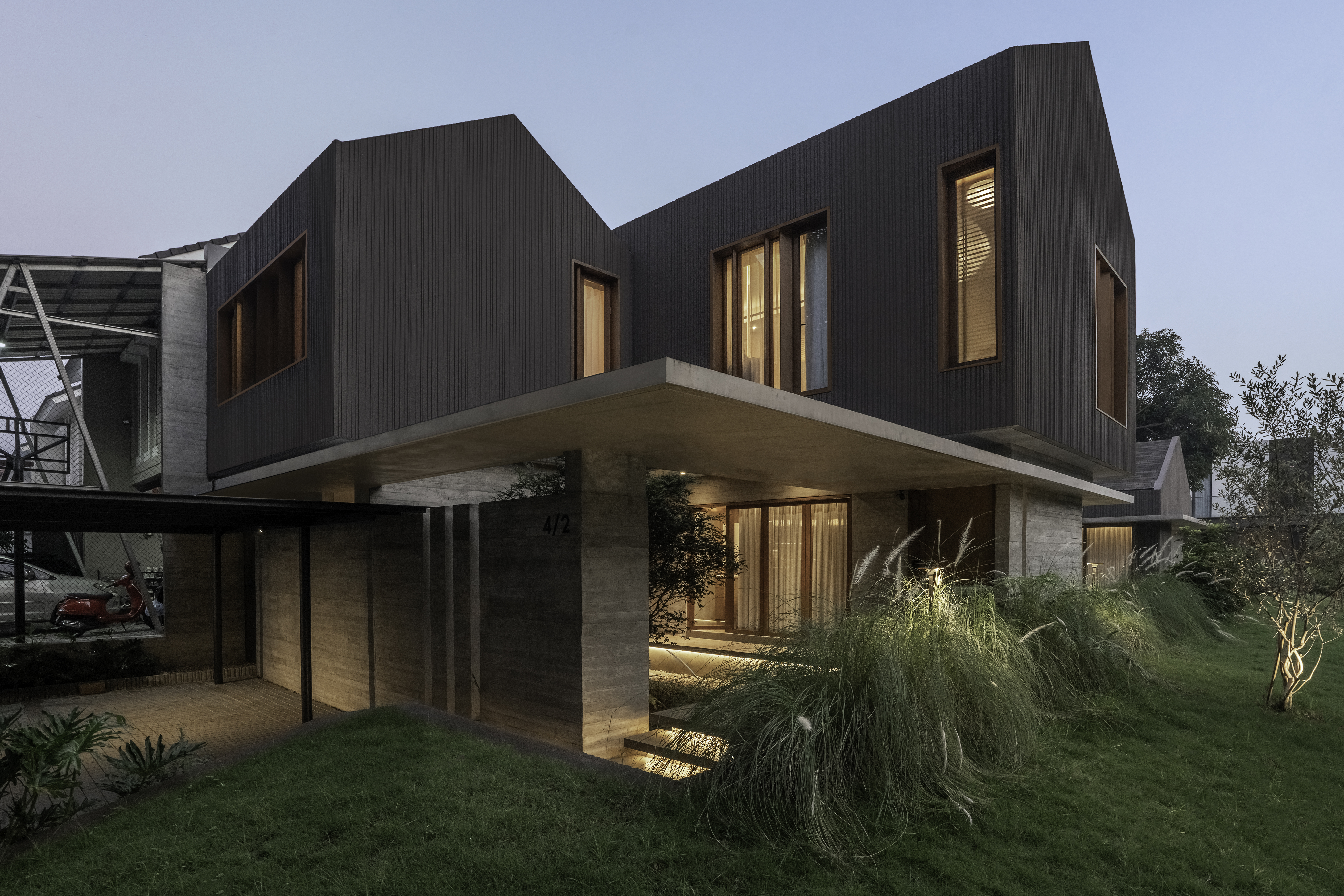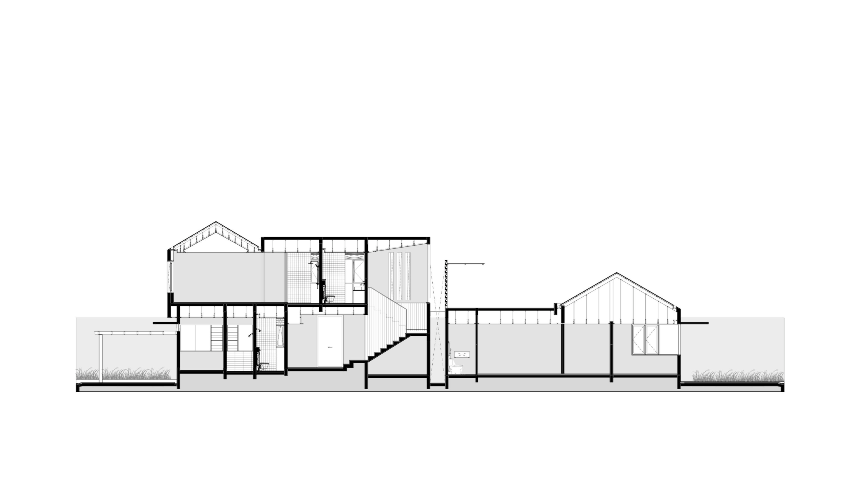 첫 번째 집은 가족 다섯 명을 위한 2층 규모의 주택인데, 각 세 개의 침실과 욕실, 홈오피스 그리고 공용 공간이 있다. 좁고 낮은 천장의 현관을 지나면 정원이 둘러싼 밝은 거실과 식당으로 이어진다. 실의 배치는 친밀한 모임을 유도하면서도 자연과의 연결을 유지하도록 설계되었다.