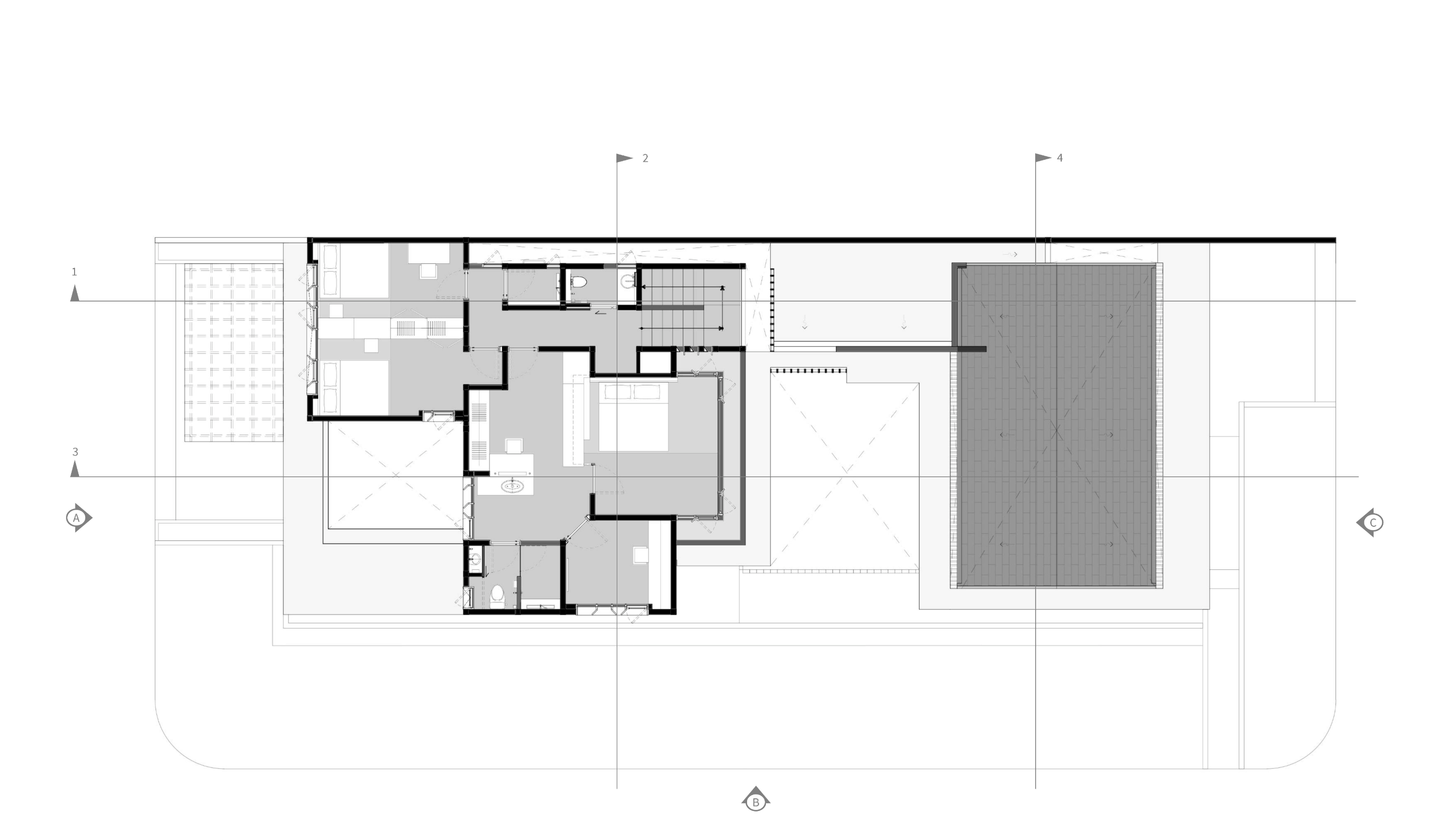 두 번째 집은 고령의 할머니를 위한 단층 구조로 계획되었다. 이 주택에는 두 개의 작은 침실, 두 개의 욕실, 간병인을 위한 방, 그리고 오픈된 거실-식당 공간이 있다. 입구까지 이어지는 철목 경사로와 중정은 열대 기후 속에서 햇볕을 즐기거나 비 소리를 들을 수 있는 평온한 공간을 만든다.