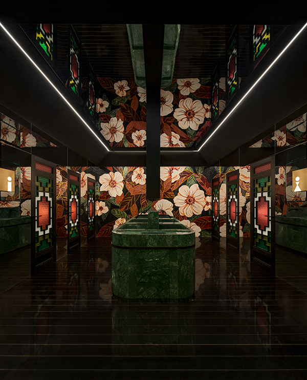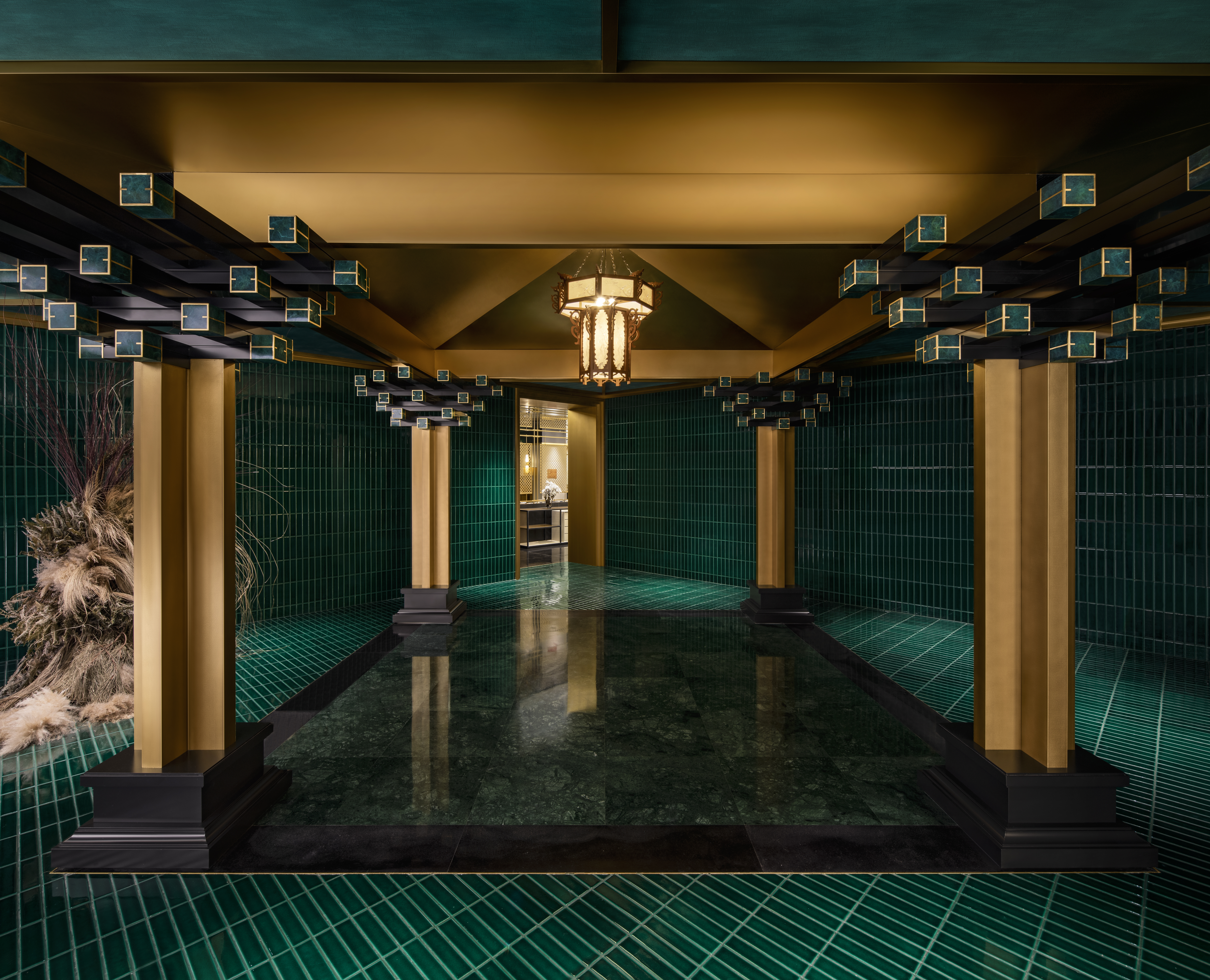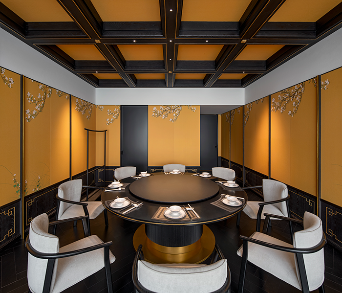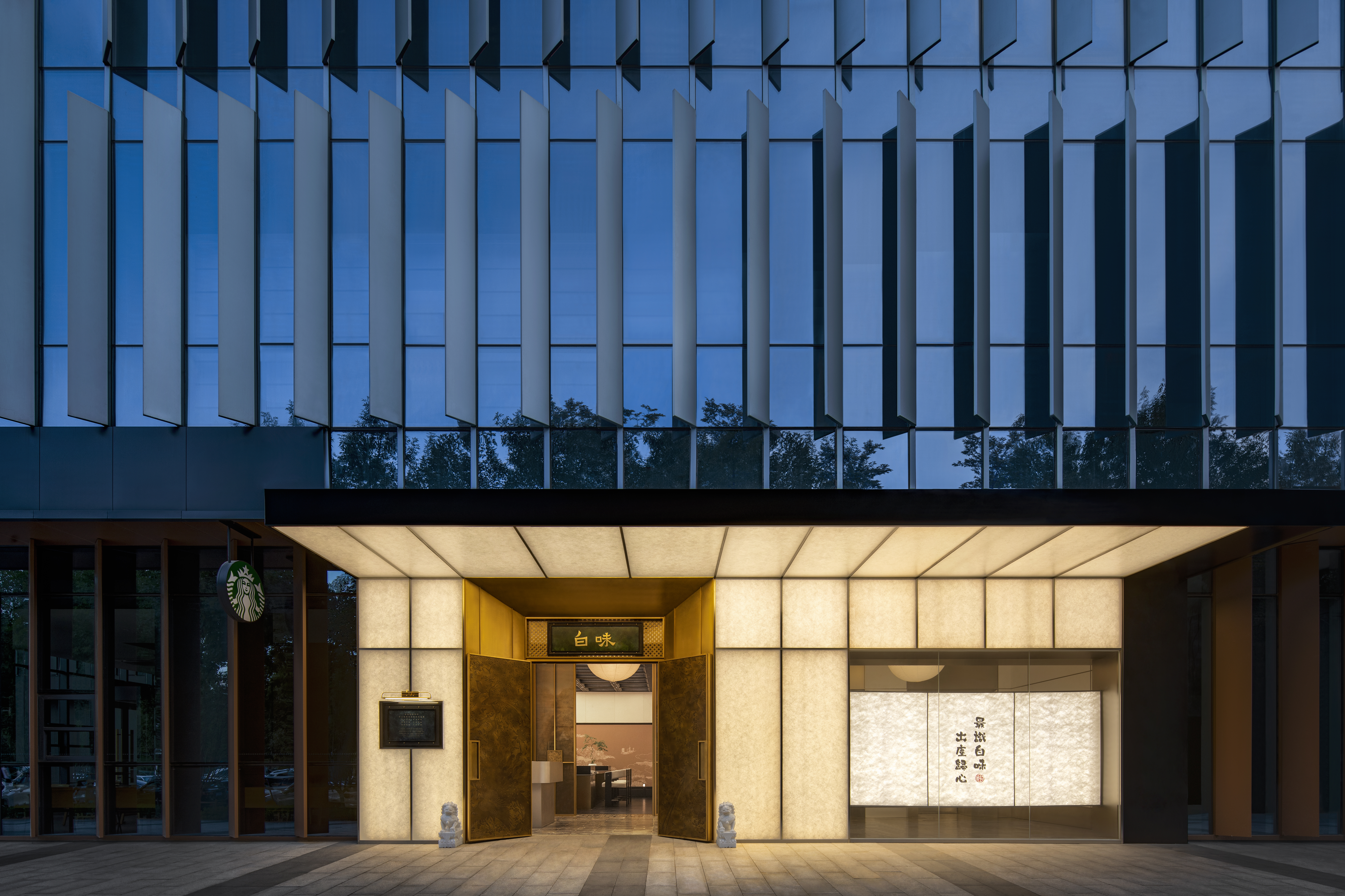 새벽을 연상시키는 파사드의 청동 간판과 차분한 골드 톤의 조명은 방문객을 환대하는 분위기를 연출한다. 밝은 흰색의 조명으로 연출한 1층의 로비는 하루 중 낮을 상징한다. 개방형 다이닝 공간은 중화풍의 금속 스크린을 세심하게 배치하여 각 좌석 사이의 공간을 분리하고 직원들의 이동과 연결성을 고려했다. 금속 스크린과 검정과 황금색의 장식 덮개는 황혼 시간대를 연상시키며 우아한 공간을 연출한다. 별도로 마련된 프라이빗 다이닝 공간은 구불구불한 통로를 통해 접근 수 있는 사적인 공간에 자리 잡고 있다. 각 공간은 고휘도의 색상 팔레트를 통해 중국 전통의 미학을 적용했다. 꽃과 새, 자연이 담긴 벽지는 중국 전통의 정원과 자연 풍경을 연상시키며 각각의 프라이빗 다이닝 공간마다 독특한 분위기를 연출한다.