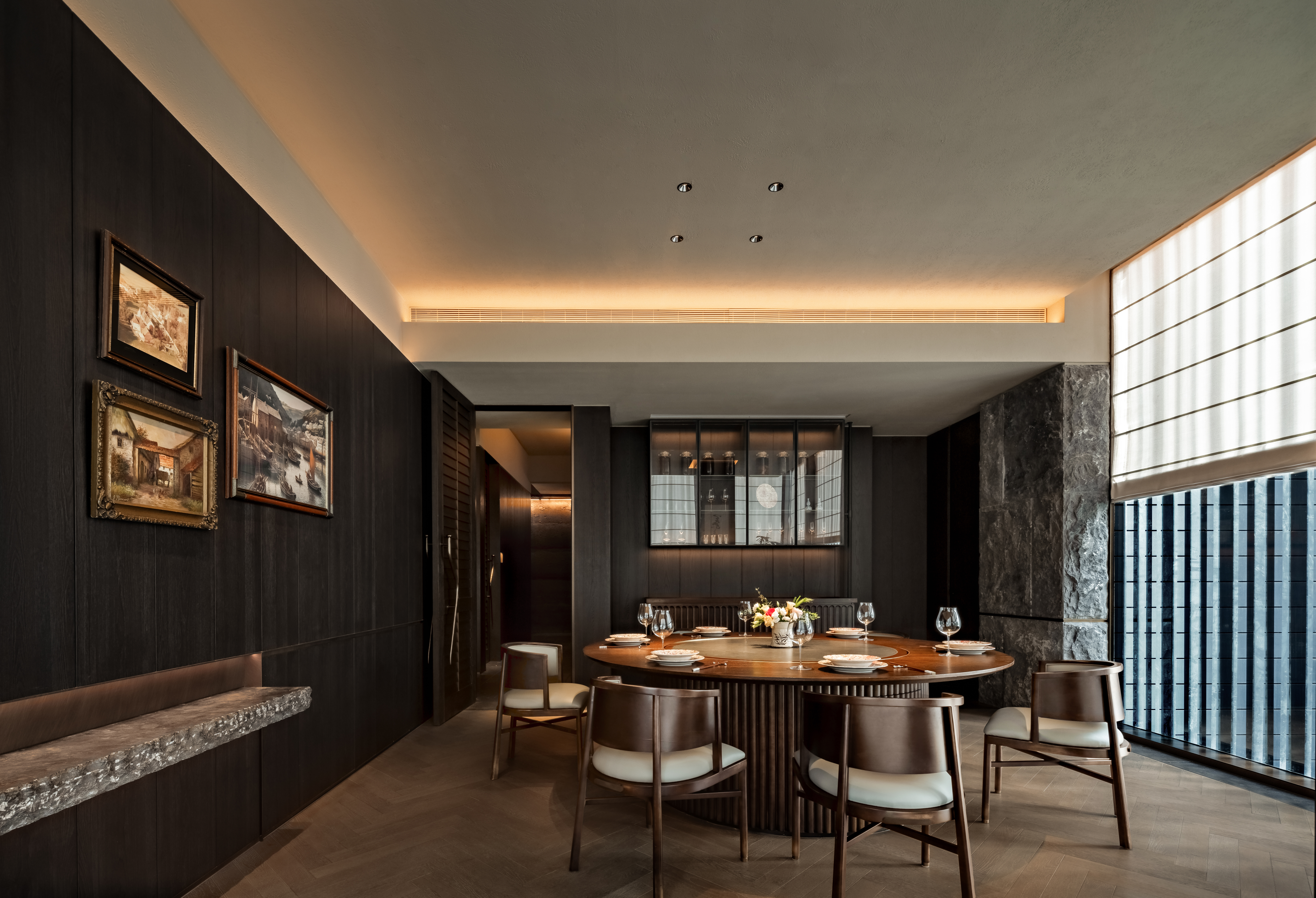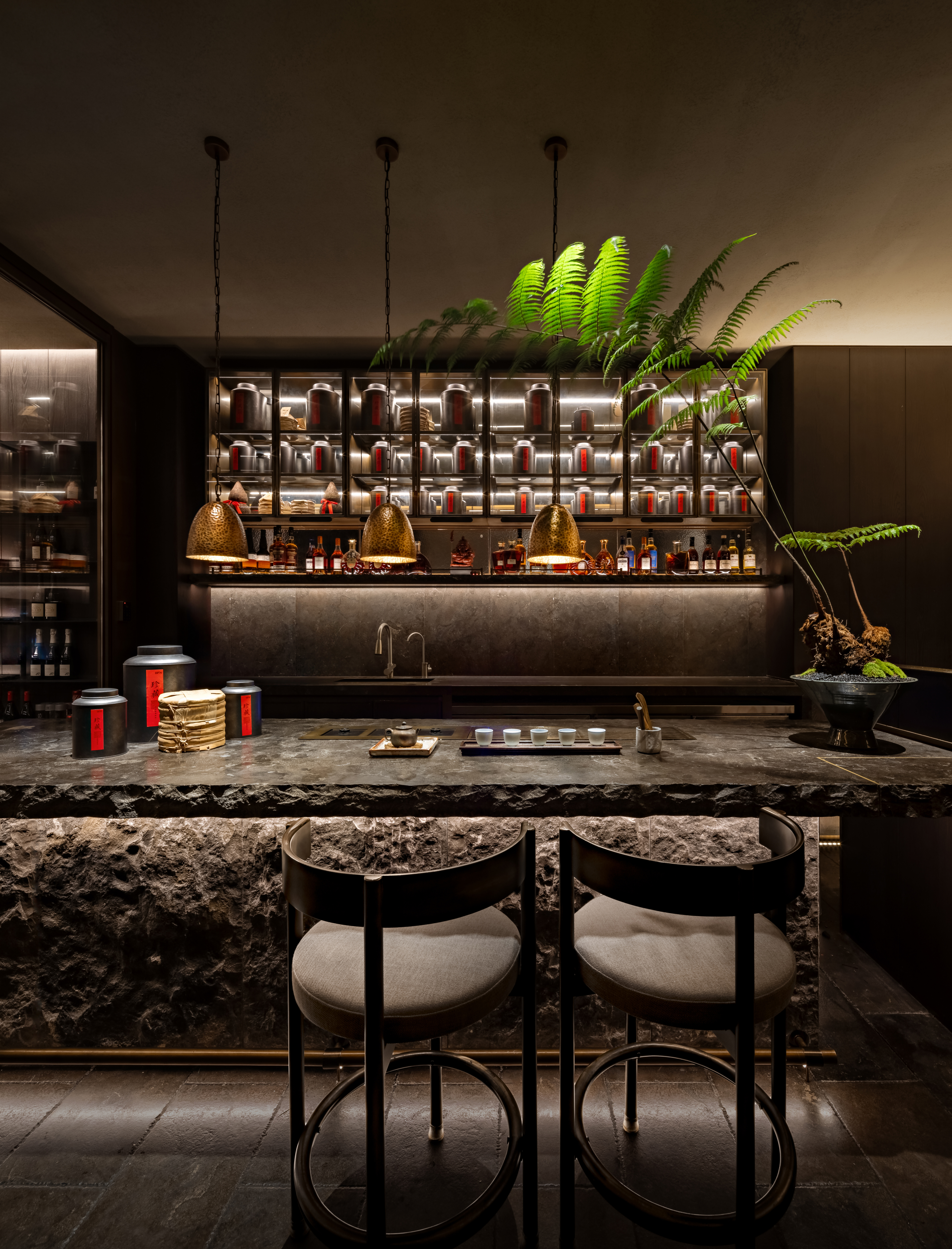 입구에서는 윈난 식재료 시장을 연상시키는 공간이 방문객을 맞이하며, 러프한 석재 바와 차 테이블이 윈난의 자연과 차 문화를 담아낸다. 다이닝 공간은 거친 질감의 마감재와 목조 구조가 조화를 이루며, 아늑하면서도 개방적인 분위기를 형성한다.