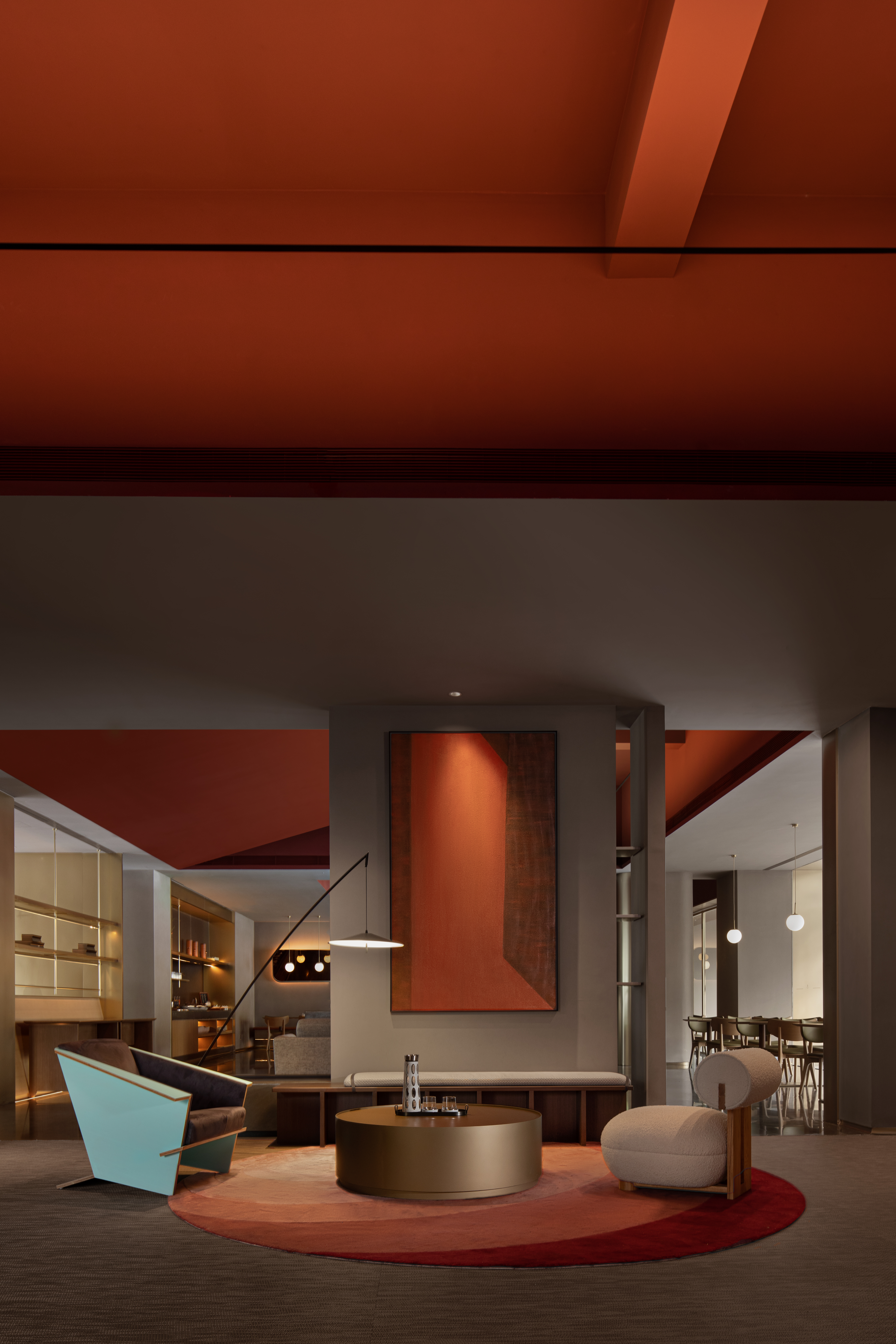 이번 리노베이션의 또 다른 핵심 요소는 젊고 활기찬 분위기를 조성하는 것이었다. 1층 로비와 레스토랑은 오렌지색 지붕과 LED 조명을 활용해 강렬한 인상을 남기며, 호텔의 트렌디한 브랜드 정체성을 강조했다. 또한, 2층에는 넓은 공용 라운지를 마련해 출장객과 여행자들이 휴식을 취할 수 있는 공간을 제공하고, 지역 커뮤니티와 교류할 수 있도록 했다. 바닥부터 천장까지 이어지는 대형 창문을 통해 도시와 자연스럽게 연결되도록 하였으며, 내부 공간에서는 나뭇그늘과 반사된 도시 풍경이 조화를 이루는 독특한 디자인을 적용했다.