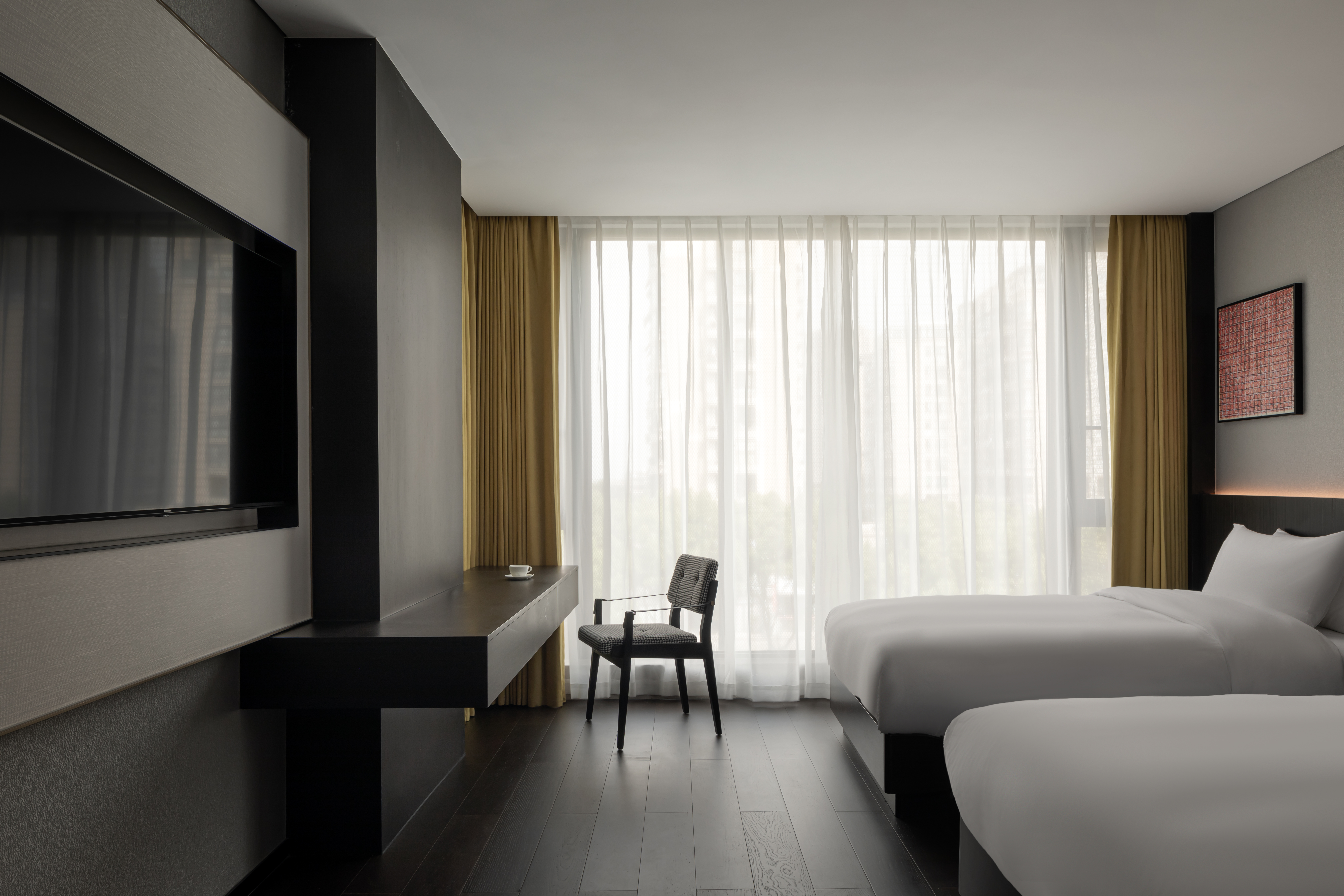 객실 디자인은 휴식과 예술성을 동시에 고려하여, 어두운 월넛 소재와 베이지 톤의 패브릭을 조합해 아늑한 분위기를 연출했다. 여기에 황동 장식을 더해 미적 가치를 높이고, 비즈니스 호텔의 세련미와 가정적인 따뜻함을 동시에 구현했다. 또한, 공용 공간과 객실 간의 디자인 언어를 일관되게 유지해 전체적인 호텔 분위기가 자연스럽게 연결되도록 했다.
