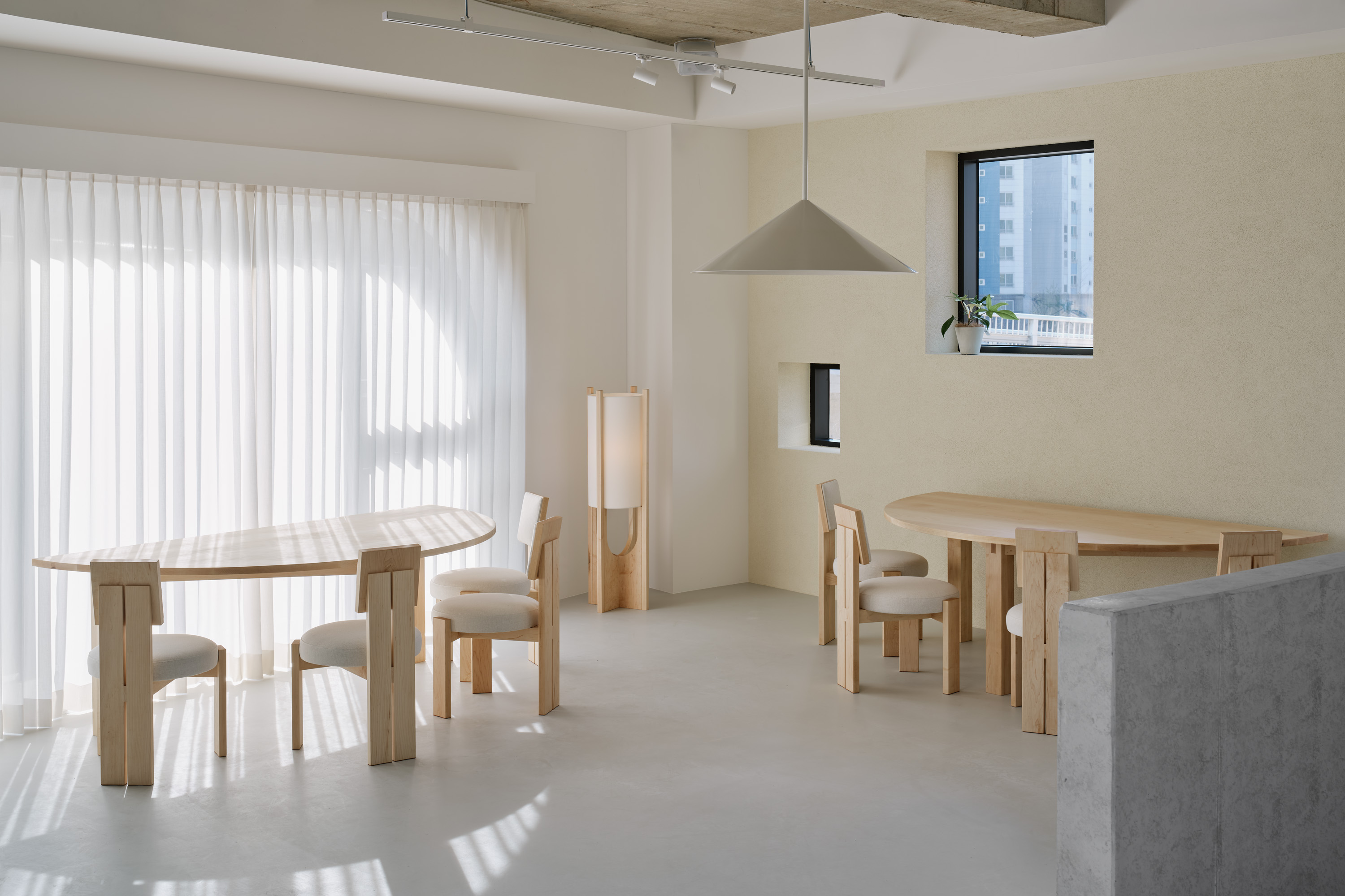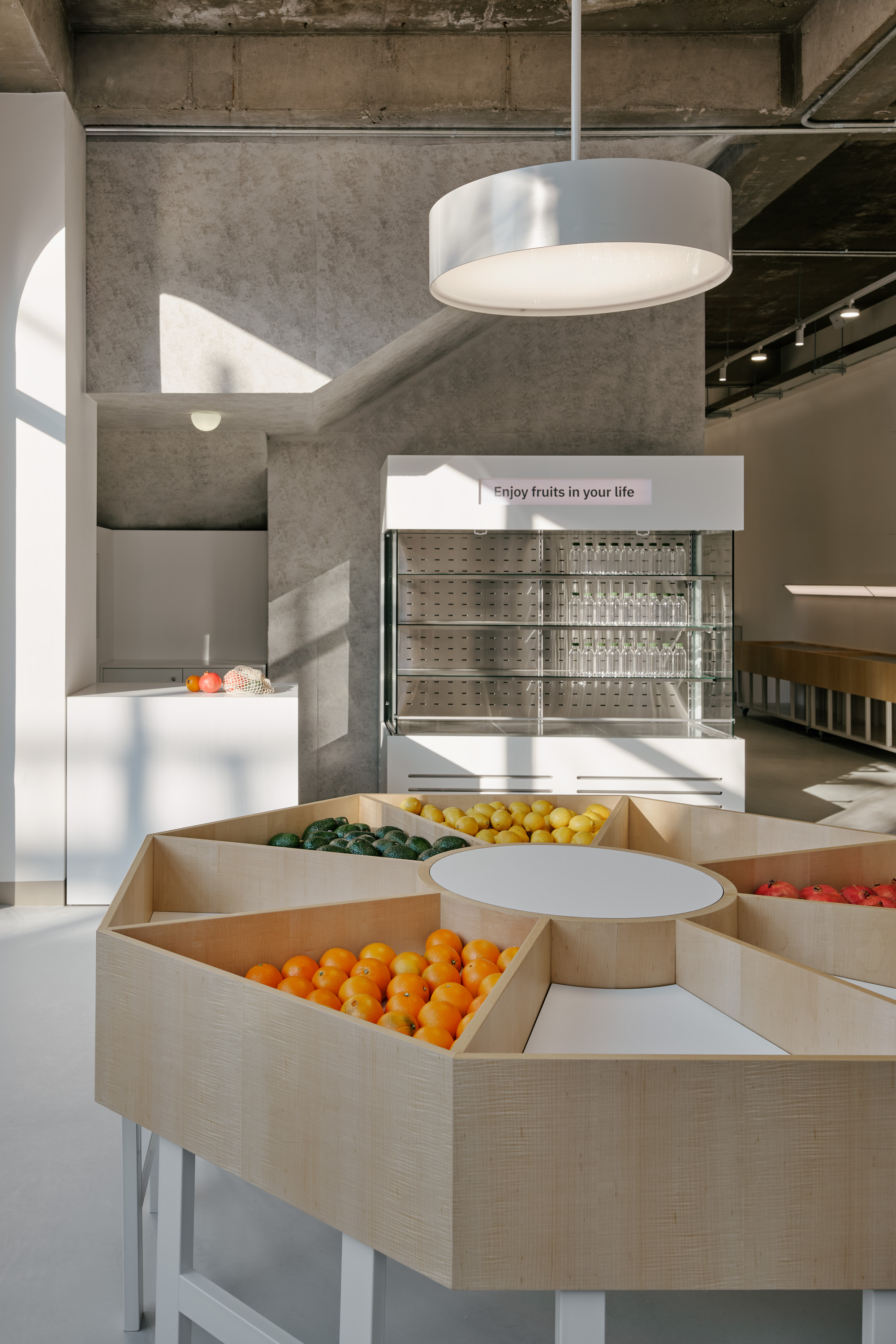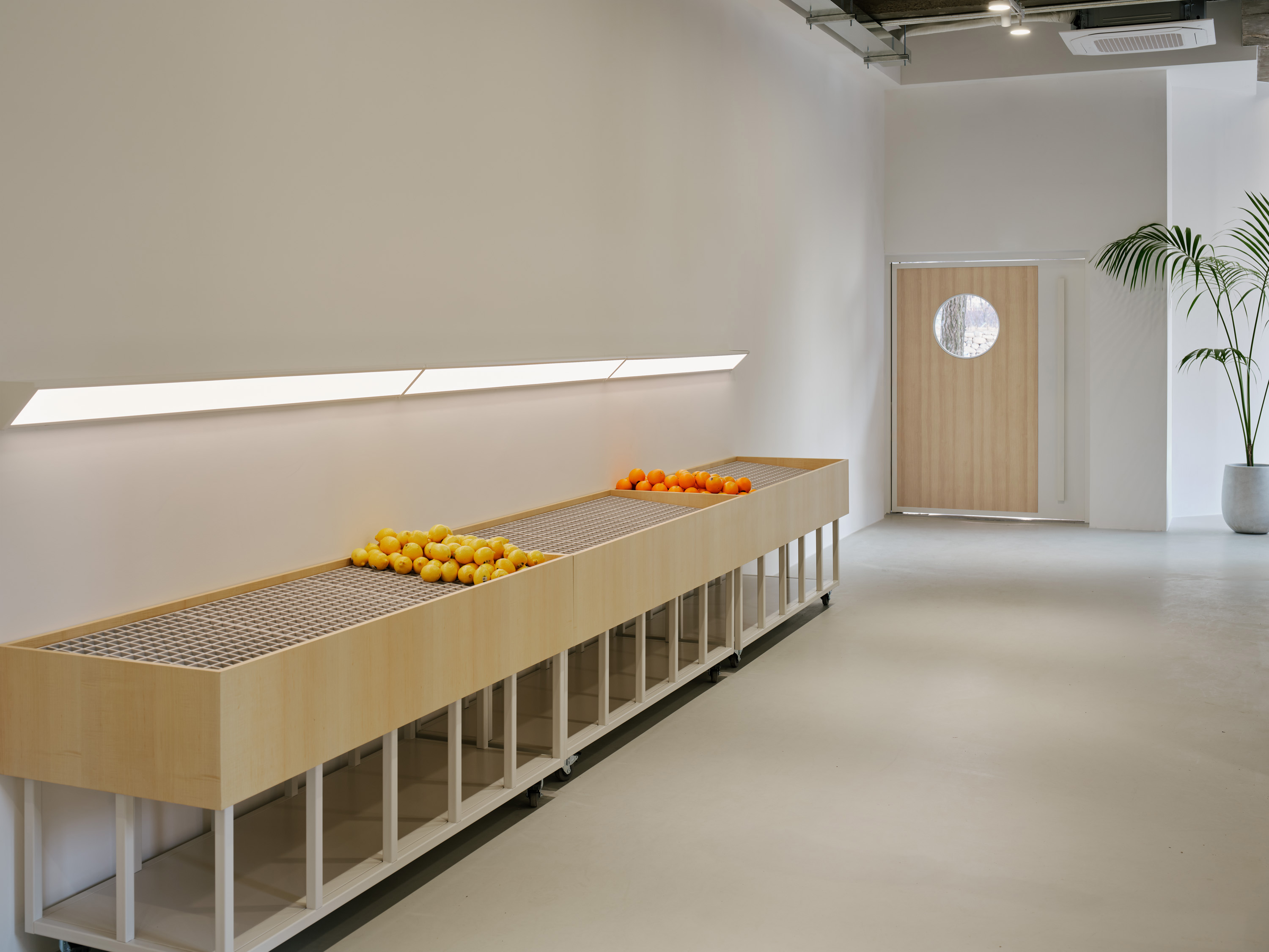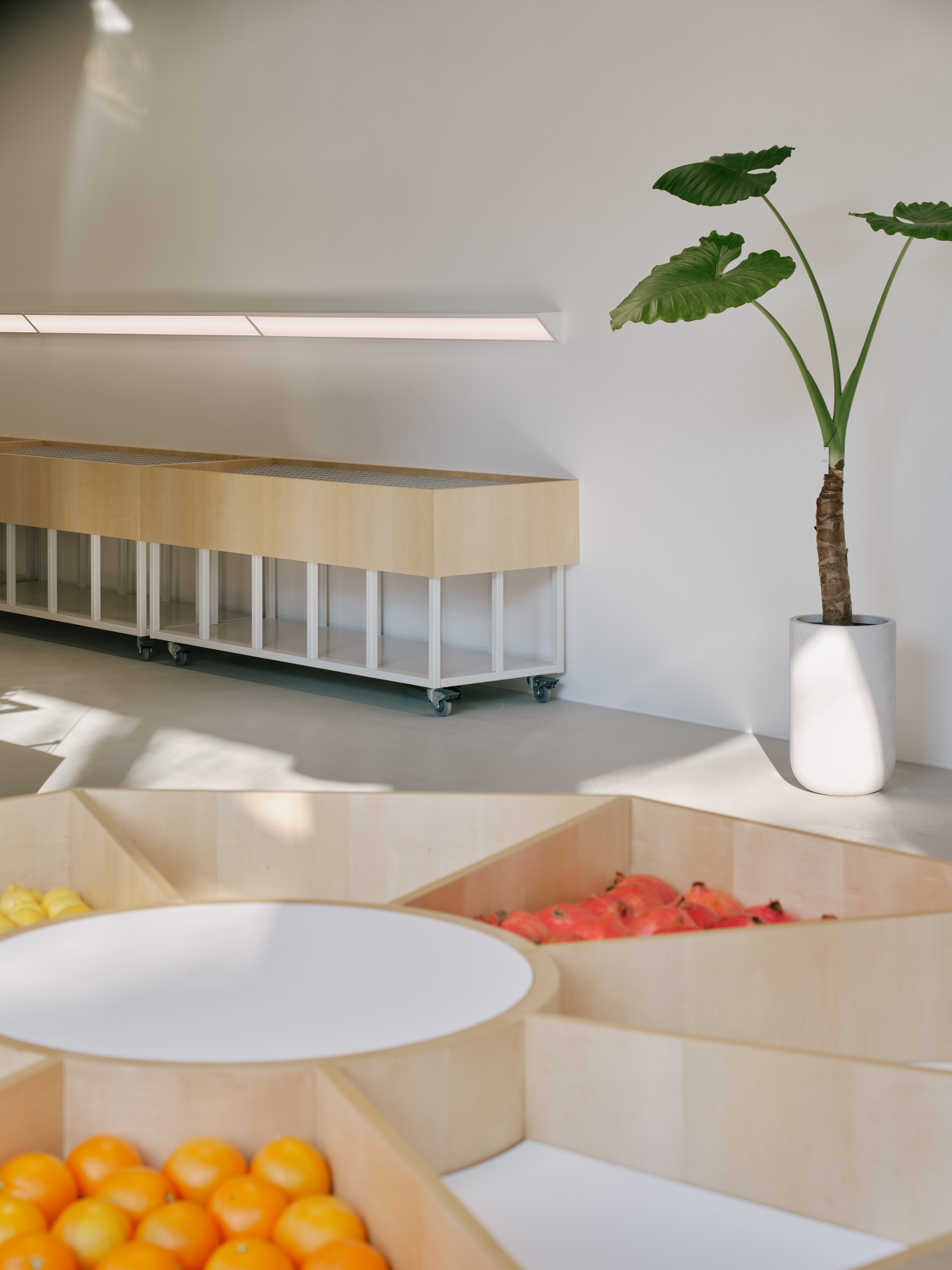 이를 위해 기존의 콘크리트 마감 면을 최대한 살리되 공간의 주재료인 메이플 원목이 시각적, 정서적 균형을 이루도록 계획하였다. 이는 형형색색의 과일들이 비치되었을 때 비로소 그 감각을 전달한다. 이러한 연결성은 1층뿐만 아니라 위층까지 이어진다. 곳곳에 배치된 각기 다른 크기의 식물들이 과일을 대신해 그 균형을 유지하며, 공간 안에 약간의 온기와 질감을 더하도록 기획하였다.