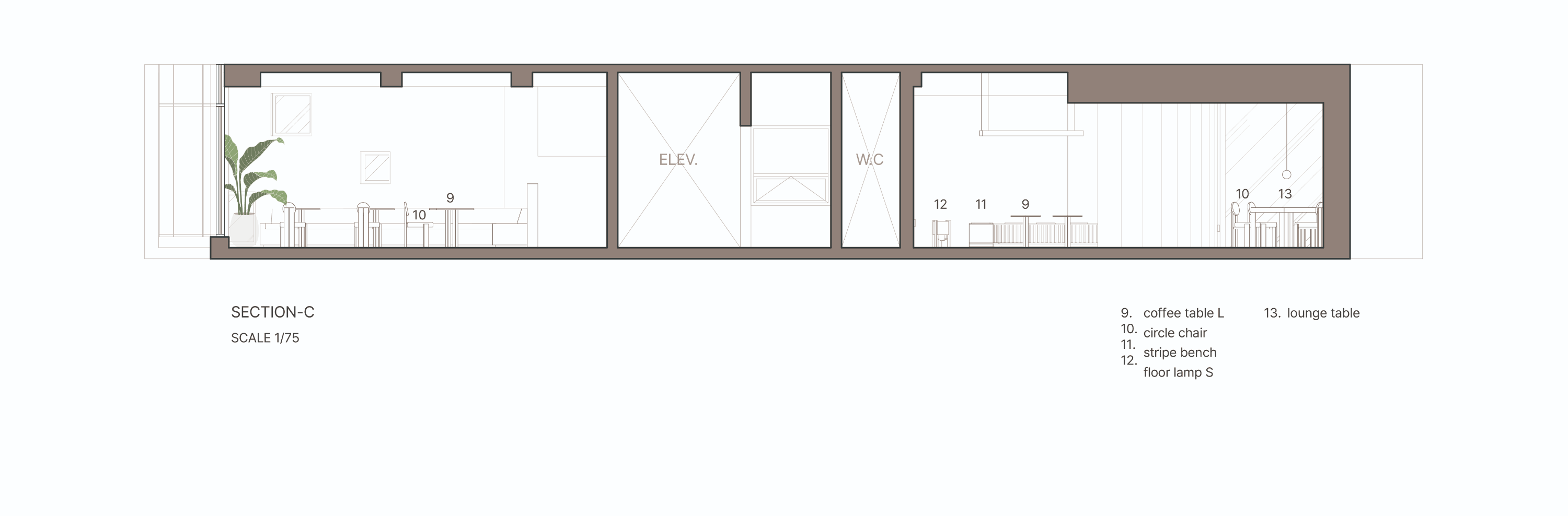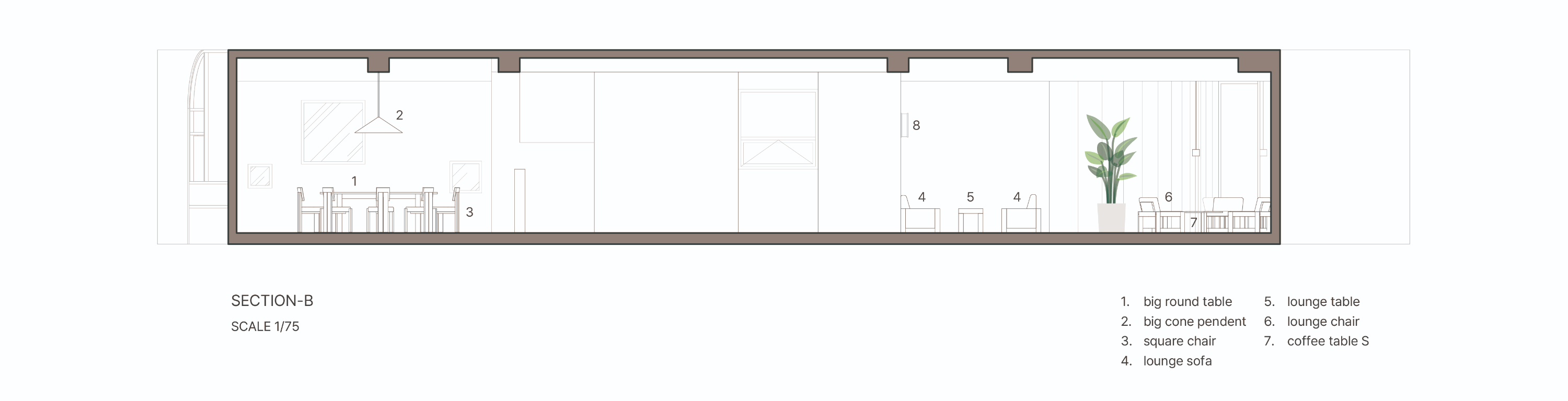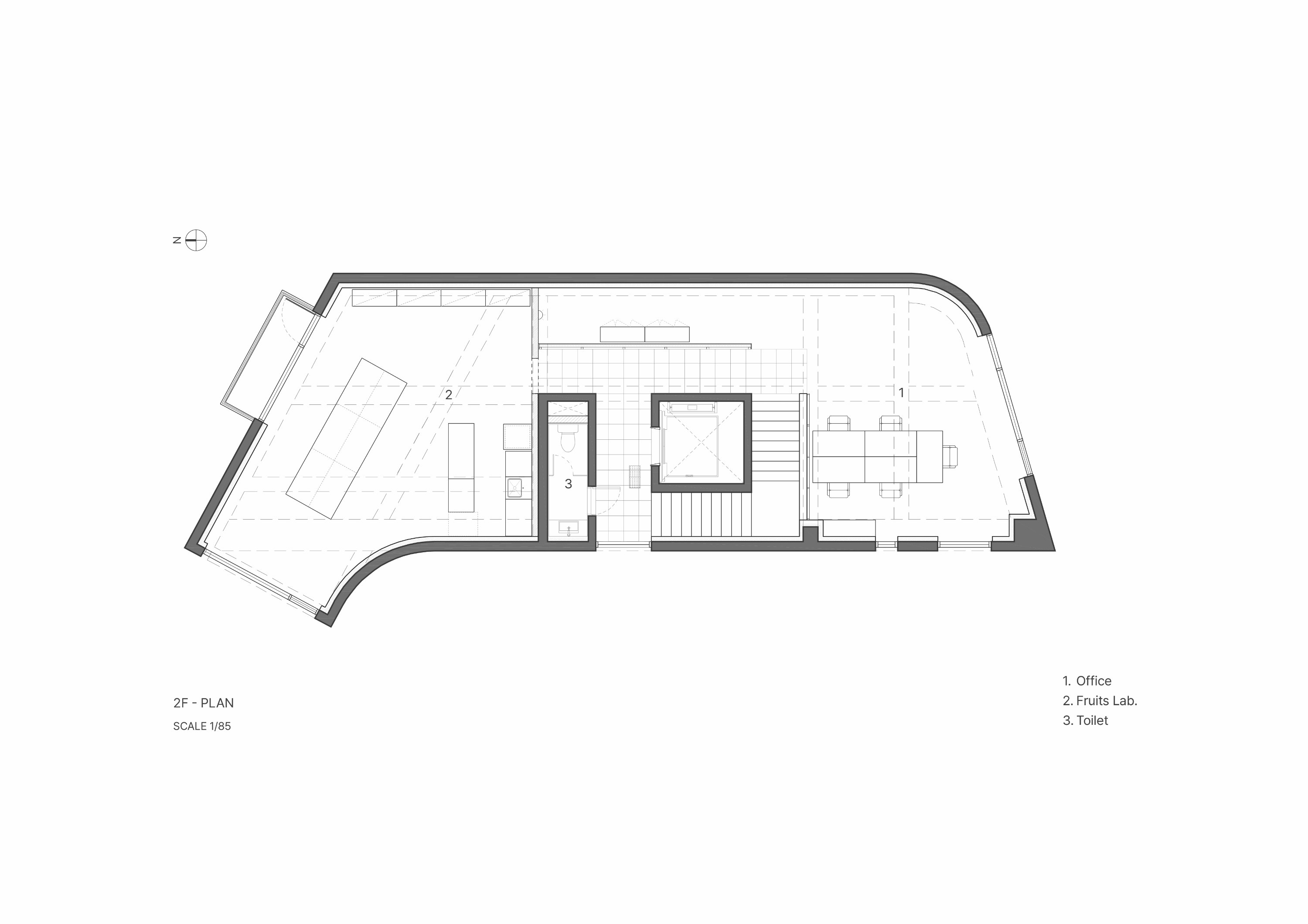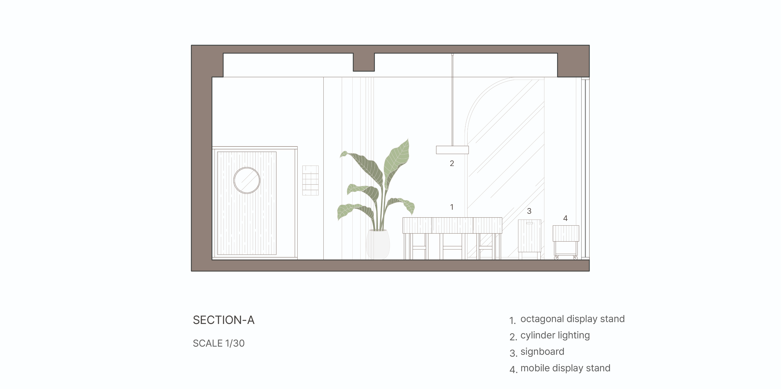 이를 위해 기존의 콘크리트 마감 면을 최대한 살리되 공간의 주재료인 메이플 원목이 시각적, 정서적 균형을 이루도록 계획하였다. 이는 형형색색의 과일들이 비치되었을 때 비로소 그 감각을 전달한다. 이러한 연결성은 1층뿐만 아니라 위층까지 이어진다. 곳곳에 배치된 각기 다른 크기의 식물들이 과일을 대신해 그 균형을 유지하며, 공간 안에 약간의 온기와 질감을 더하도록 기획하였다.