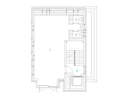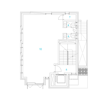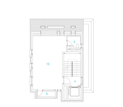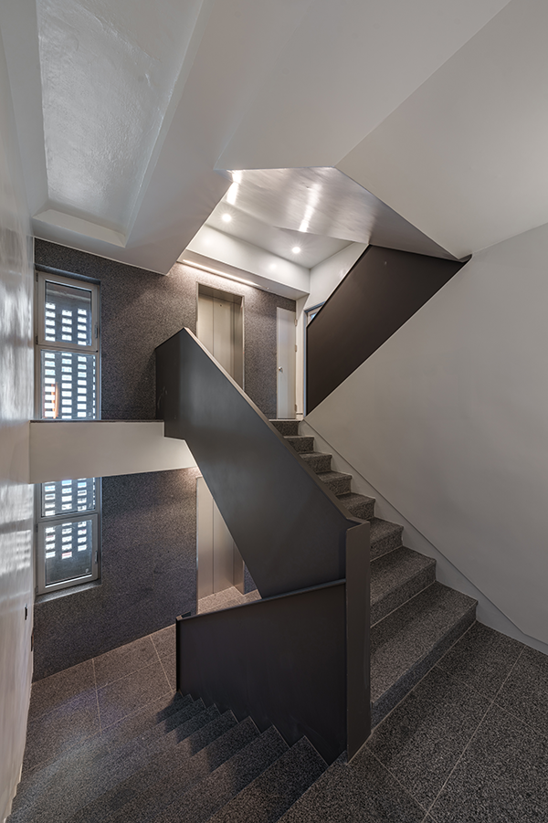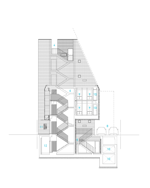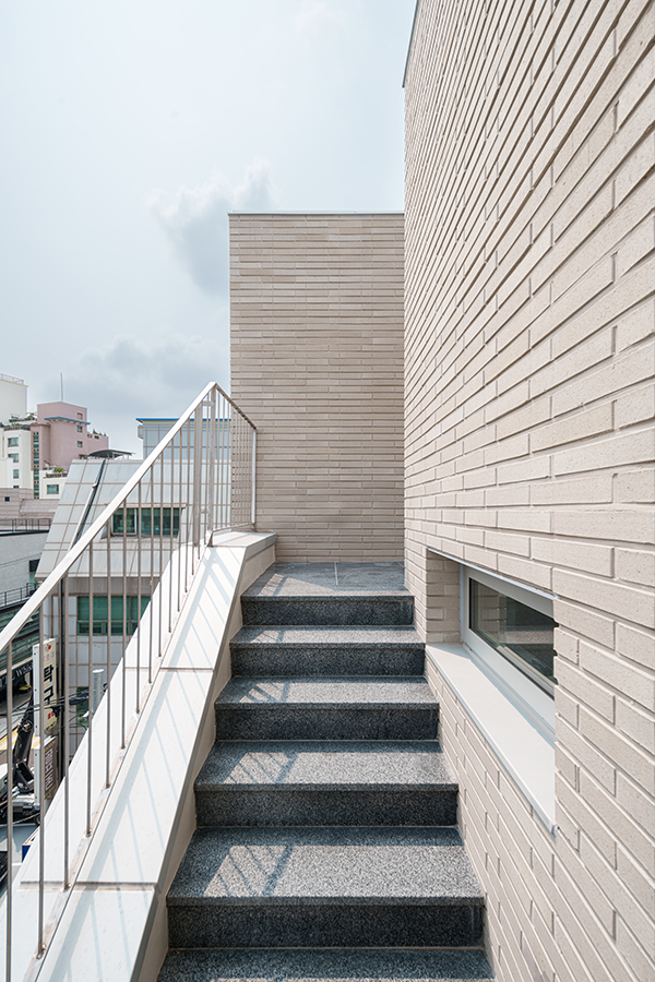 발코니 없이 매끈한 경사면을 가진 후면은 건축물을 하나의 응집된 매스로 강조한다. 정북 일조 제한선에 의해 만들어진 사선면은 치장벽돌 켜 들여쌓기를 통해 단일한 건축재료가 주는 단아함을 더했다. 5층 테라스와 옥상층은 대지의 서측 방향으로 개방되어, 응집된 건축물에서 외부와 마주할 수 있는 장치다.