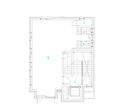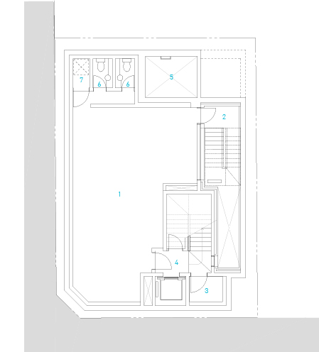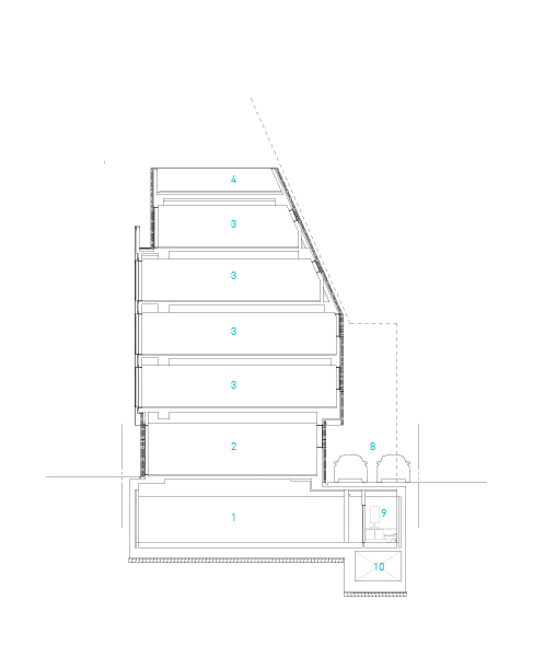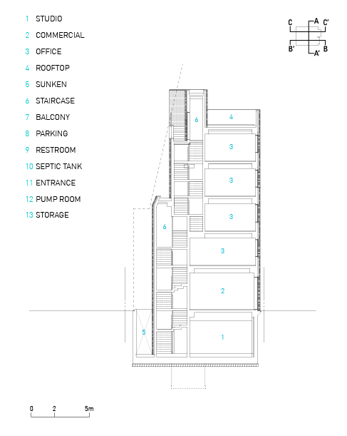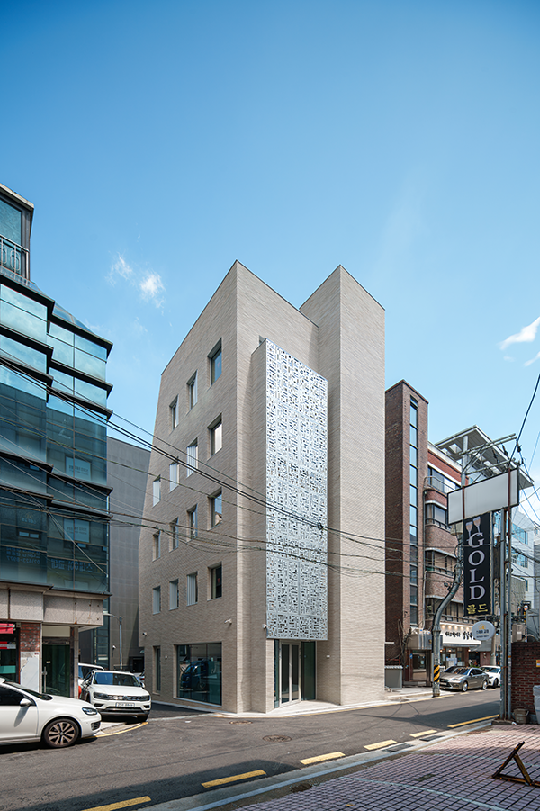 발코니 없이 매끈한 경사면을 가진 후면은 건축물을 하나의 응집된 매스로 강조한다. 정북 일조 제한선에 의해 만들어진 사선면은 치장벽돌 켜 들여쌓기를 통해 단일한 건축재료가 주는 단아함을 더했다. 5층 테라스와 옥상층은 대지의 서측 방향으로 개방되어, 응집된 건축물에서 외부와 마주할 수 있는 장치다.