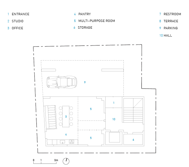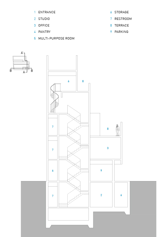 일조권 사선제한으로 매스가 층마다 셋백이 되는데, 이로 인해 생기는 부분에는 옥외 테라스가 만들어졌다. 북측 진입도로에서 사람과 차량이 출입 되어야하므로, 1층의 북측에 필로티와 외부 주차 공간을 계획했다. 지하 1층과 지상 1, 2층은 스튜디오 및 스튜디오 사무실로, 3층부터 5층은 근린생활시설로 사용된다. 작은 건물이지만 각 층마다 옥외 공간이 있어서 다양한 용도로 사용할 수 있다.