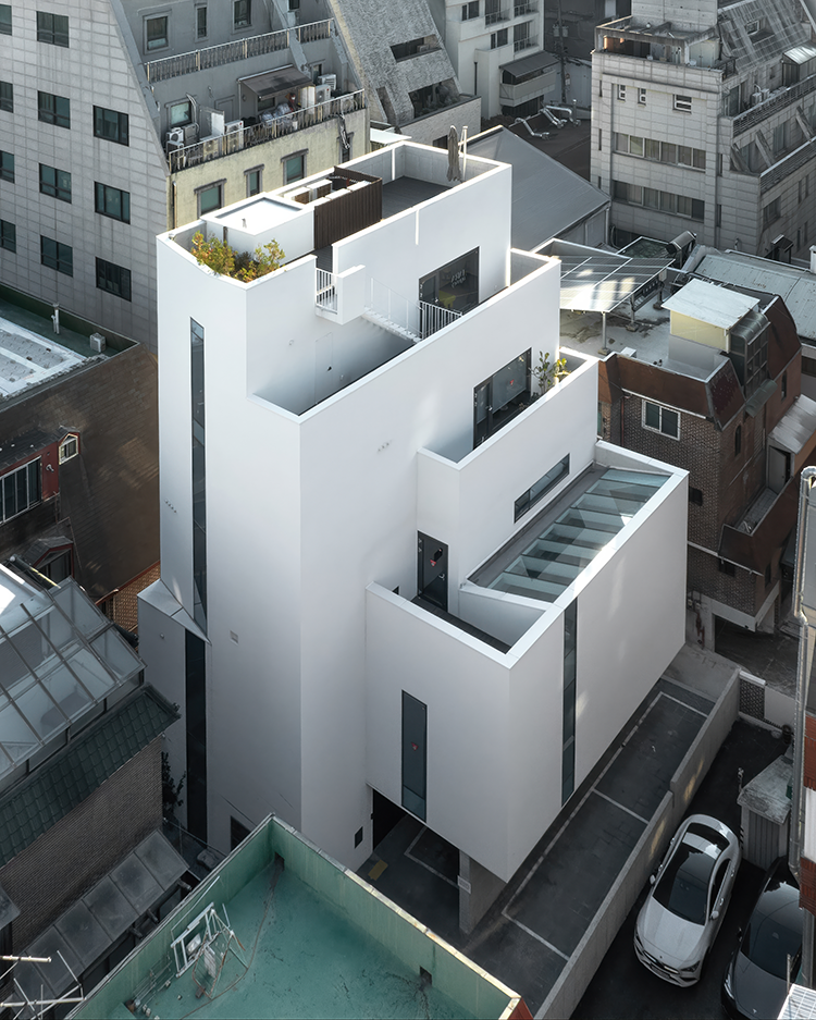 5층 옥외 테라스를 통해 올라가는 건물 위 옥상 공간은 작지만 다양한 디자인 요소들로 구성되었다. 도로 측에서 보이는 북측 입면은 가장 중요한 요소로, 도로 측에서 창문이 거의 보이지 않고 흰색 매스만 보이도록 계획했다. 일반적인 근린생활시설과는 다른, 주변과 차별되는 새로운 입면으로 디자인하여 기존 환경의 낙후된 분위기를 쇄신하고자 했다. 북측에 있는 창문이 도로 측에서 보이지 않도록 옥외 파라펫의 높이를 1.5~1.8m로 계획했다.