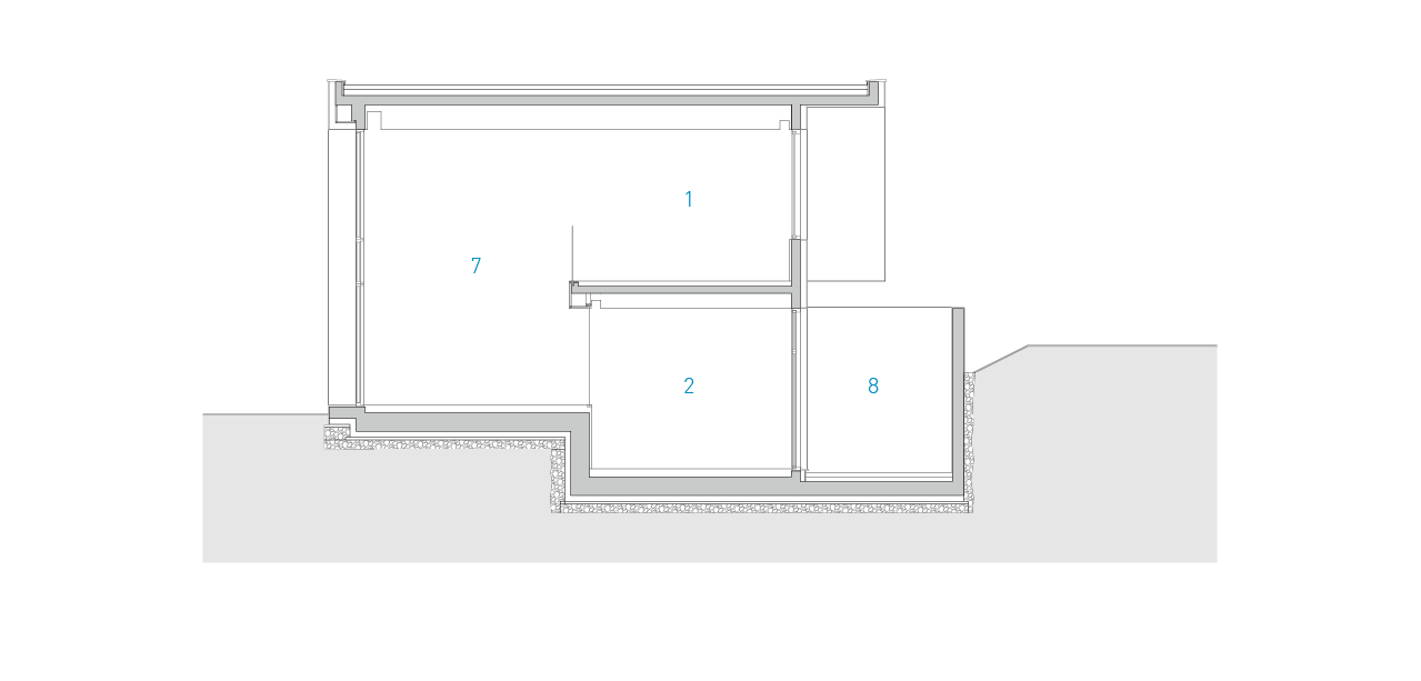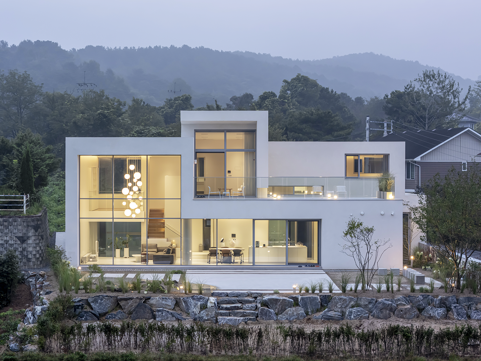 주택 외부에서 바라보면 담장 때문에 금강이 보이지 않지만, 실내에서는 취미실, 서재, 안방에서 다양한 방식으로 금강을 바라볼 수 있다. 메탈 페브릭을 활용하여 만든 담장 안쪽의 중정에는 대청마루가 마련되어 있어 일광을 즐길 수 있다. 투시성이 있는 메탈 패브릭의 담장은 이웃과 소통을 유도하는 요소다. 거실은 수직적인 볼륨을 최대로 활용하여 금강 조경을 최대한 누릴 수 있다. 거실은 주택 내 모든 공간과 유기적으로 연결된다. 거실과 연결된 앞마당은 계절의 변화를 느낄 수 있는 식재로 조성되어 있어, 내부와 외부를 적극적으로 확장하고 자연과의 소통이 가능하다. 스킵플로어로 형성된 서재와 취미실은 거실과 연계하여 배치됐다. 오픈 공간인 서재는 창 너머의 금강을 바라볼 수 있다. 2층은 1층과 달리 가족 구성원이 쉴 수 있는 프라이빗한 공간으로 계획되어 있다. 자녀방과 화장실은 필요시 중문을 닫아 프라이버시를 확보할 수 있다. 안방과 드레스룸 사이는 외부에서 보이지 않도록 발치에 창을 두어 외부에서의 시선을 차단하고, 빛의 명암의 대비를 통해 은은한 공간을 연출한다.