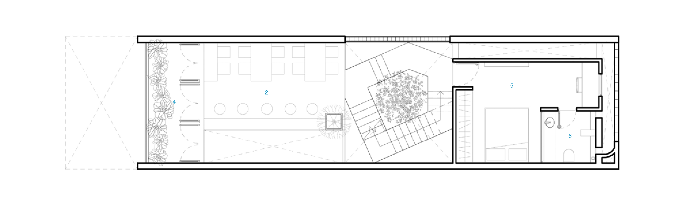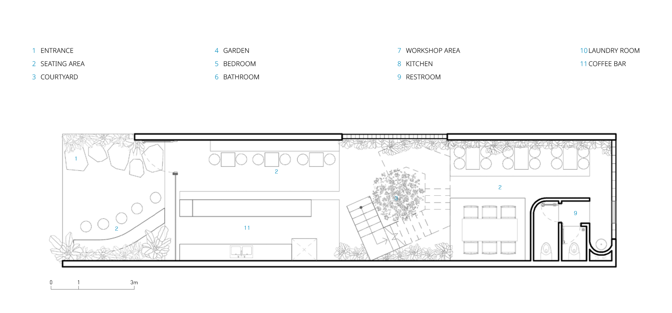 순환 동선이 마련되어 있으며, 이를 통해 빛과 그림자, 공기의 움직임, 녹음과 그늘이 어우러진 카페 공간이 됐다.
