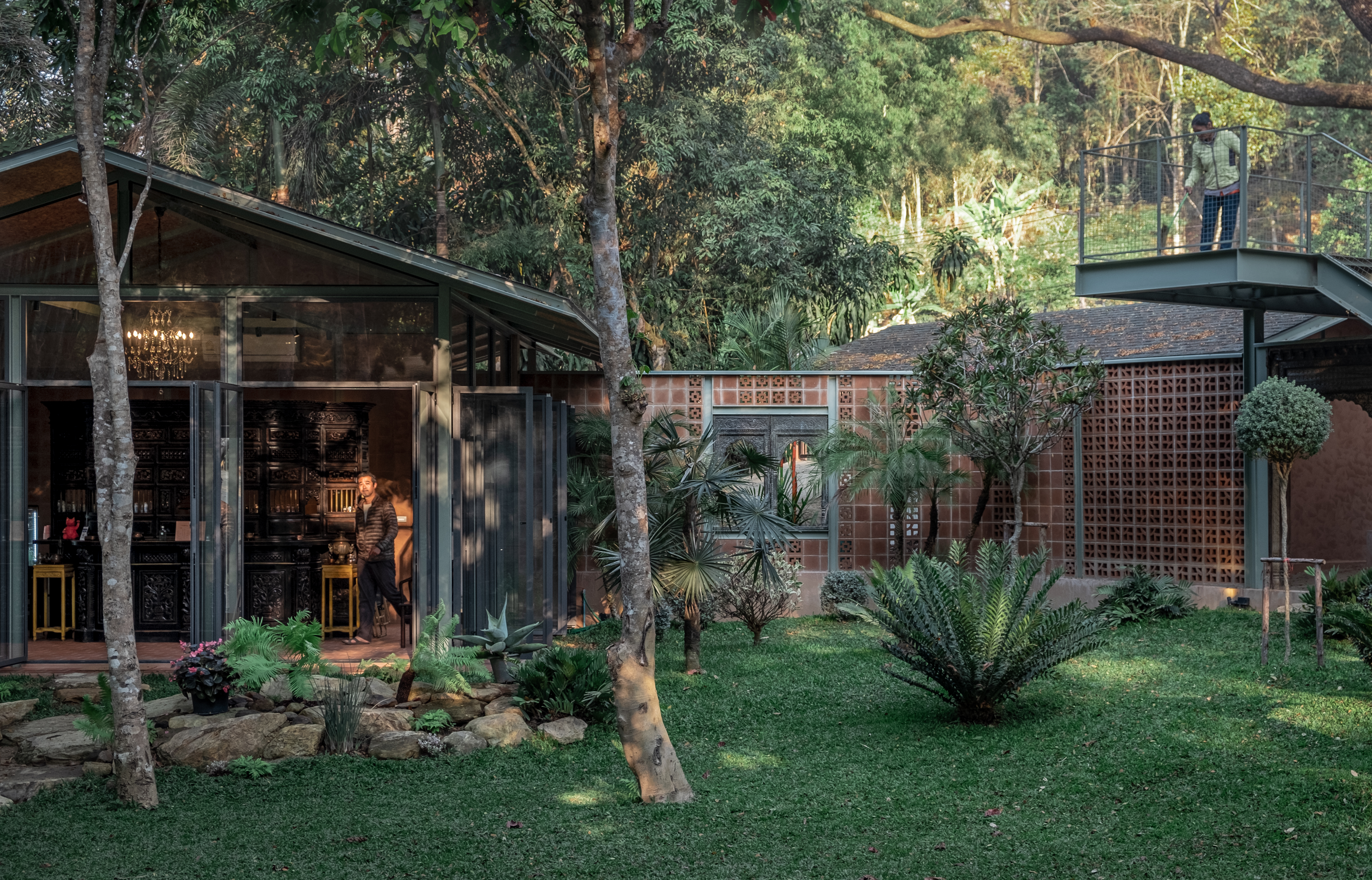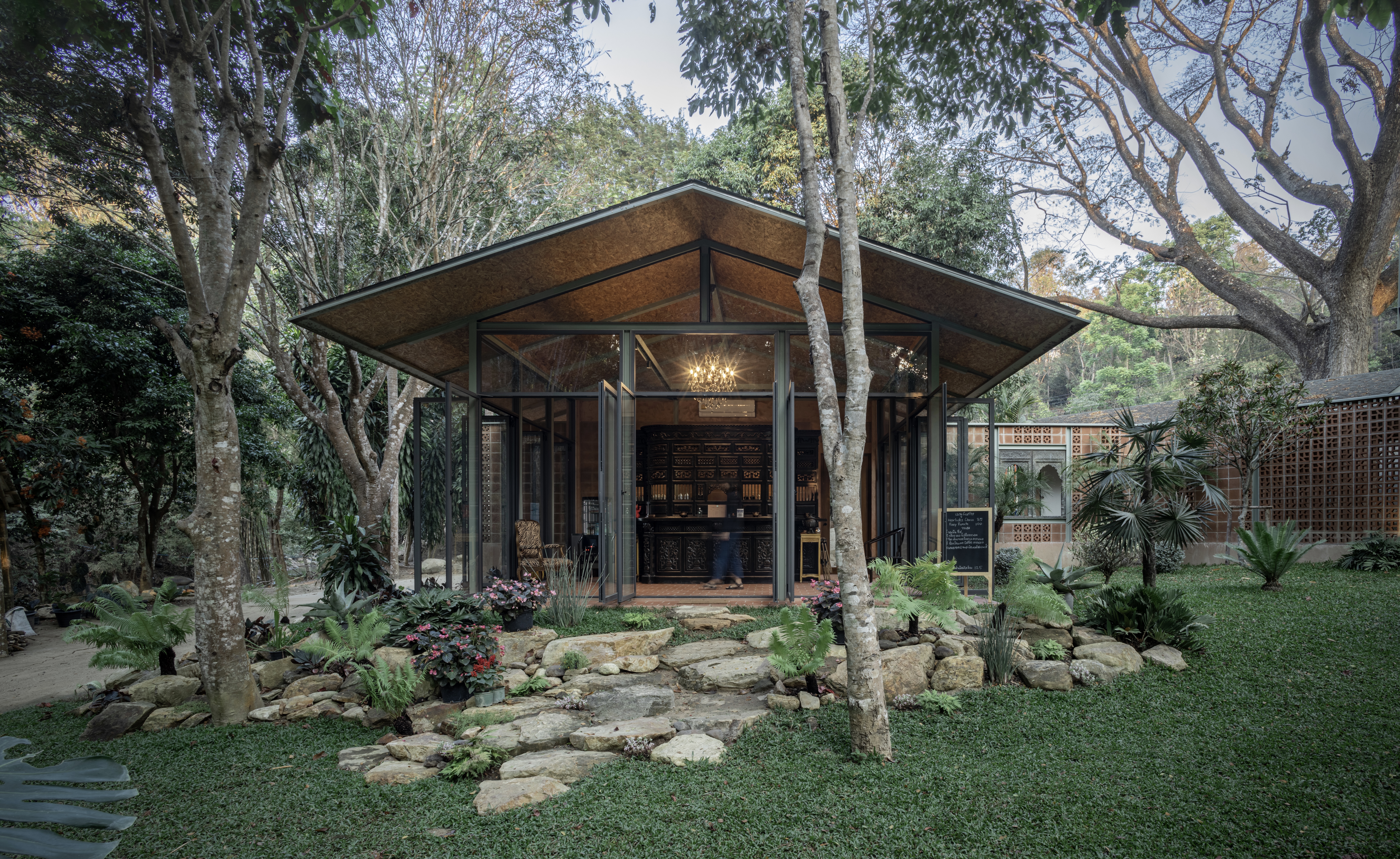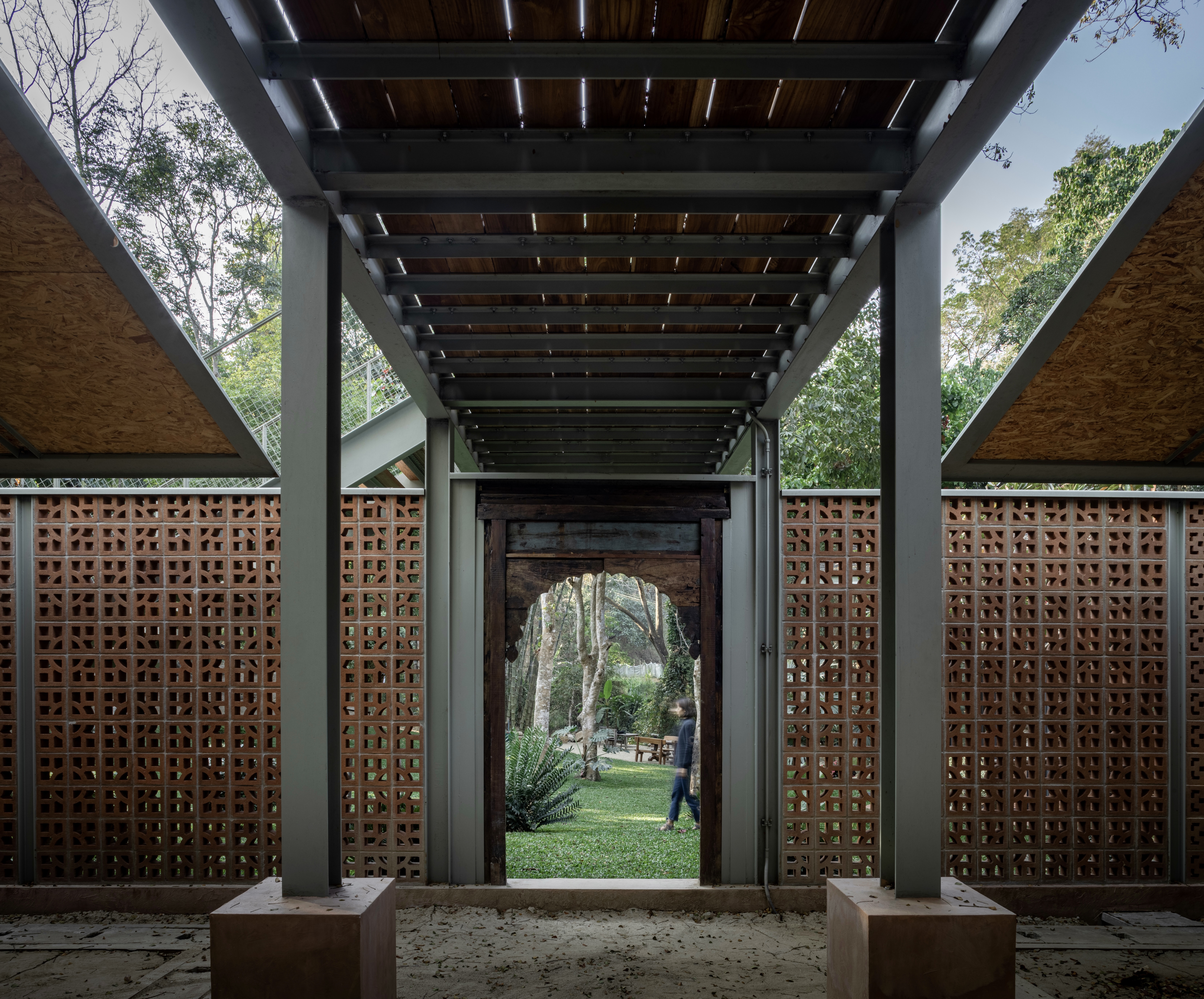 장식용 블록 벽은 적당한 높이로 설치되어 화장실과 창고를 가려주며 카페와 주방을 분리하는 역할도 한다. 다리와 계단은 망 사다리벽을 활용하여 시각적으로 가볍게 디자인됐으며 갈색과 녹청색 톤을 사용하여 자연과 조화를 이룬다. 카페 내부는 한쪽 벽면에는 외부에 사용된 것과 같은 장식용 블록 벽이 사용되었다. 갈색 테라코타 바닥 타일과 어두운 조명은 어두운 색상의 가구를 강조한다. 나머지 세 벽은 투명한 유리문으로 되어 있어 자연광, 환기 그리고 정원과 개울의 전망을 볼 수 있다. 시공 과정에서 발굴된 돌은 카페로 이어지는 계단으로 재활용되어 자연과 건축 사이의 연결성을 상징한다.