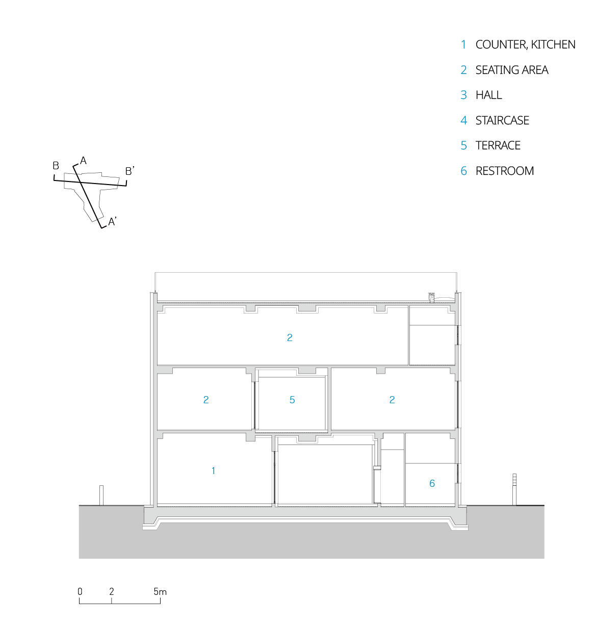 주 출입구와 면한 카운터는 방문객의 시선을 자연스럽게 유도한다. 1층의 카페 공간은 야외 테라스와 연결되어 영역에 확장성을 더한다. 2층은 소규모 모임이 가능한 공간과 바닥 난방이 되는 좌식형 공간을 두었다. 2층의 긴 붙박이 테이블형 가구를 두어 통창을 통해 계절에 따라 다양하게 변화하는 경관을 감상할 수 있다. 마당을 바라볼 수 있는 곡면 형태의 창은 파노라마 느낌의 뷰를 만들며 남측에서 유입되는 일광을 즐길 수 있다.