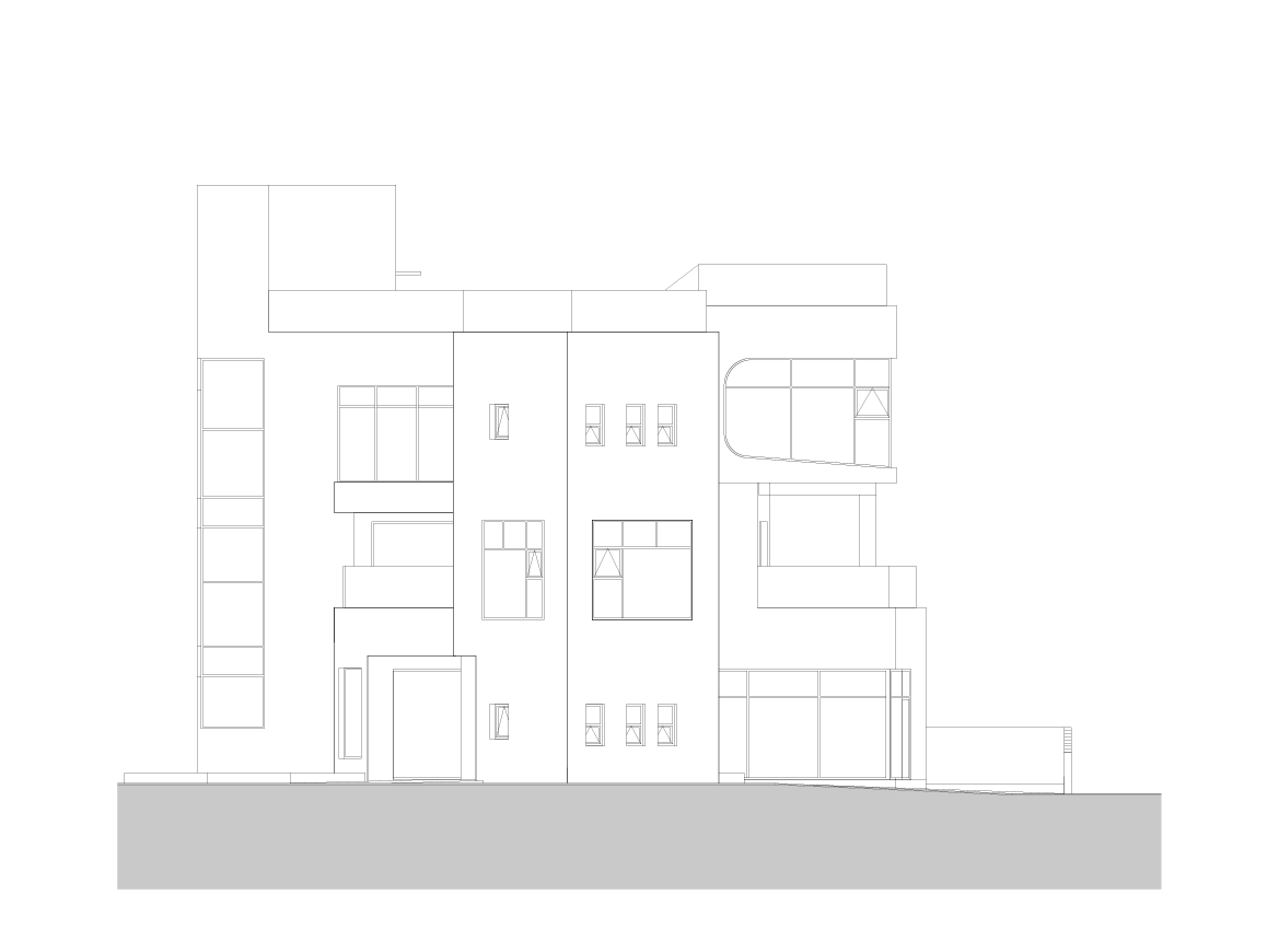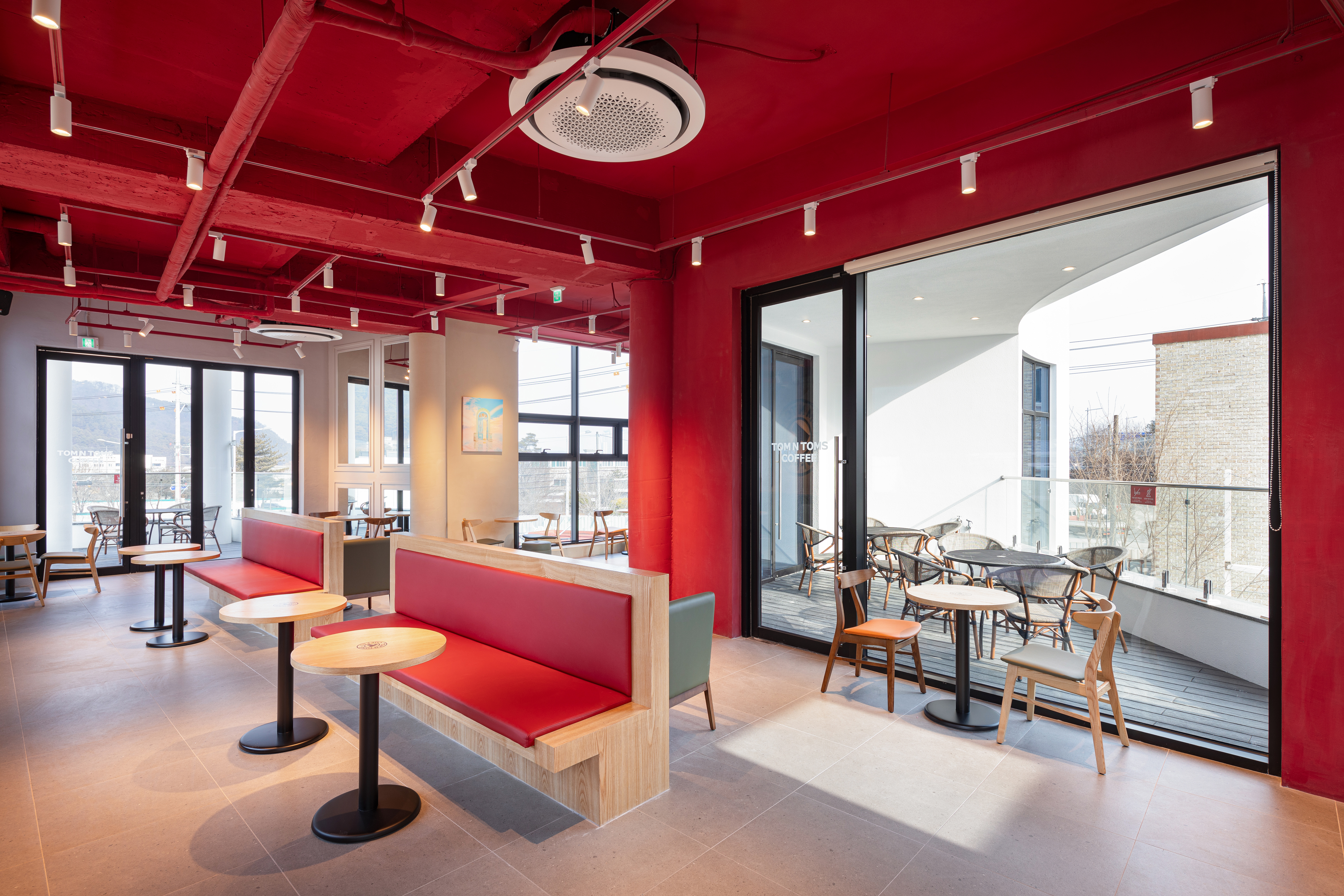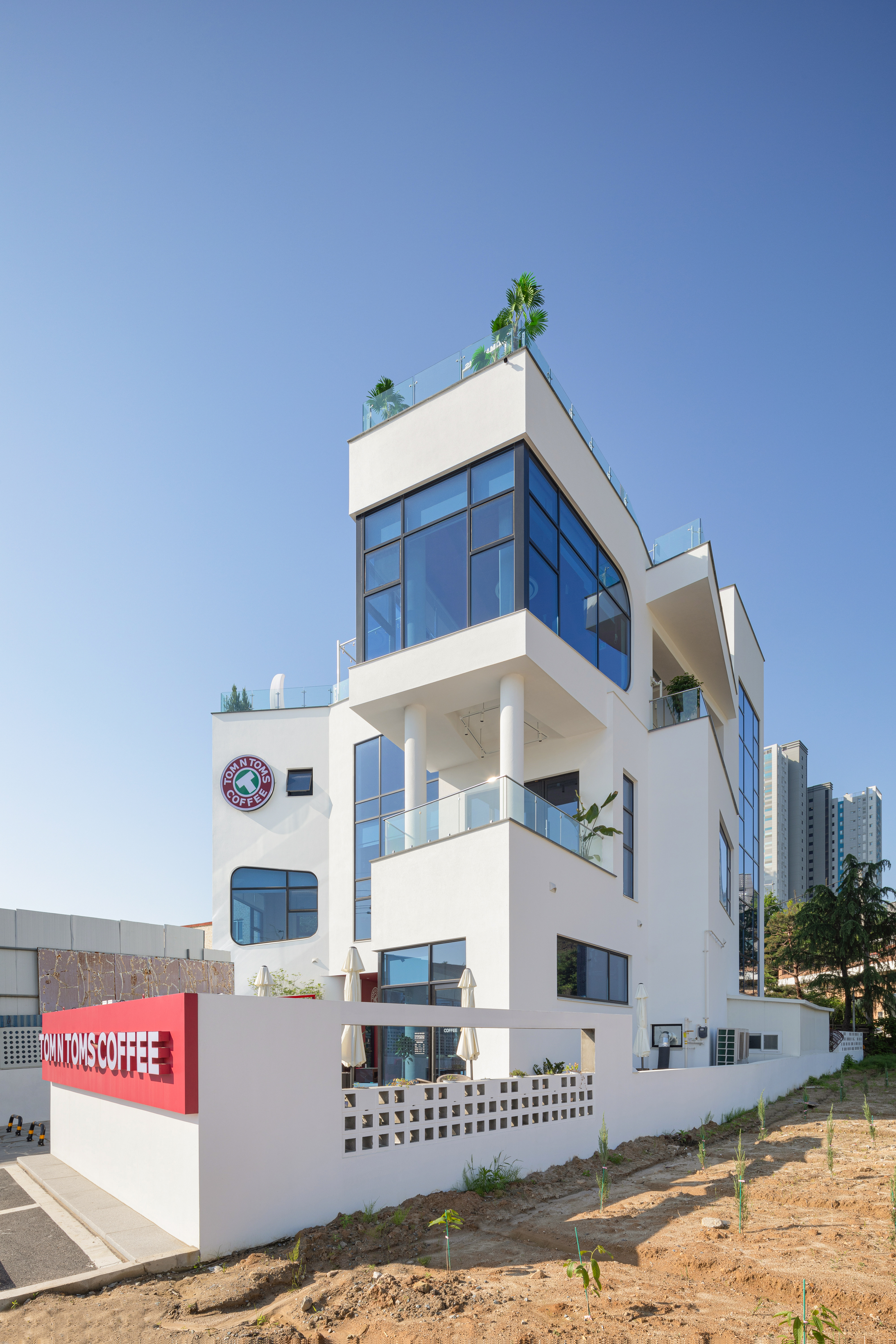 카페 브랜드인 탐앤탐스가 입점할 것을 고려하여 1층 진입부와 천장 그리고 내부에 빨간색을 메인 컬러로 사용했다. 외부 마감재는 외단열 시스템과 순백색의 마감재를 사용하여 외관을 깨끗하고 돋보이게 한다. 1층의 중간부는 진입부와 뒷뜰 개념의 넓은 마당을 연결하며 주 출입구로 이어진다. 오픈 공간은 여름에 시원한 바람 통로의 역할을 하며, 좌측으로 외부에서도 진입 가능한 화장실을 두고 우측으로 주 출입구를 두었다.