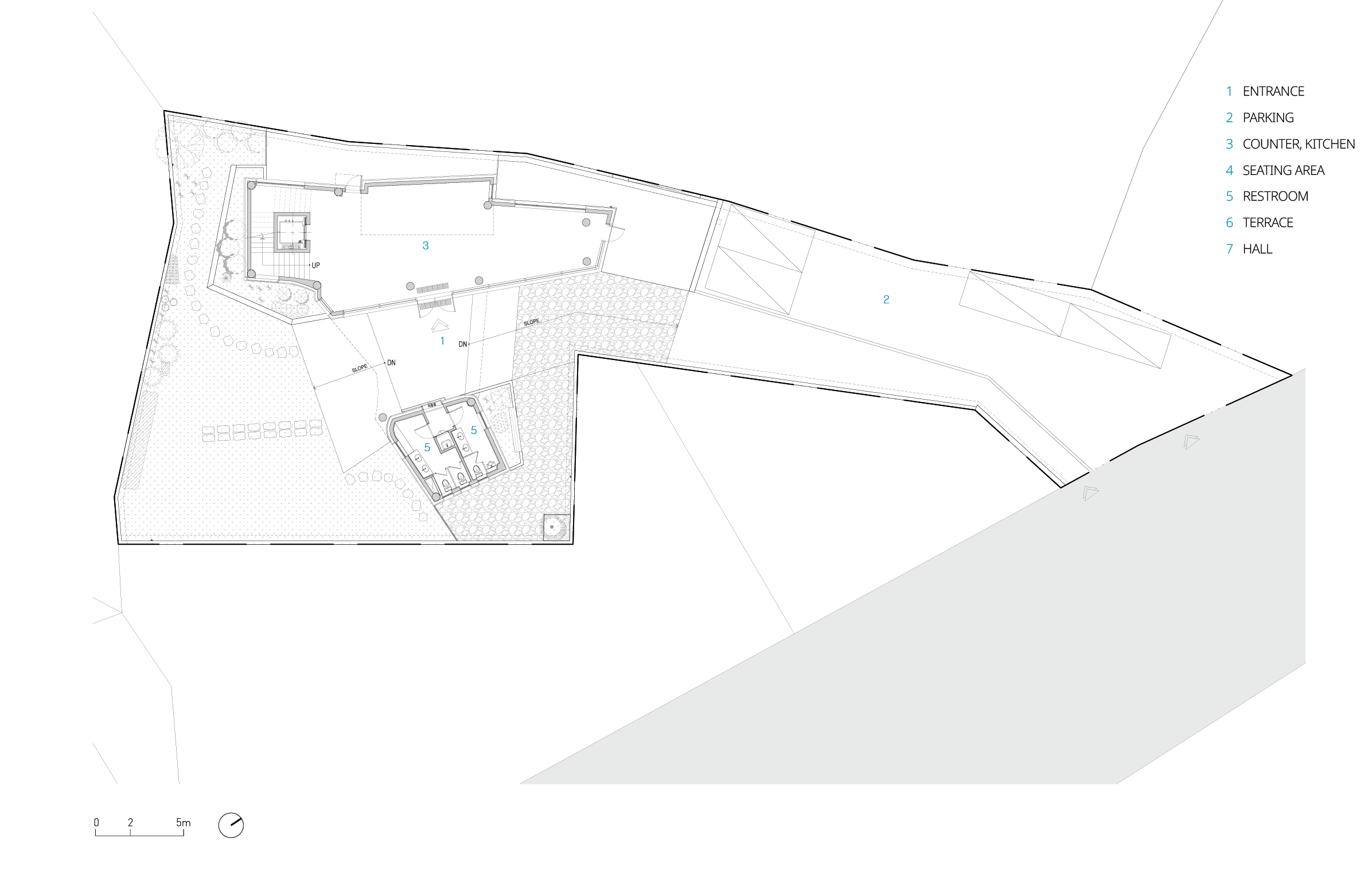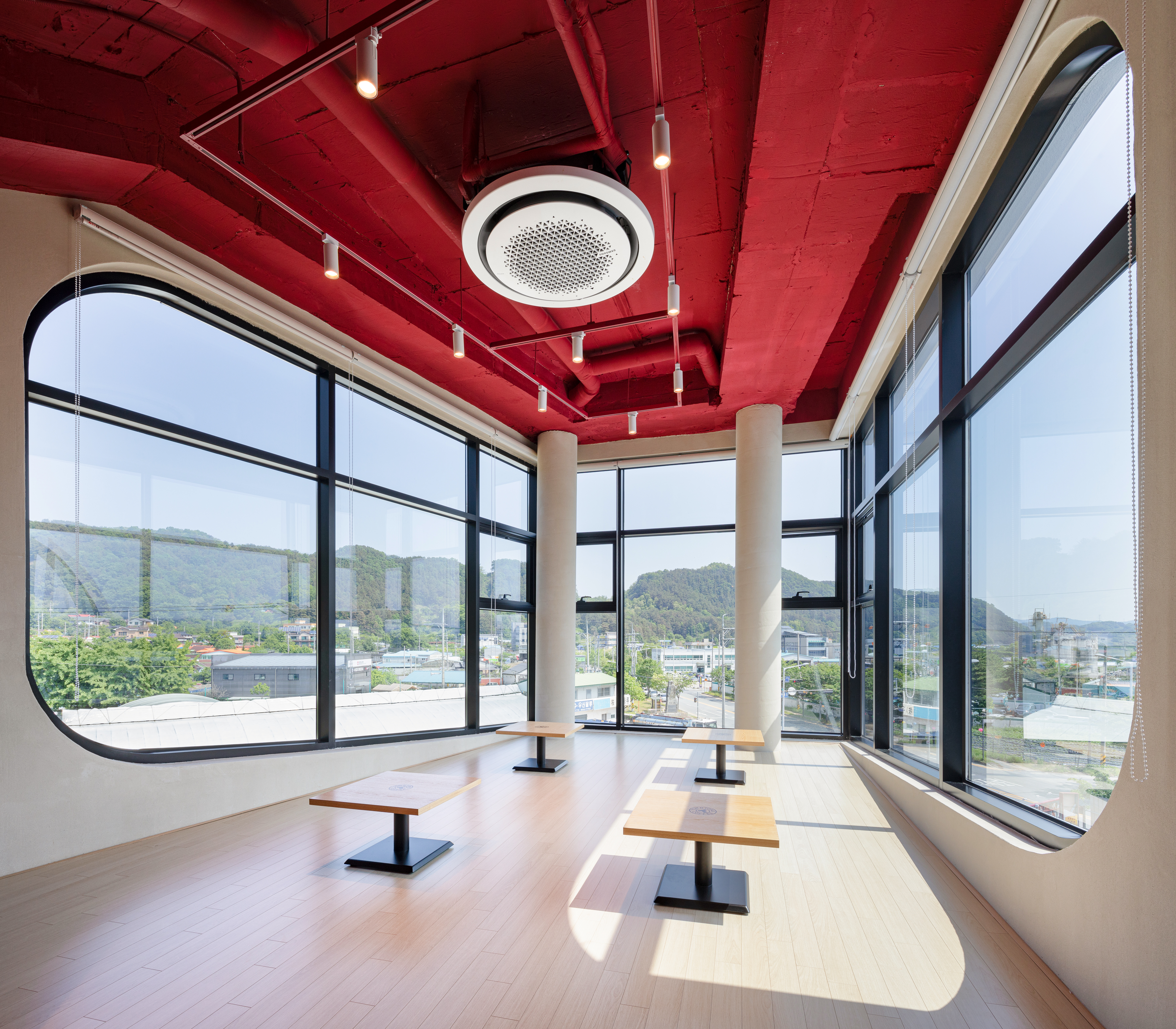 주 출입구와 면한 카운터는 방문객의 시선을 자연스럽게 유도한다. 1층의 카페 공간은 야외 테라스와 연결되어 영역에 확장성을 더한다. 2층은 소규모 모임이 가능한 공간과 바닥 난방이 되는 좌식형 공간을 두었다. 2층의 긴 붙박이 테이블형 가구를 두어 통창을 통해 계절에 따라 다양하게 변화하는 경관을 감상할 수 있다. 마당을 바라볼 수 있는 곡면 형태의 창은 파노라마 느낌의 뷰를 만들며 남측에서 유입되는 일광을 즐길 수 있다.