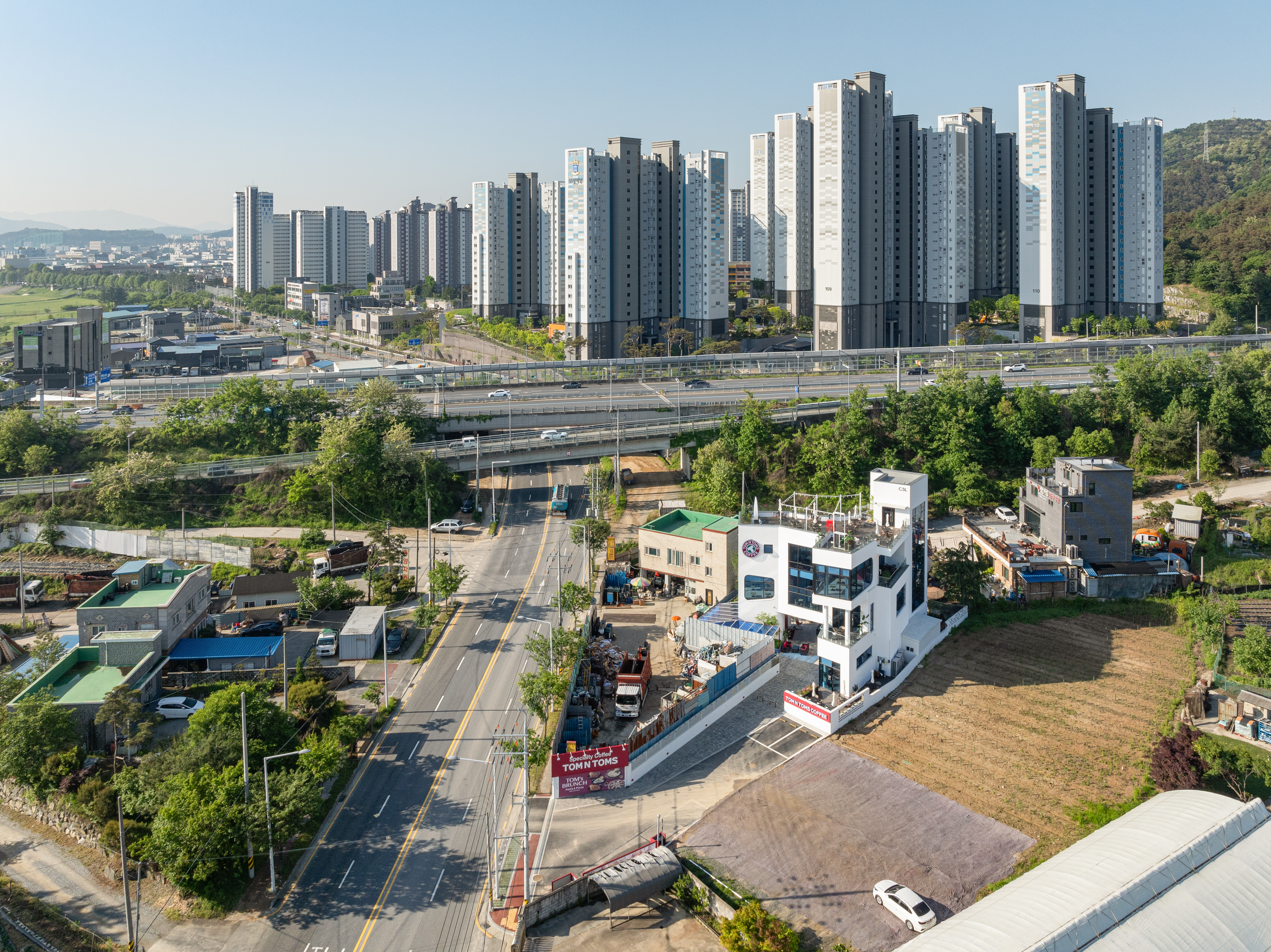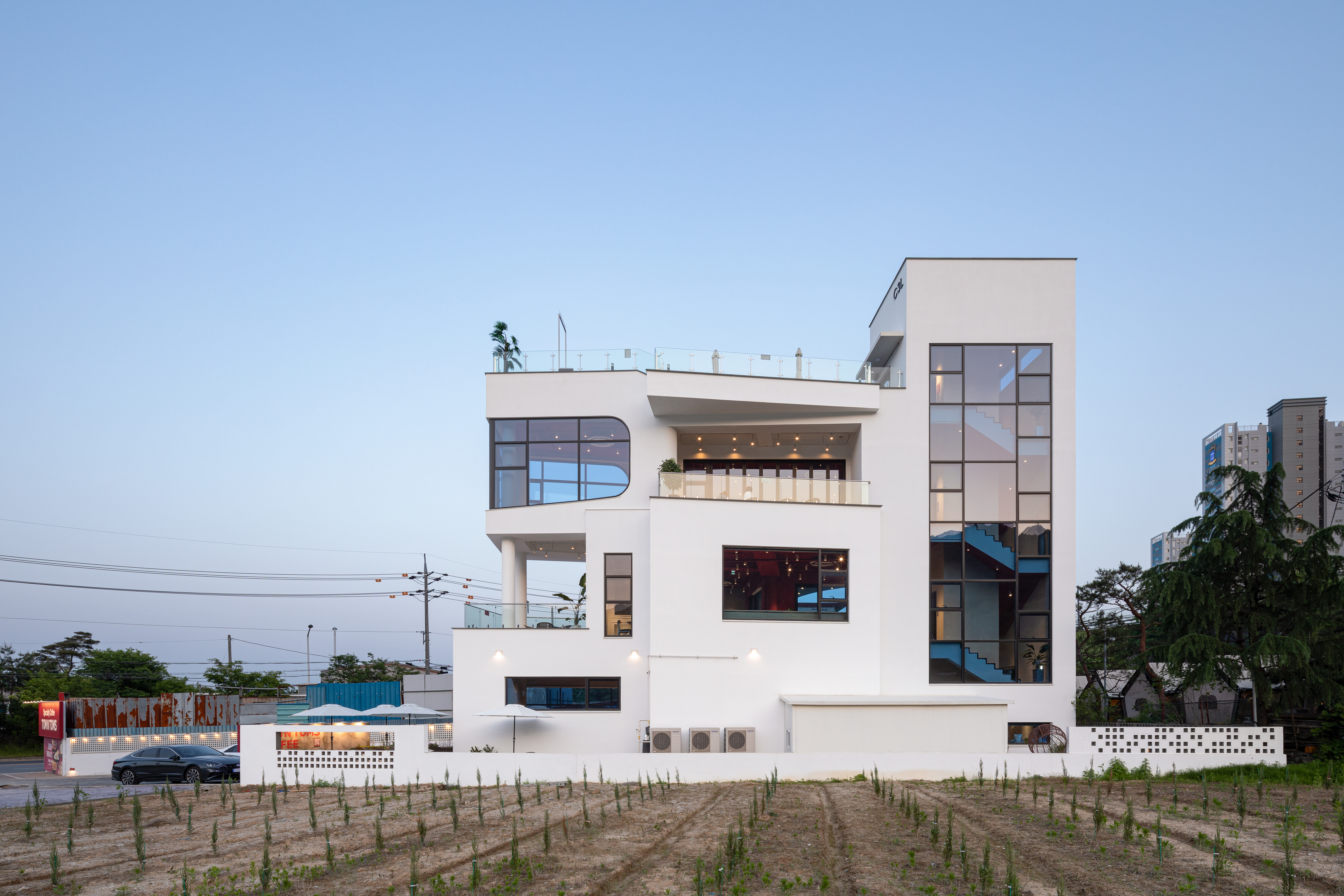 씨삼엘은 땅의 형태를 활용하여 곡선과 곡선을 연결한 디자인이 돋보이는 프로젝트다. 건축가는 도로변과 면한 면적이 좁은 대지에 카페로 사용될 건물을 짓기 위해 건축물의 인지성과 디자인 요소를 중요하게 고려했다.