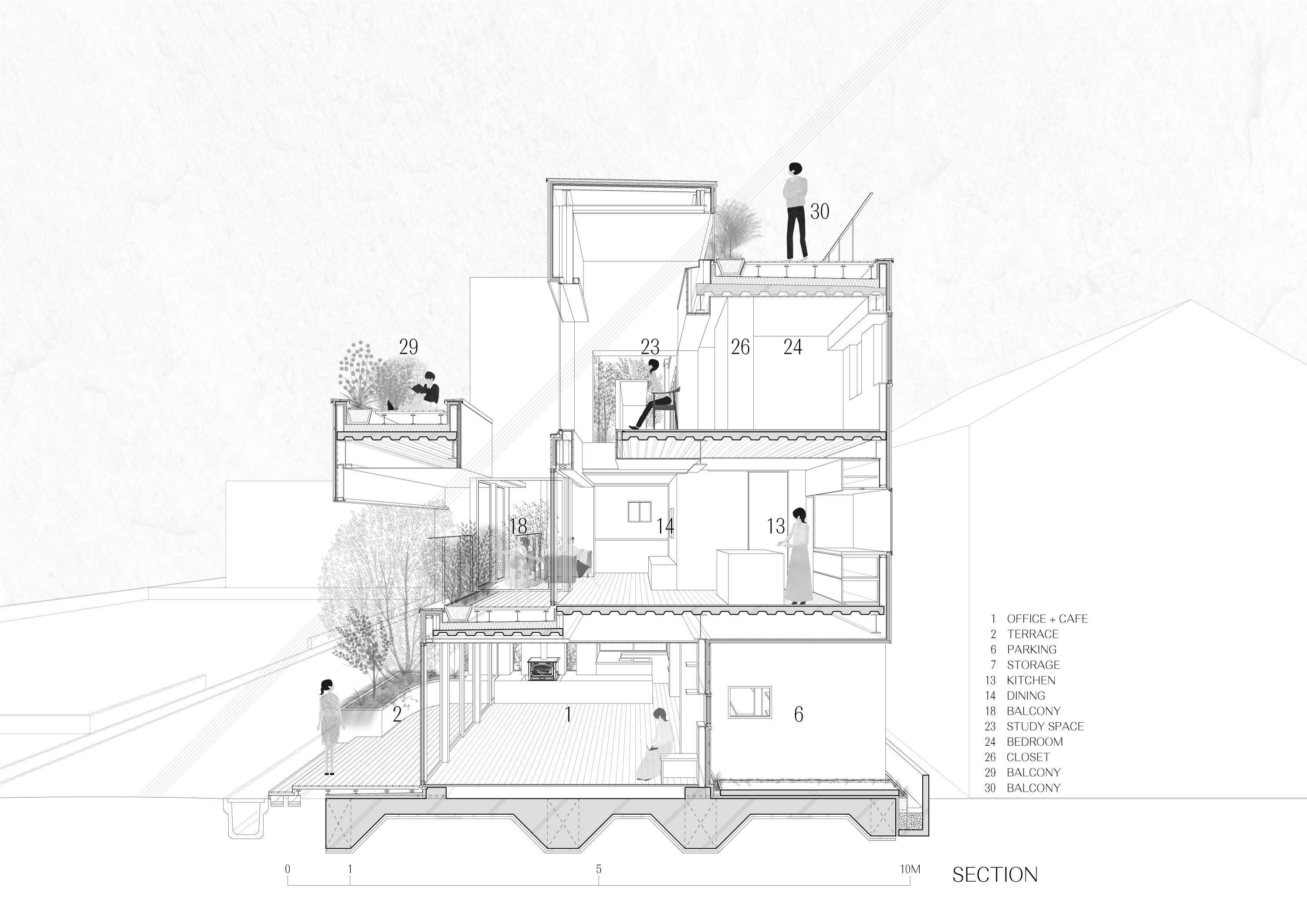 2층부터는 지역 네트워크를 통해 공유된 식물들이 대각선 개구부를 따라 배치되었으며, 남쪽 햇빛을 받으며 자라난다. 실내와 테라스가 교차하는 구성을 통해, 마치 자연 속에서 생활하는 듯한 환경이 조성되었다. 건축가는 '사람들이 함께 참여하고, 일상을 공유하는 것'이 지속 가능한 도시 공동체를 만드는 핵심이라고 믿는다. 건물이 완공된 이후, 이곳에서는 카페, 강연, 워크숍, 영화 상영 등 다양한 활동이 열리며 다층적인 네트워크가 형성되었고, 점차 다른 지역에도 영향을 미치고 있다.