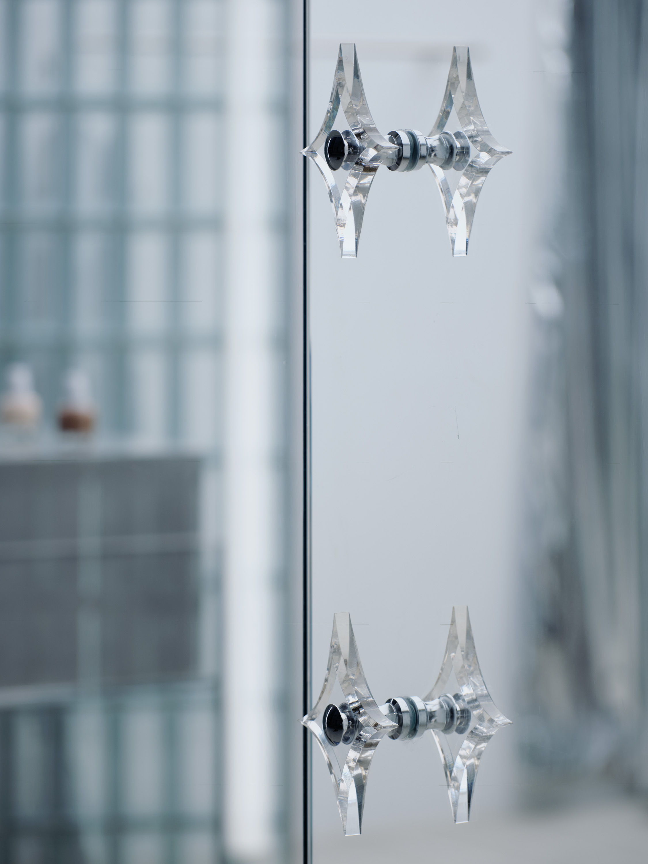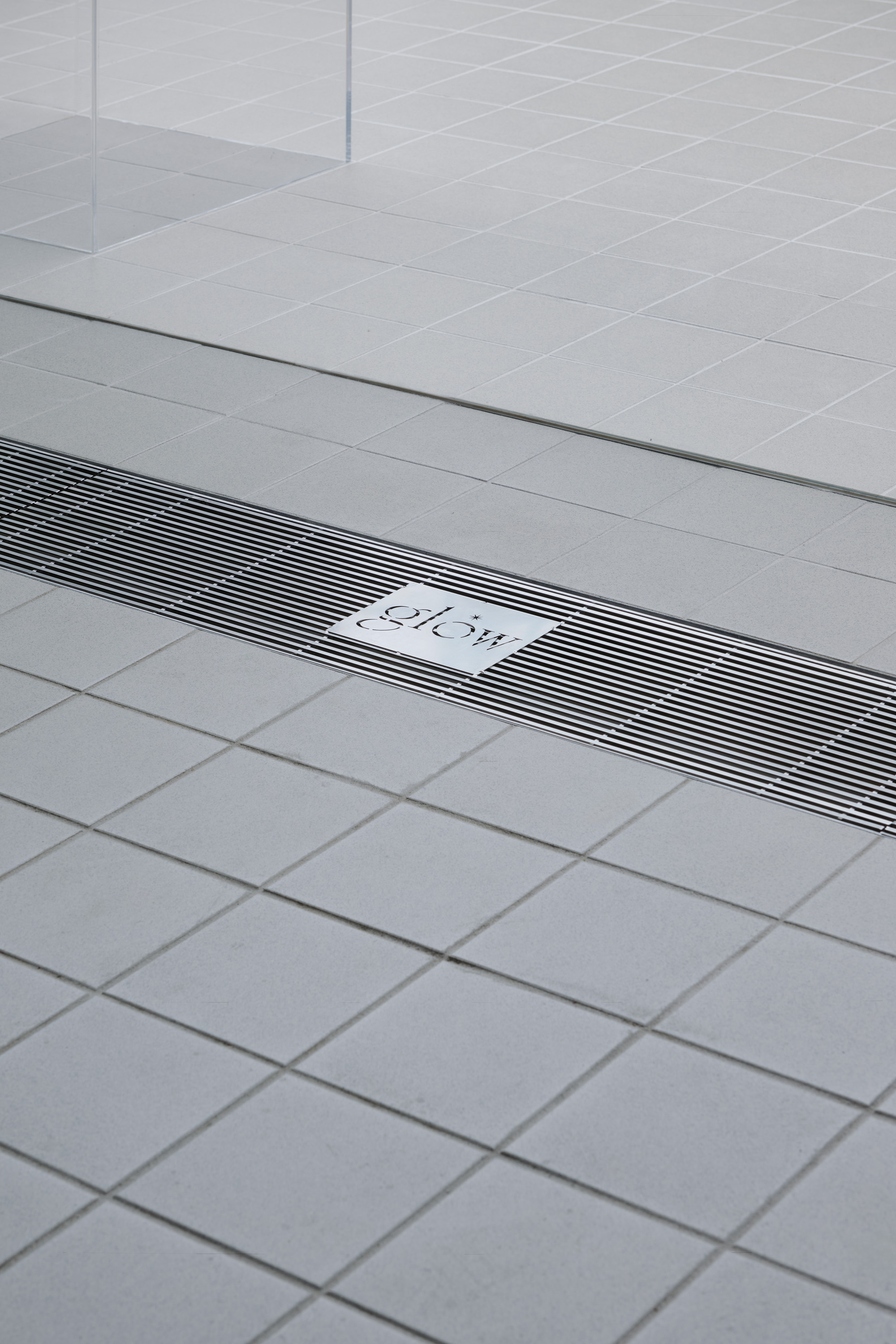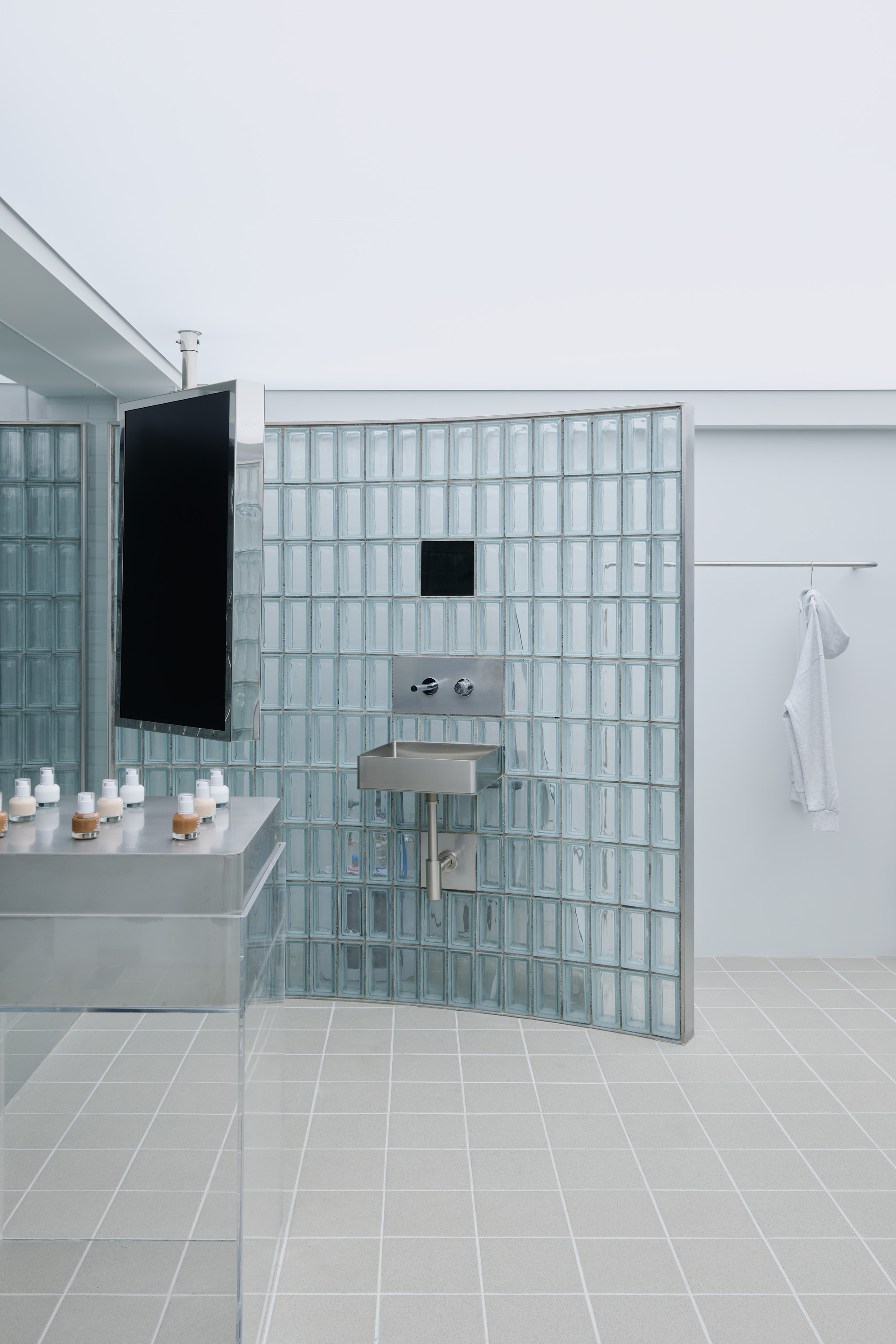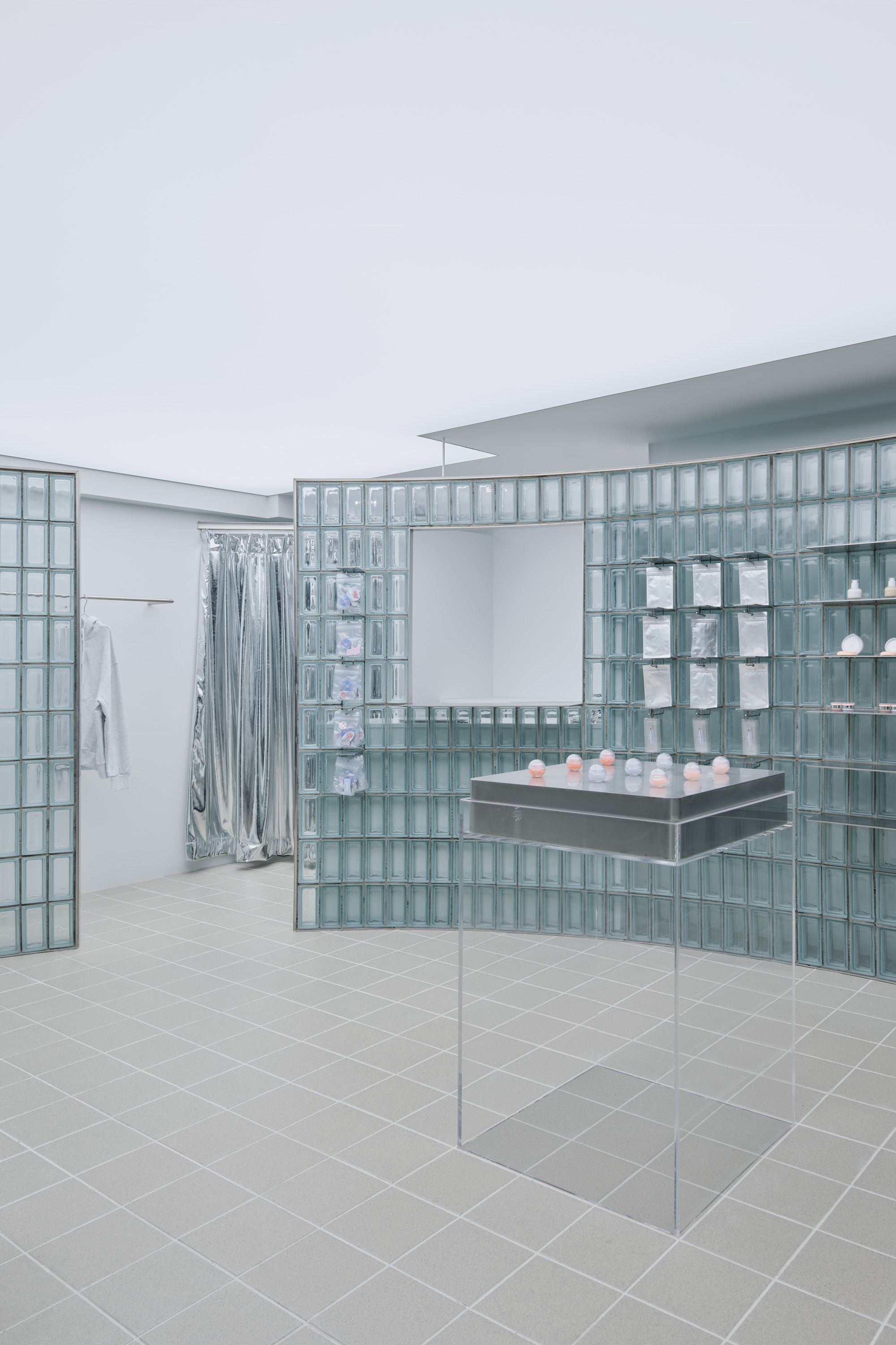 브랜드 아이덴티티를 공간에 반영하기 위해 주요 재료를 유리로 선택했다. 투명한 유리를 활용해 실내와 실외의 경계를 허물었으며 바닥 타일, 천장, 벽체까지 연결해 작은 7평의 공간을 외부까지 하나의 흐름으로 이어지는 느낌을 구현했다. 특히, 외ㆍ내부를 가로지르는 곡선형 유리벽체는 공간의 중심적인 건축적 장치로, 멀리서도 시선을 사로잡아 자연스럽게 시선을 내부로 이끌며 내부 공간을 자연스럽게 분리해 손님과 직원 동선을 구분하는 역할도 한다. 유리벽체 뒤쪽에는 탈의실과 카운터를 배치해 프라이버시를 보장하고 앞쪽 공간은 상품 전시 공간으로 활용된다.