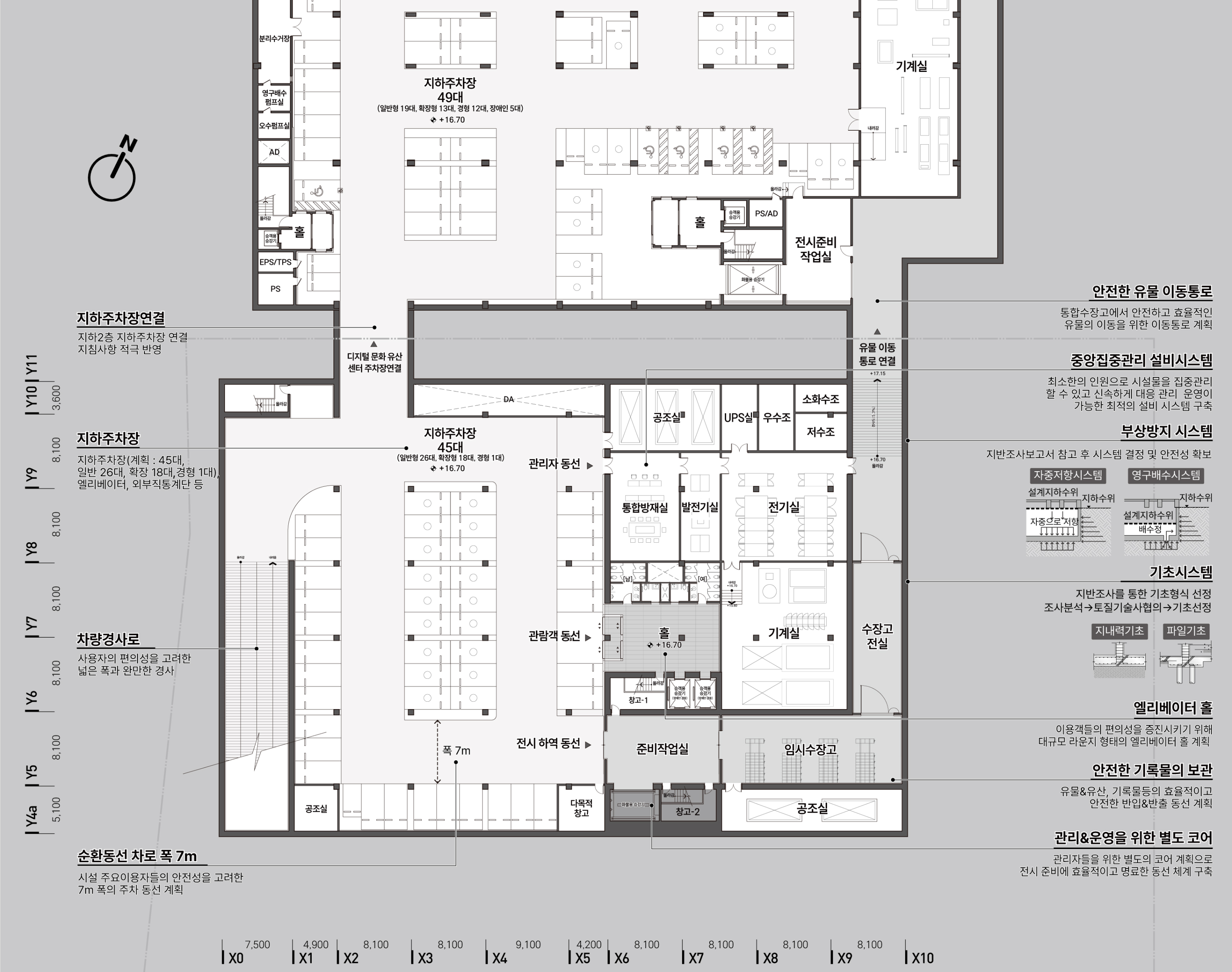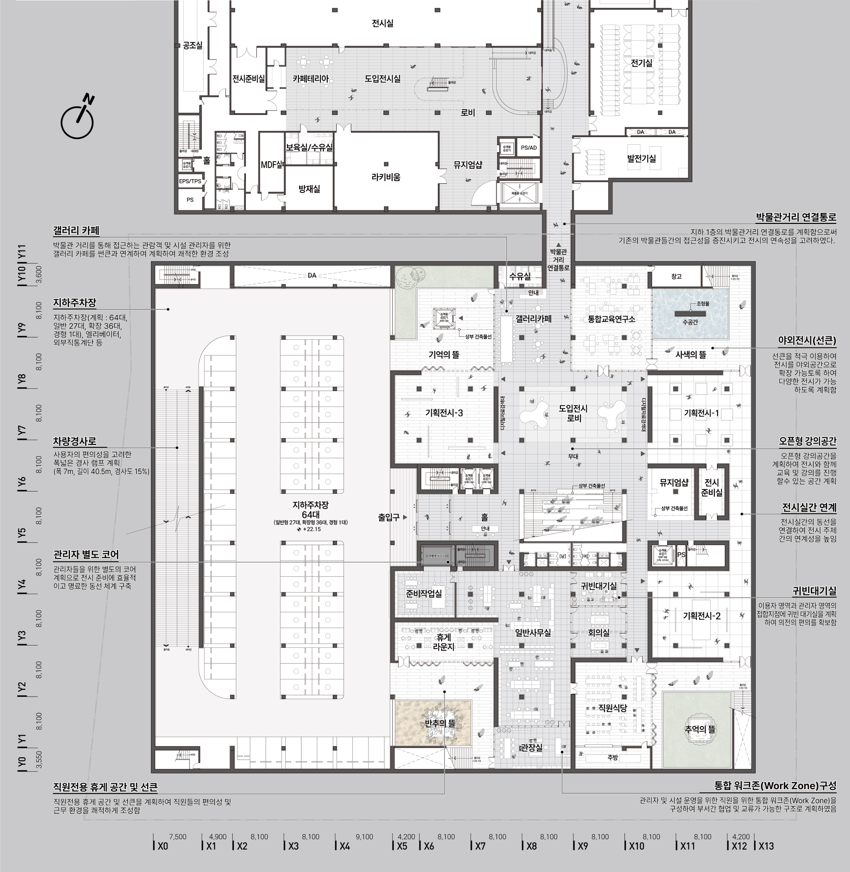 대지는 북측으로 4개의 인접 박물관과 서측으로 제천, 독락정 역사공원, 동측의 중앙광장, 중앙공원을 곁에 두고 있다. 남측으로 국립민속박물관과 그 너머 금강의 자연을 유입해 국가기록박물관 속에 자연스레 자연들이 투영된다. 맥락적 흐름에서 1구역의 마지막에 있는 국가기록박물관은 한 구역의 끝맺음 역할을 하며, 2구역이 다시 시작되는 연결 지점으로 연속적인 공간으로서의 이중성을 내포한다. 건축물의 비움과 채움 속, 선큰과 건물의 조화로운 흐름이 만들어지며, 마스터플랜에 부합하는 연결성과 통일성을 갖춘다. 박물관마다 쾌적한 선큰배치로 지하 박물관 거리에 자연을 유입시키고 서로의 하부 공간이 유연하게 공유된다. 건물 외곽 전시월은 건물 안팎으로 다양한 전시의 가능성을 열어주는 공간 큐레이팅을 가능하게 한다.