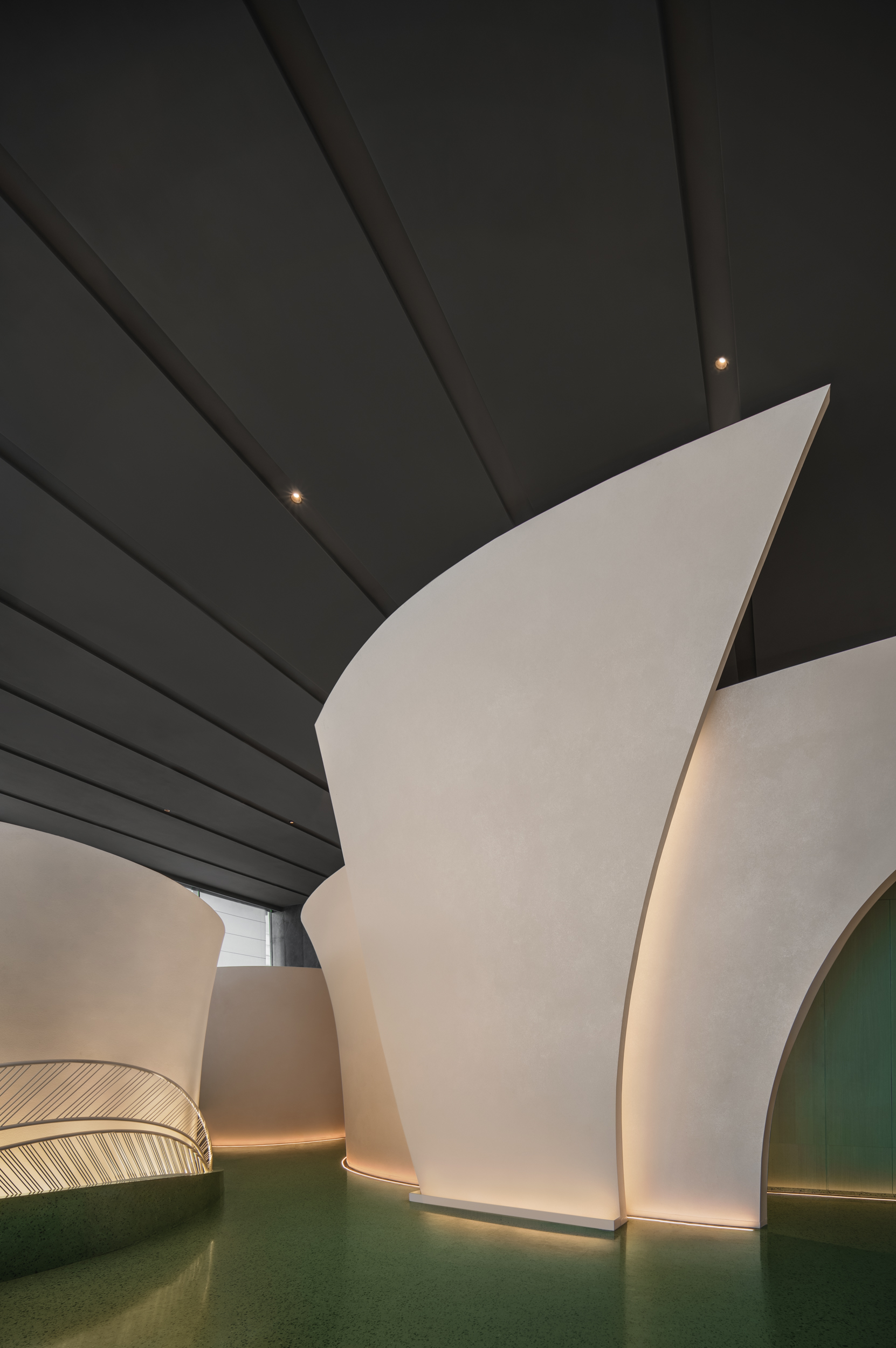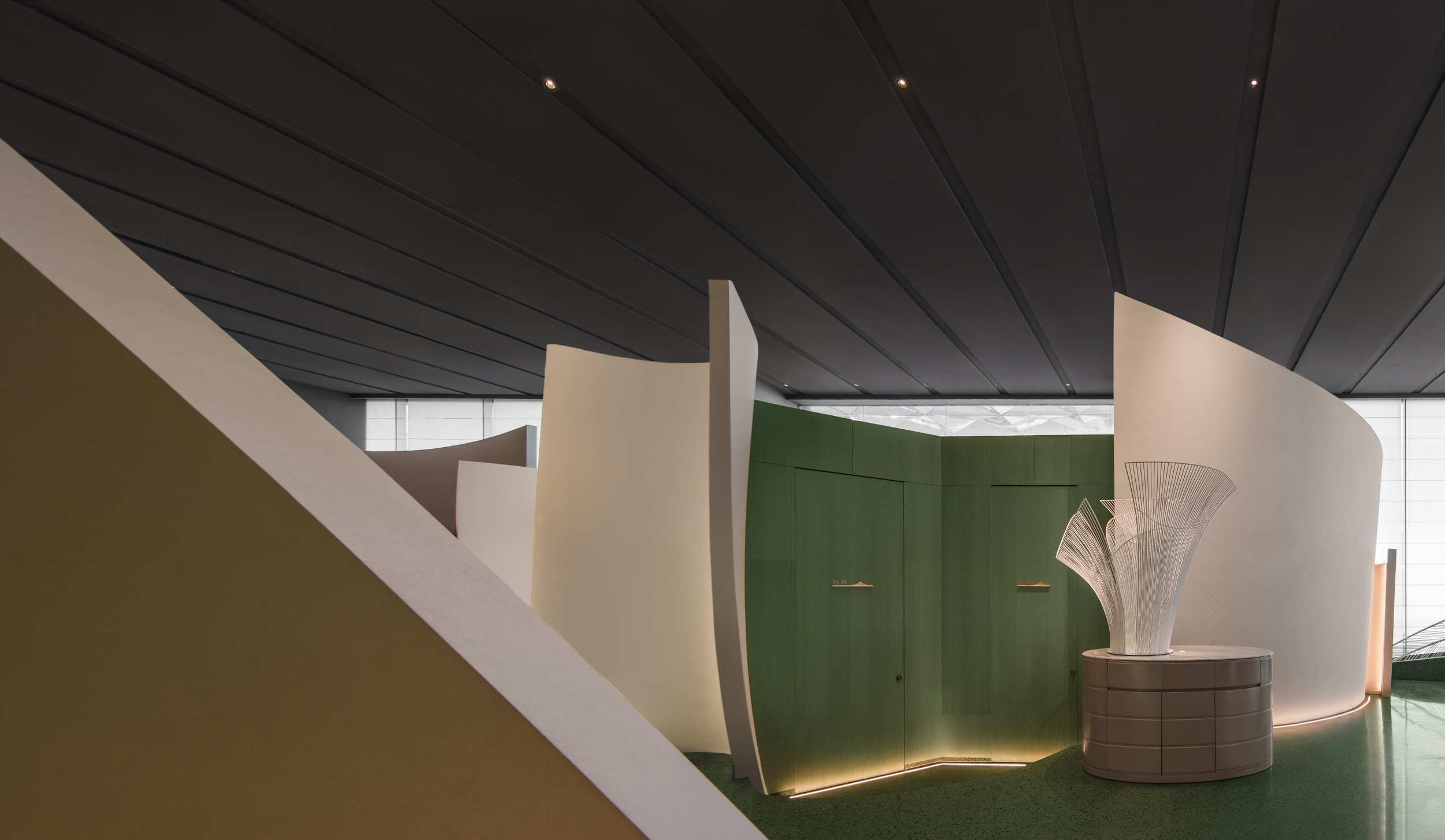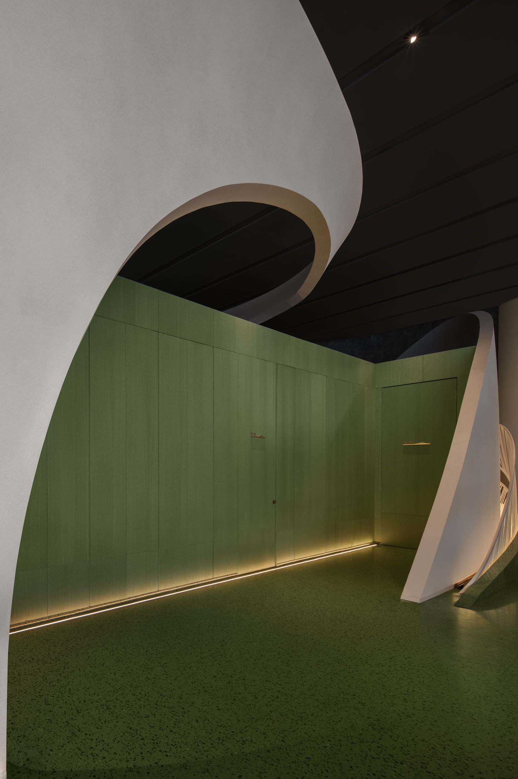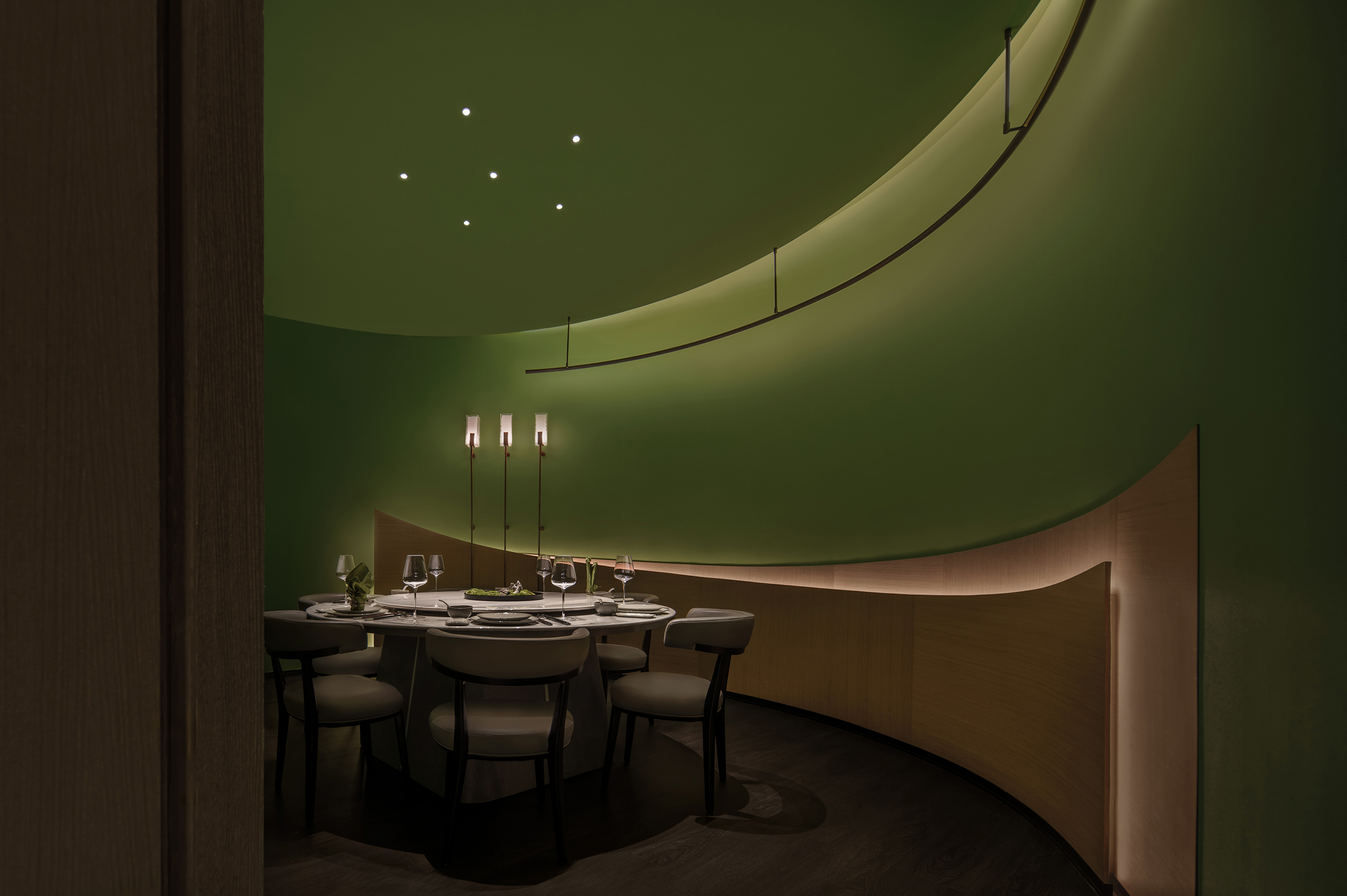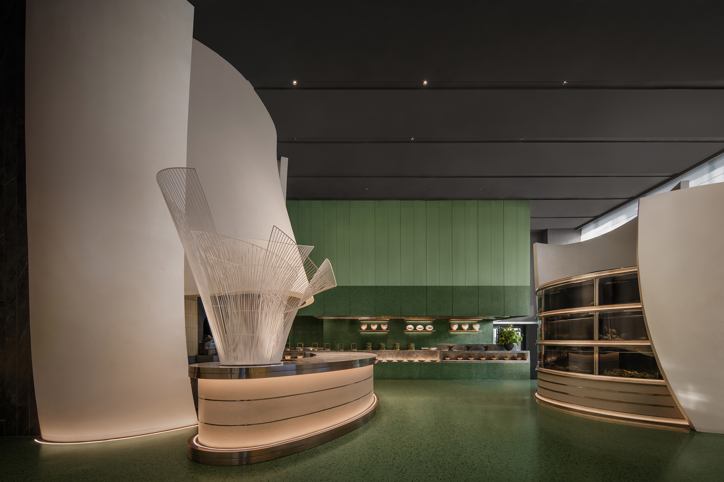 계단식 좌석 디자인은 깊이감을 만들어내며, 친밀한 데이트부터 가족 모임까지 다양한 상황에서 이용할 수 있다. 숨겨진 복도는 마치 여정같은 분위기를 만들며, 녹색 톤으로 장식된 프라이빗 룸으로 이어진다. 공간은 전통적인 대칭과 직선 디자인을 벗어나, 비대칭과 역동적인 대조의 언어로 형태를 재구성한다. 깊은 옥색 대리석은 웅장하게 조각된 장벽처럼 솟아오르고, 그 위로 금빛 천장이 눈길을 사로잡는다.