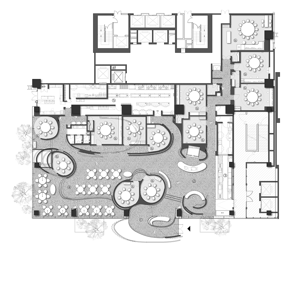 계단식 파사드 벽은 산처럼 우뚝 솟아 있으며, 깨끗한 흰 표면은 흐르는 호박빛 조명으로 생동감 있게 빛난다. 안개 자욱한 산속에 들어서면 숨겨진 미식의 즐거움이 기다리고 있다. 이 공간은 개방된 레이아웃으로 손님들이 자유롭게 이동할 수 있다.