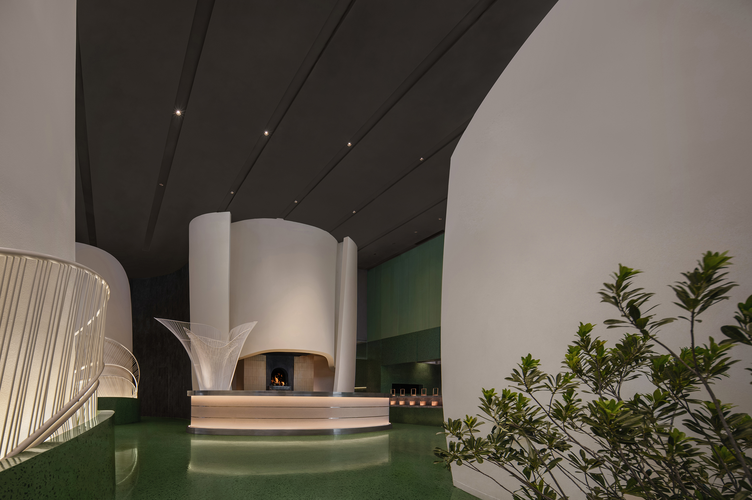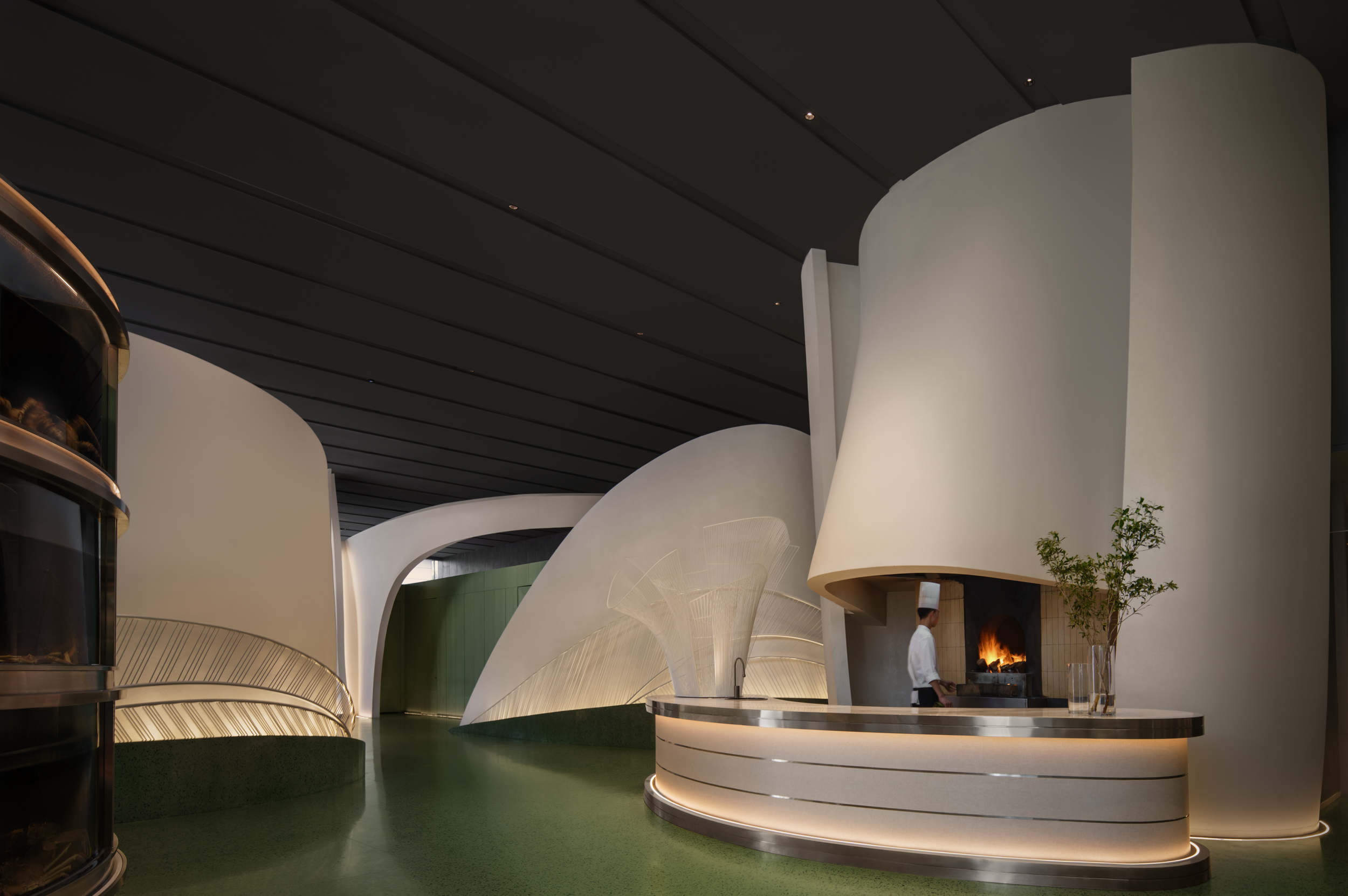 디자이너는 이미지를 형태로 바꾸어, 바다의 광활함과 시간의 흐름을 맛볼 수 있는 경험을 만들었다. 천장까지 닿는 창문은 실내외 경계를 흐리며, 곡선형 식물 벽과 유동적인 질감이 호기심을 자극한다.