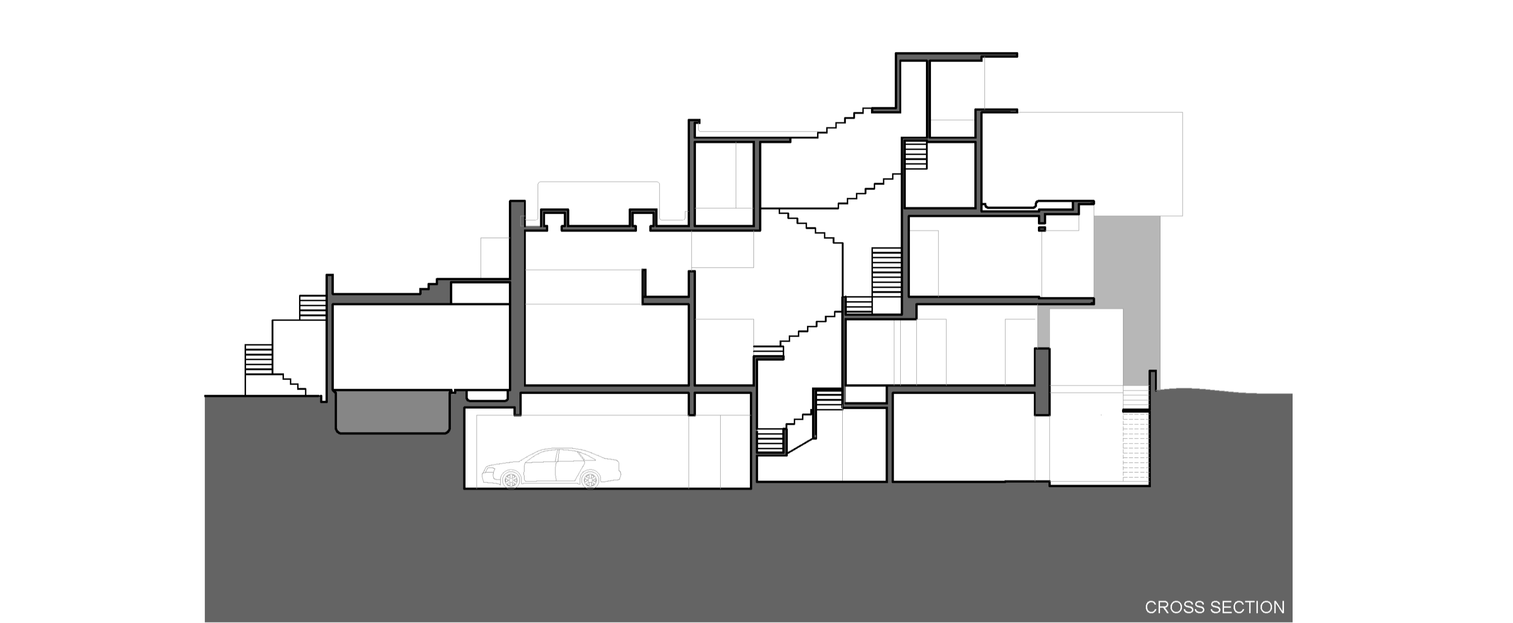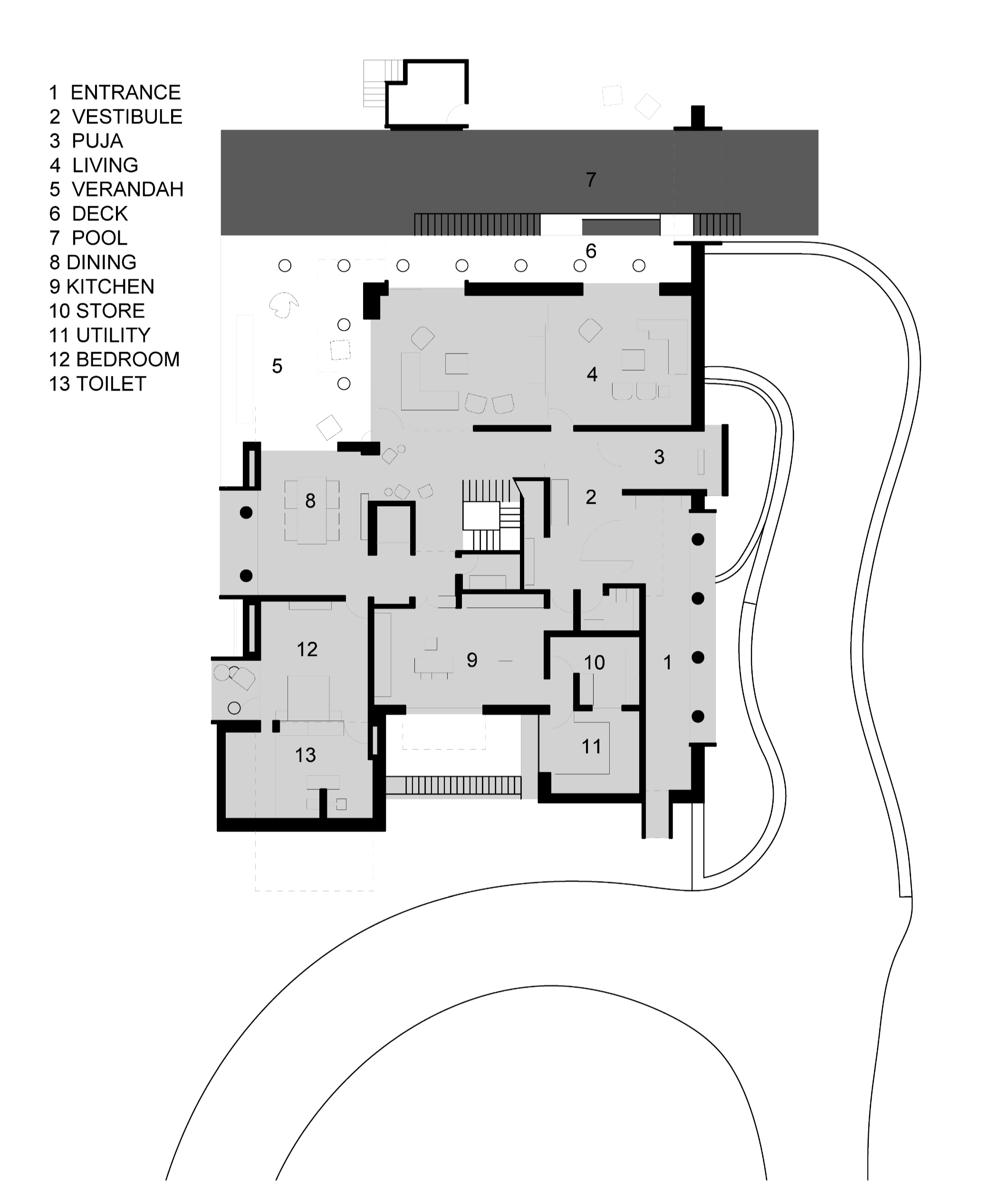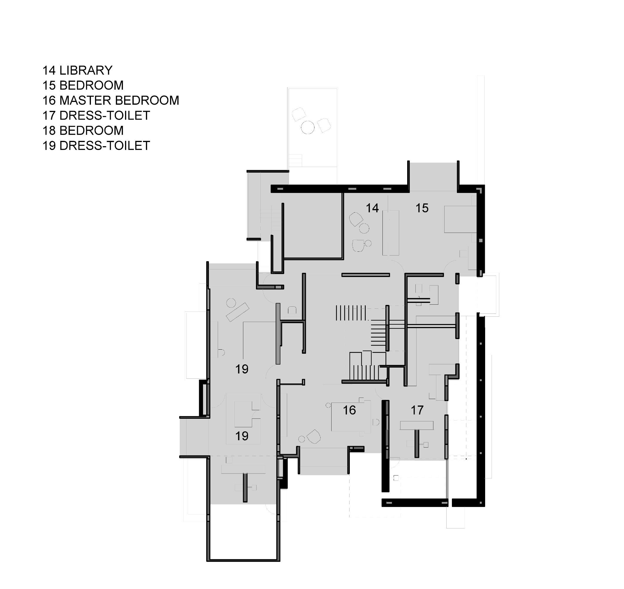 공용 공간은 1층에 배치되었다. 수영장 옆 거실과 휴식 공간, 정원과 맞닿은 다이닝 공간, 입구 공간, 그리고 집 전체의 운영을 책임지는 거대한 인도식 주방이 있는데, 그 곳에서는 가족과 직원을 위한 음식이 조리된다. 다이닝 공간과 주방 사이에는 문이 있는데, 할머니의 방으로 이어진다. 이곳에서 바다가 보이는 전망을 확보하는 것은 필수적이었다. 이를 위해 집은 한 층 더 계획되었고, 바다 전망을 누릴 수 있게 되었다. 또한, 실내에서 보이는 전망을 강조하기 위해 삼층은 비교적 폐쇄적인 공간으로 설계되으며, 그 안에 홈시어터를 설치했다. 건물을 설계하던 중 나무 아래에서 버려진 담수 우물을 발견했다. 나무를 건드리지 않기로 결정하면서, 집의 배치는 자연스럽게 정해졌다.