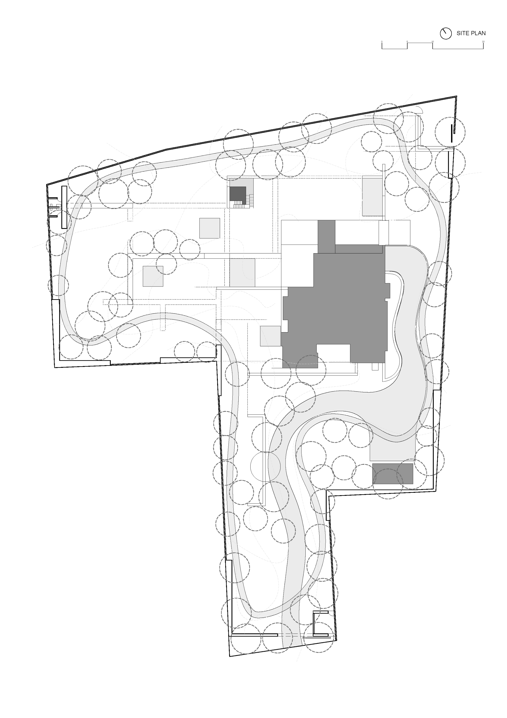 공용 공간은 1층에 배치되었다. 수영장 옆 거실과 휴식 공간, 정원과 맞닿은 다이닝 공간, 입구 공간, 그리고 집 전체의 운영을 책임지는 거대한 인도식 주방이 있는데, 그 곳에서는 가족과 직원을 위한 음식이 조리된다. 다이닝 공간과 주방 사이에는 문이 있는데, 할머니의 방으로 이어진다. 이곳에서 바다가 보이는 전망을 확보하는 것은 필수적이었다. 이를 위해 집은 한 층 더 계획되었고, 바다 전망을 누릴 수 있게 되었다. 또한, 실내에서 보이는 전망을 강조하기 위해 삼층은 비교적 폐쇄적인 공간으로 설계되으며, 그 안에 홈시어터를 설치했다. 건물을 설계하던 중 나무 아래에서 버려진 담수 우물을 발견했다. 나무를 건드리지 않기로 결정하면서, 집의 배치는 자연스럽게 정해졌다.