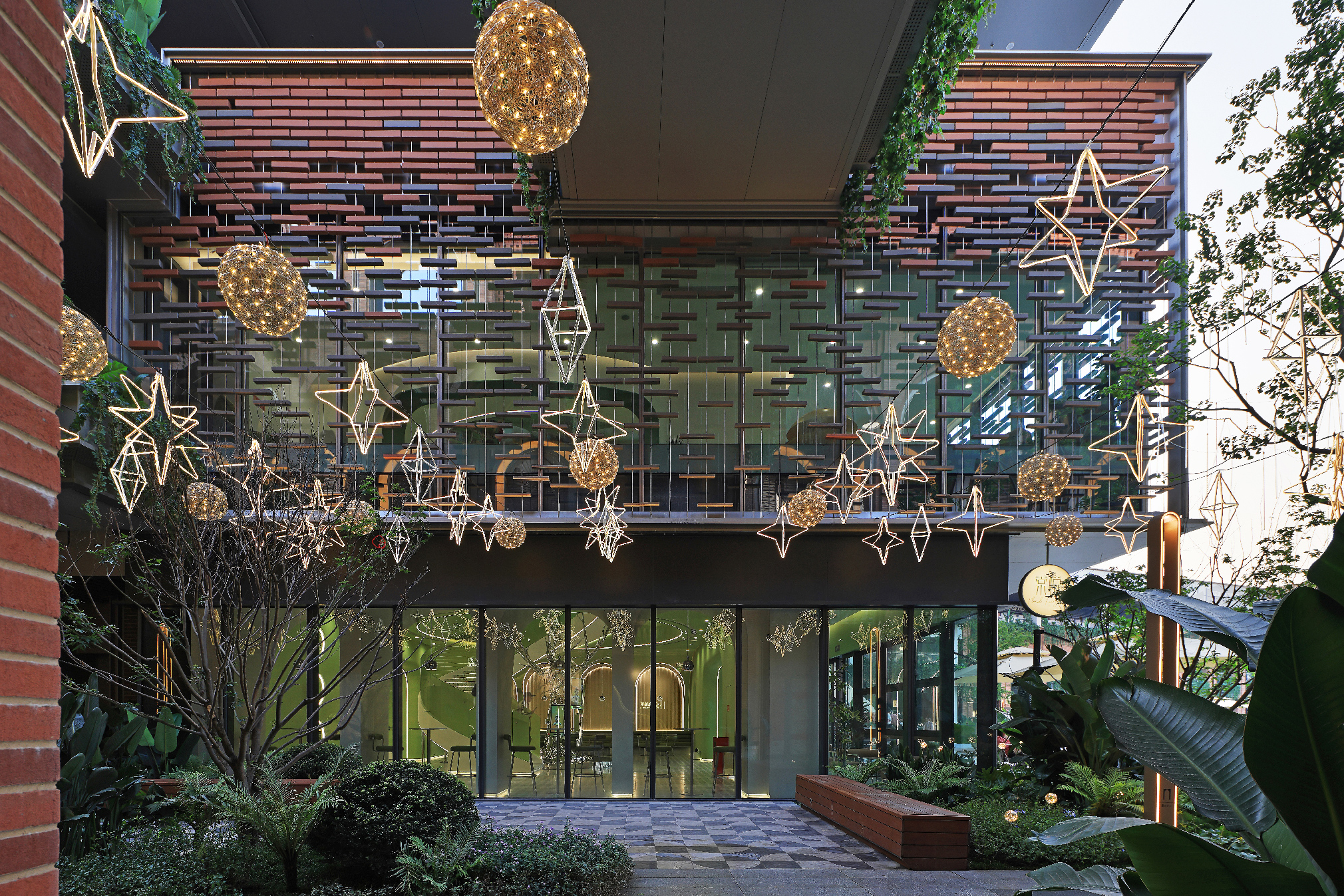 디자이너는 공공 공간의 분위기를 더욱 따뜻하고 친근하게 만들기 위해 조명 및 조경 가구 디자인에 중점을 두었다. 맞춤형 좌석 배치(싱글 소파, 테이블, 파라솔)는 물론, 플로어 램프, 풀빛 조명, 캐노피(천막) 구조물을 조합하여 아늑한 휴식 공간을 조성했다. 또한, 흐르는 물을 연상시키는 워터 라이트 조명과 감각적인 조형물을 배치해 자연스럽고 조화로운 분위기를 연출했다. 특히, 조명 디자인은 단순한 기능적 역할을 넘어 감성적 경험을 강화하는 요소로 활용되었다. 건축 스타일과 주변 환경을 고려한 캐노피 조명, 앰비언트 라이트(간접조명), 나무에 조명 등을 사용해 공간에 깊이감과 리드미컬한 연출을 더했다.