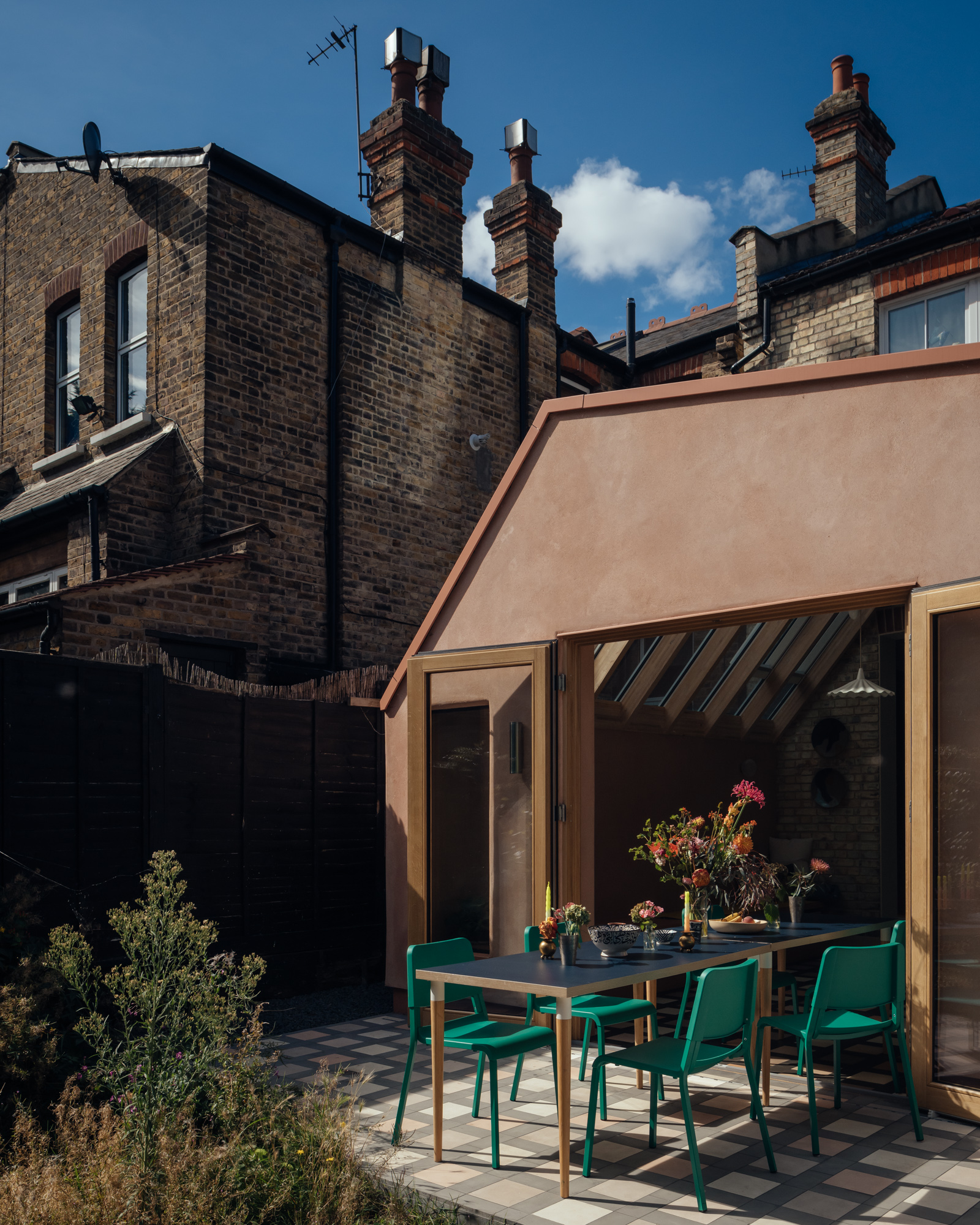 다이닝은 기존 주택의 벽과 개구부에 기대어 자리 잡았다. 기존 구조를 최대한 유지하여 원래 있던 개구부를 그대로 활용했다. 넓은 유리창 덕분에 빛이 공간 깊숙이 스며든다. 바닥은 맞춤형 타일 패턴을 사용해, 외부의 자갈길에서 영감을 받은 독특한 디자인으로 완성되었다. 주방은 기존 위치를 유지하며 새로운 조리대와 세탁실, 샤워실을 추가해 실용성과 수납 공간을 극대화했다. 새로운 공간은 외부의 분위기를 그대로 실내로 들여오기 위해 일부 마감재를 의도적으로 노출했다. 벽면에는 텍스처가 살아 있는 플라스터 마감을 사용했으며, 내부와 외부 모두 동일한 따뜻한 색감으로 마감했다. 세 개의 유광 컬러를 활용해 정원을 둘러싼 공간을 구분했다.