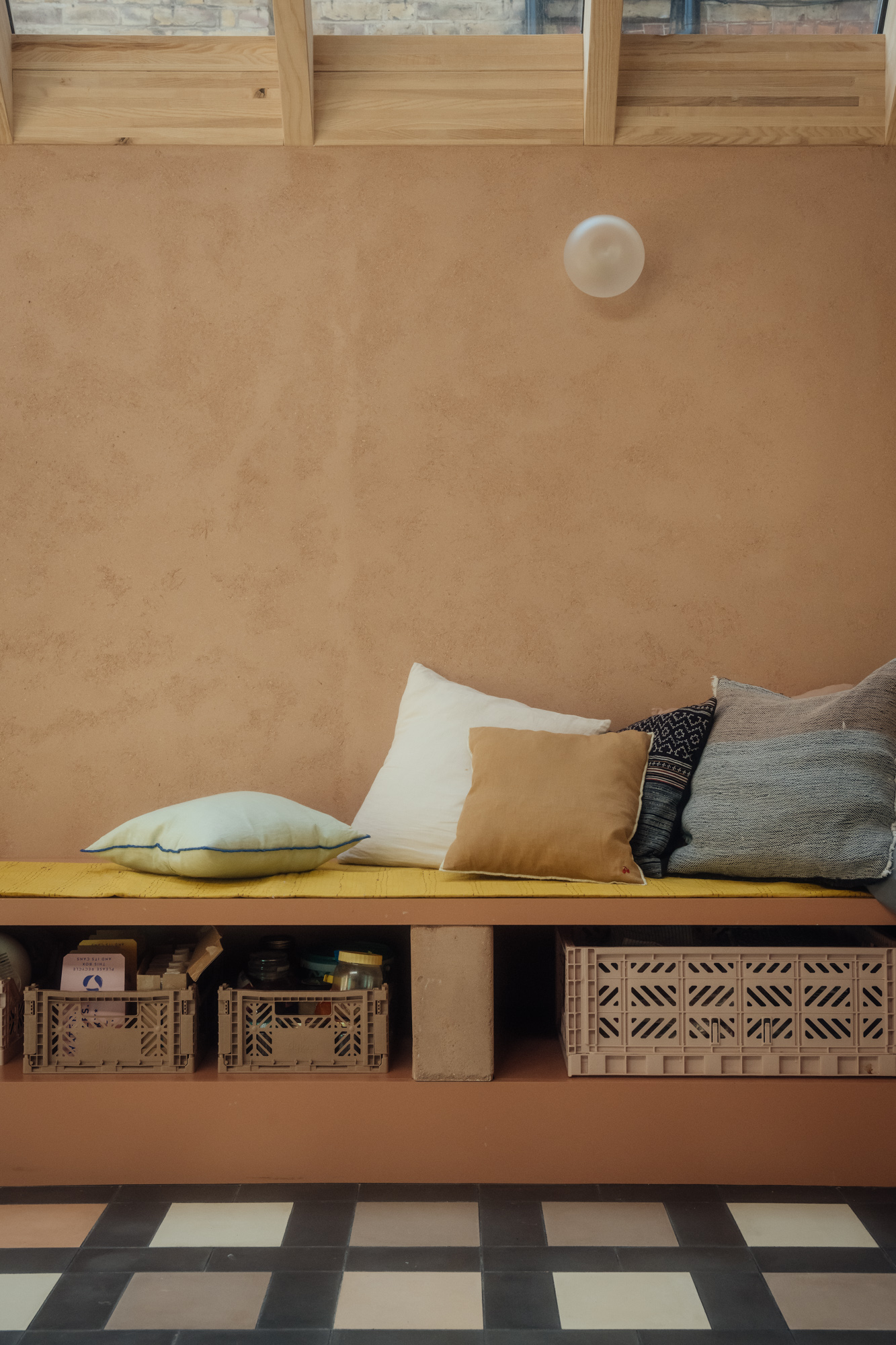 다이닝은 기존 주택의 벽과 개구부에 기대어 자리 잡았다. 기존 구조를 최대한 유지하여 원래 있던 개구부를 그대로 활용했다. 넓은 유리창 덕분에 빛이 공간 깊숙이 스며든다. 바닥은 맞춤형 타일 패턴을 사용해, 외부의 자갈길에서 영감을 받은 독특한 디자인으로 완성되었다. 주방은 기존 위치를 유지하며 새로운 조리대와 세탁실, 샤워실을 추가해 실용성과 수납 공간을 극대화했다. 새로운 공간은 외부의 분위기를 그대로 실내로 들여오기 위해 일부 마감재를 의도적으로 노출했다. 벽면에는 텍스처가 살아 있는 플라스터 마감을 사용했으며, 내부와 외부 모두 동일한 따뜻한 색감으로 마감했다. 세 개의 유광 컬러를 활용해 정원을 둘러싼 공간을 구분했다.
