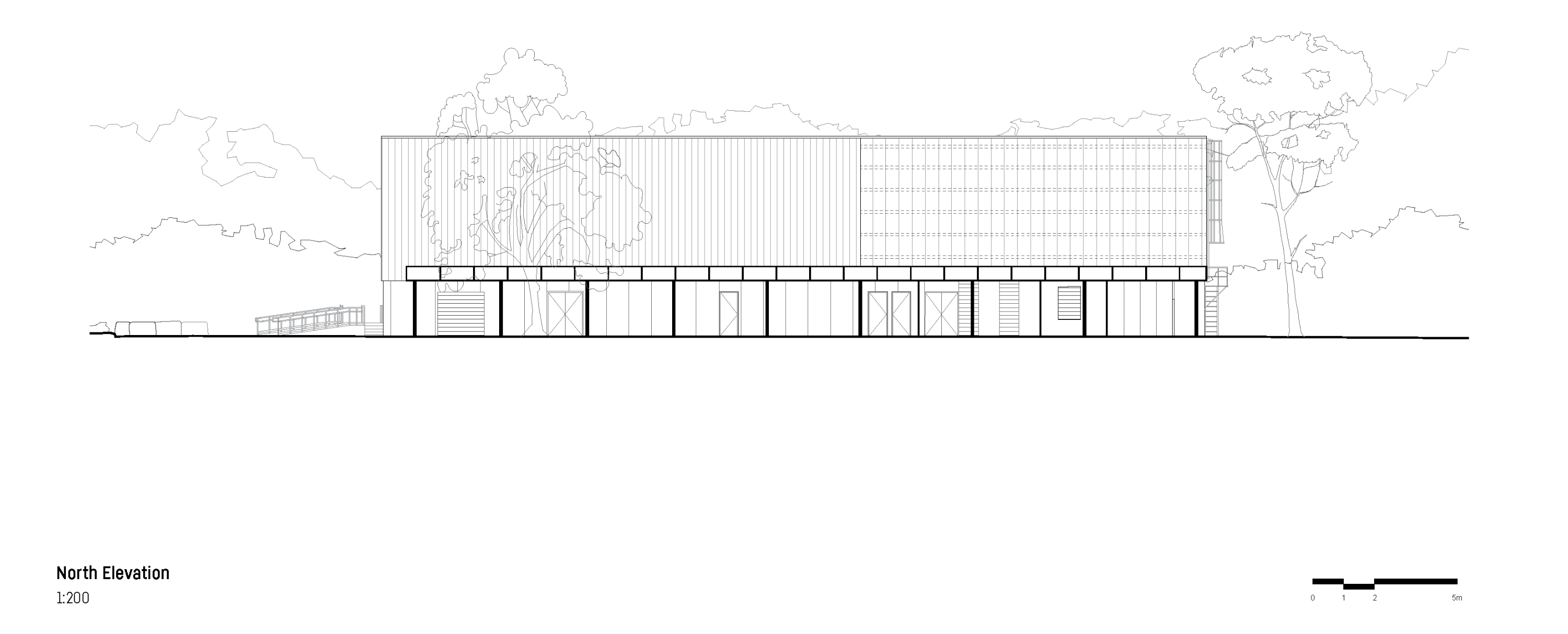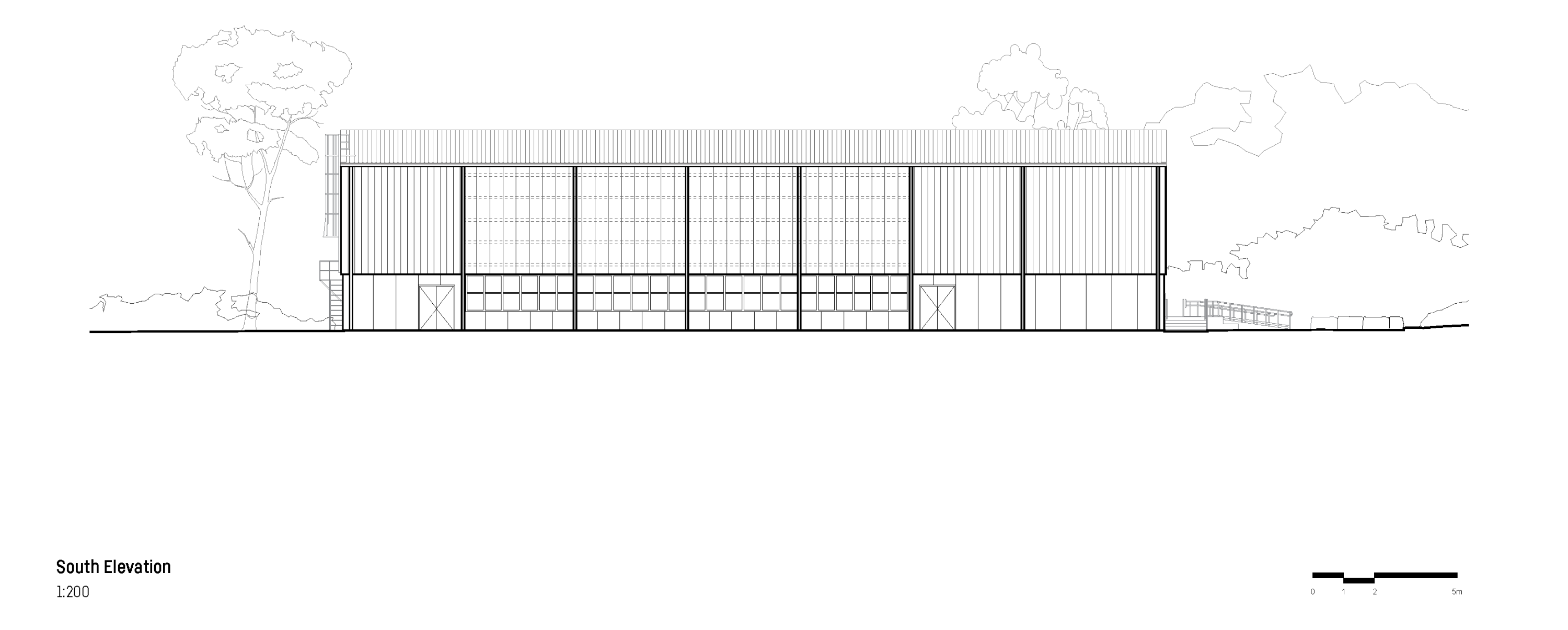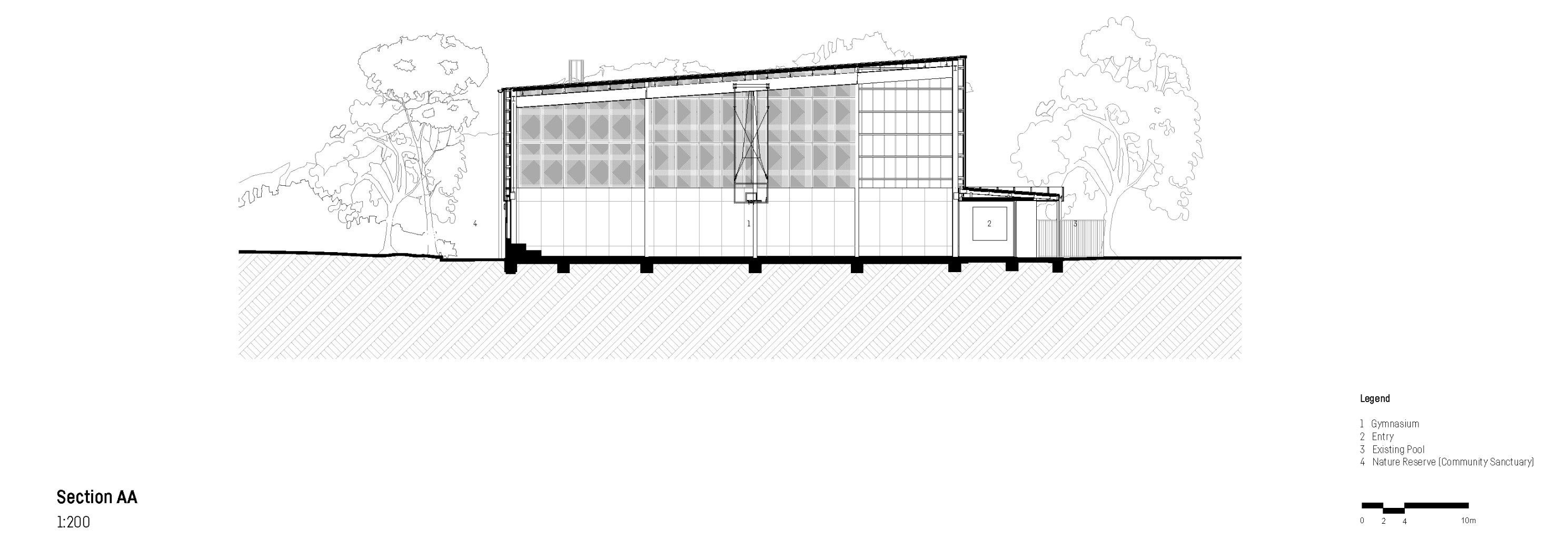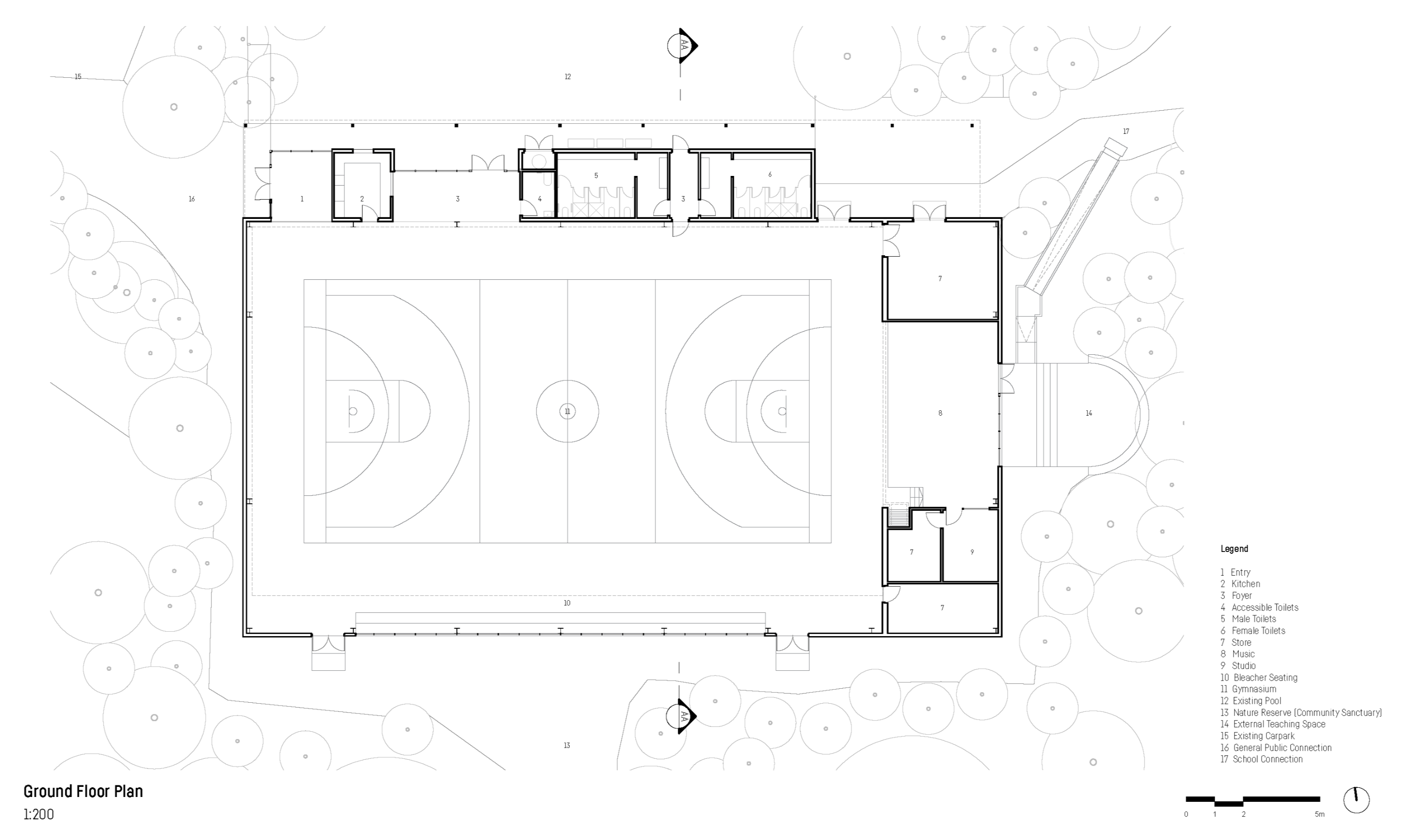 학교는 부누롱족 원주민들의 땅 위에 있으며, 학교 및 학부모 회의, 지역 사회와의 긴밀한 협의를 거쳐 체육관을 ‘커뮤니티 생추어리’라고 불리는 토착 관목 지대 인근에 배치하기로 결정했다. 기존에 충분히 활용되지 않았던 이 공간과 학교 간의 관계를 재정립하고자 한 것이다. 체육관은 다양한 방향으로 펼쳐지는 조망을 통해 주변 자연환경과의 연결을 극대화했고, 인접한 수영장과도 유기적으로 연결되도록 배치하여 건물이 자연 속에 녹아들도록 설계되었다. 또한, 음악실과 연결된 야외 교육 공간은 이 ‘생추어리’의 경계에 자리 잡아 학생들이 자연 속에서 직접 배우며 자신이 속한 ‘땅’과의 관계를 더욱 깊이 이해할 수 있도록 했다.
