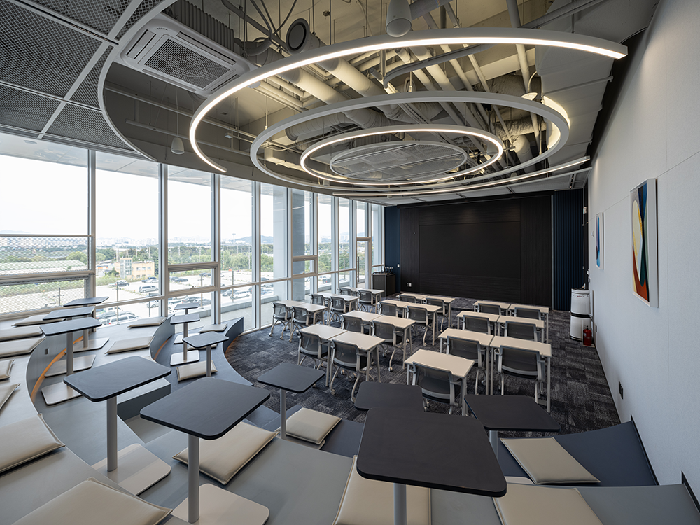 보편적인 재료를 어떻게 하면 효율적으로 디자인할 수 있을지 고민하여 가로에 면한 입면은 커튼 월로 구성하고, 적층되고 흐름으로 이어지는 루버의 선을 통해 시그니처 파사드를 만들었다. 이러한 입체적인 입면은 가로 경관에 활력을 불어넣으며 기업의 첫 번째 가치인 사람들이 행복하게 일하며 기여할 수 있는 환경을 만들었다.