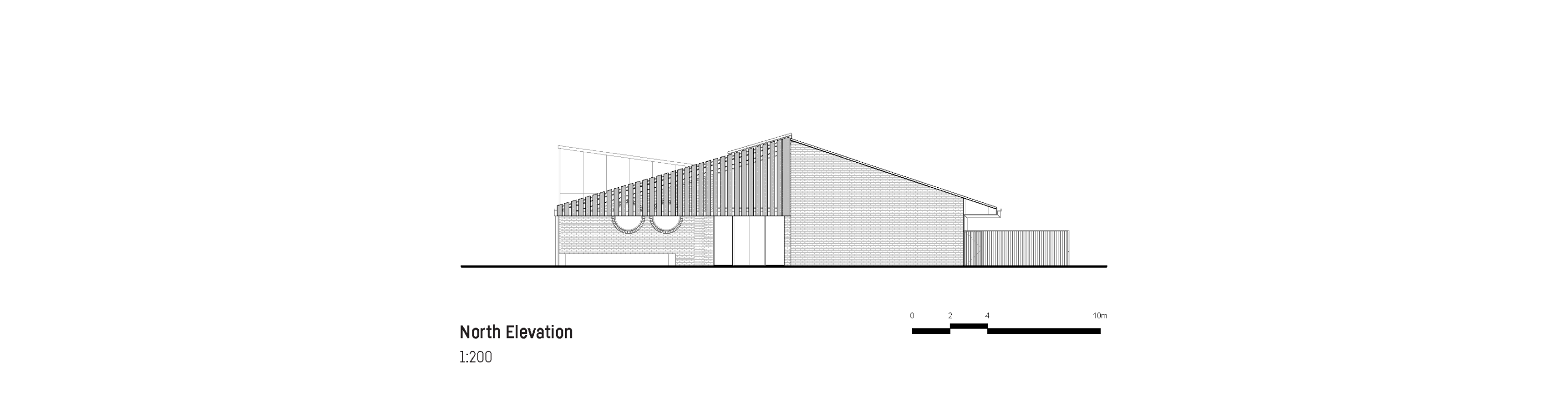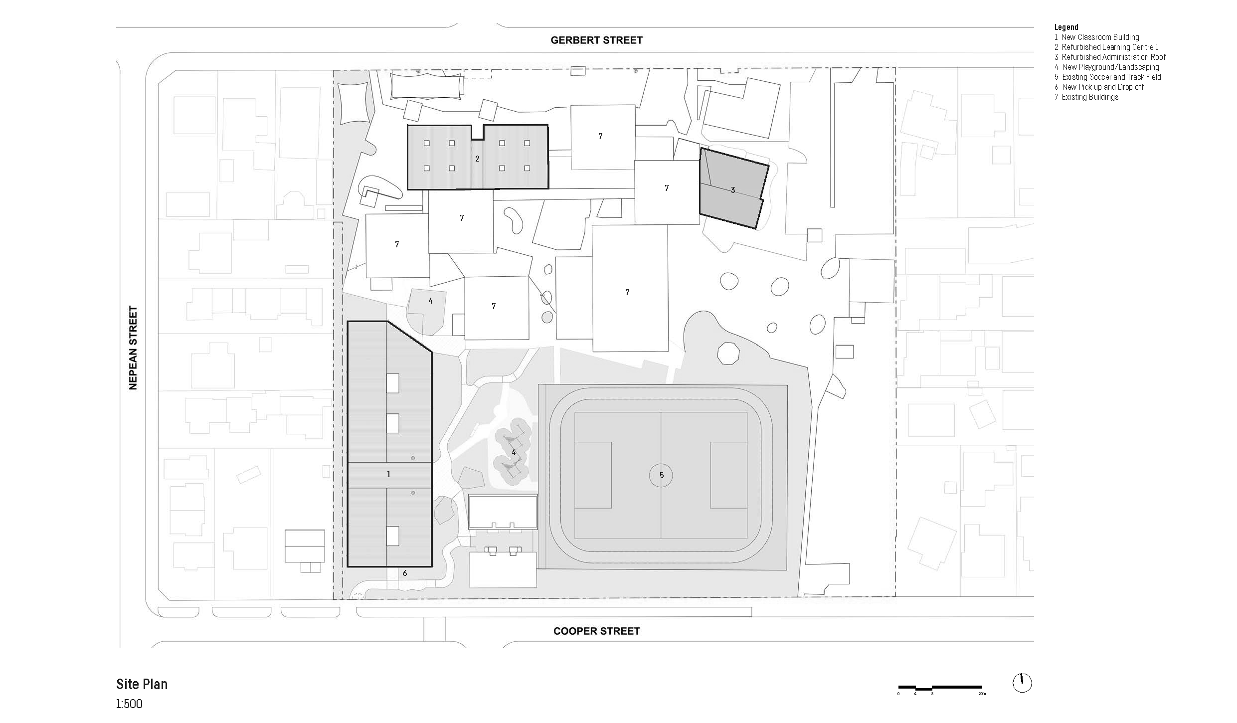 새로운 교실 건물은 캠퍼스 남서쪽 코너에 배치되어 기존 건물과 운동장 사이의 협소한 공간을 효과적으로 활용했다. 인근 주거 지역과 조화를 이루는 박공지붕 형태를 적용했으며, 서쪽에는 넓은 처마를 두어 차양 기능을 강화했다. 북쪽에는 금속 스크린과 덮개가 있는 야외 좌석 공간을 조성하여 학생들이 편안하게 쉴 수 있도록 했다. 동쪽 출입구는 천창을 활용하여 자연광을 실내로 유입시키면서도 명확한 출입 동선을 제공했다.