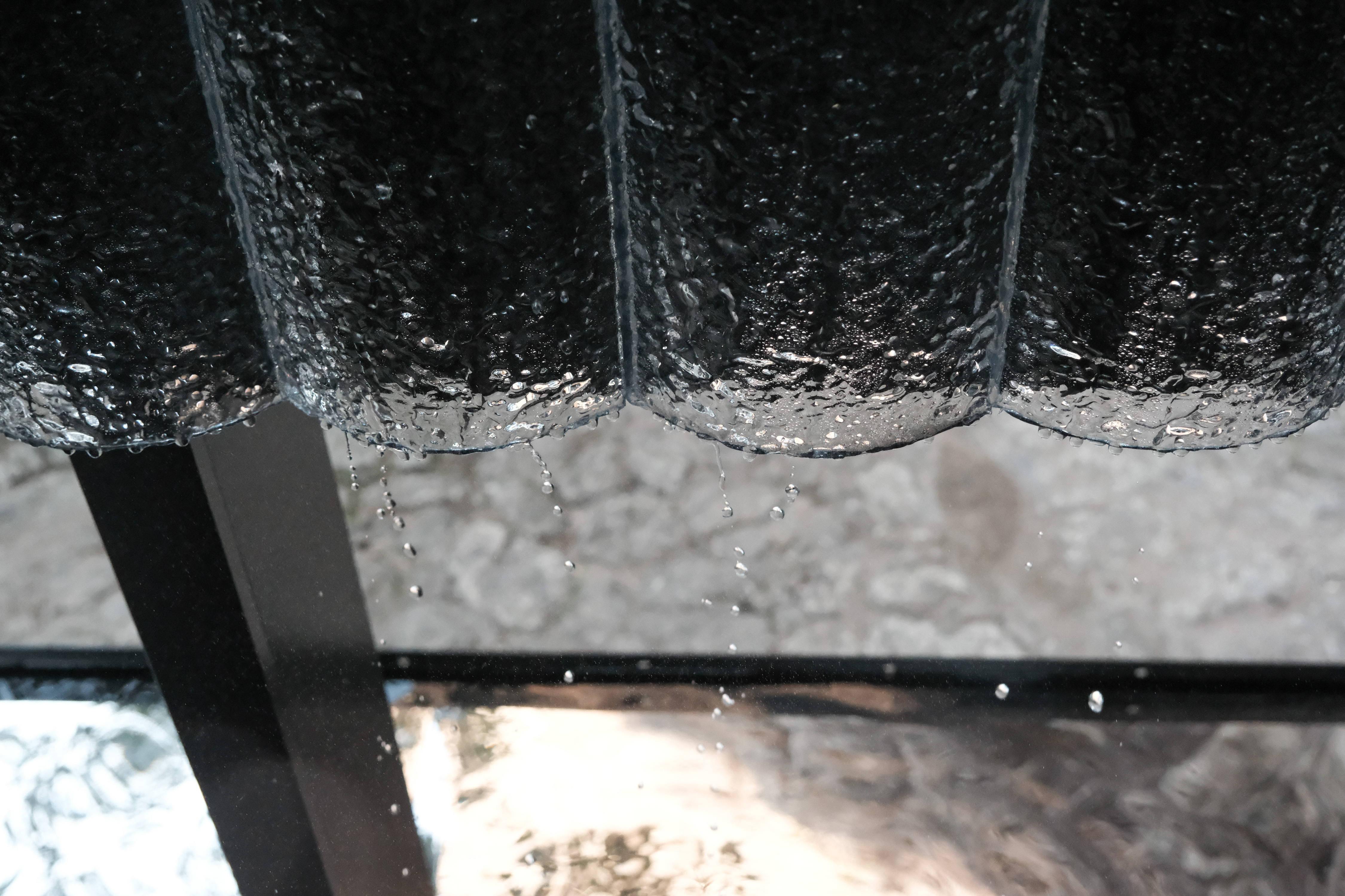 이 디자인은 동양 전통 건축의 기와 사이에서 떨어지는 빗방울에서 영감을 얻었다. 우리는 기존의 처마 역할을 다시 해석하여, 외부에서 비를 막는 기능을 실내로 가져와 비를 경험하는 공간으로 변형했다. 정자의 내부에는 투명한 유리 타일이 층층이 쌓여 있으며, 이는 검게 그을린 목재 외벽과 강렬한 대비를 이룬다. 천장에서 스며드는 햇빛은 타일 사이를 통과하면서 빛과 그림자가 어우러진 시적인 장면을 만들어 낸다. 비 오는 날에는 빗물이 타일을 따라 흘러내려 스테인리스 스틸로 된 반사 수조에 떨어진다. 방문객들은 손을 뻗어 빗방울을 직접 만지고, 물에 부딪히며 생기는 잔물결을 감상하며, 빗물이 연못에서 연못으로 흐르는 고요한 소리를 들을 수 있다. 단 4㎡ 규모의 이 작은 정자 안에서, 물은 인간과 자연을 연결하는 매개체가 된다. 수조에 비친 푸른 산, 폭포, 그리고 안개는 현실과 환상을 동시에 보여 주며, 시간이 멈춘 듯한 순간을 만들어 낸다.