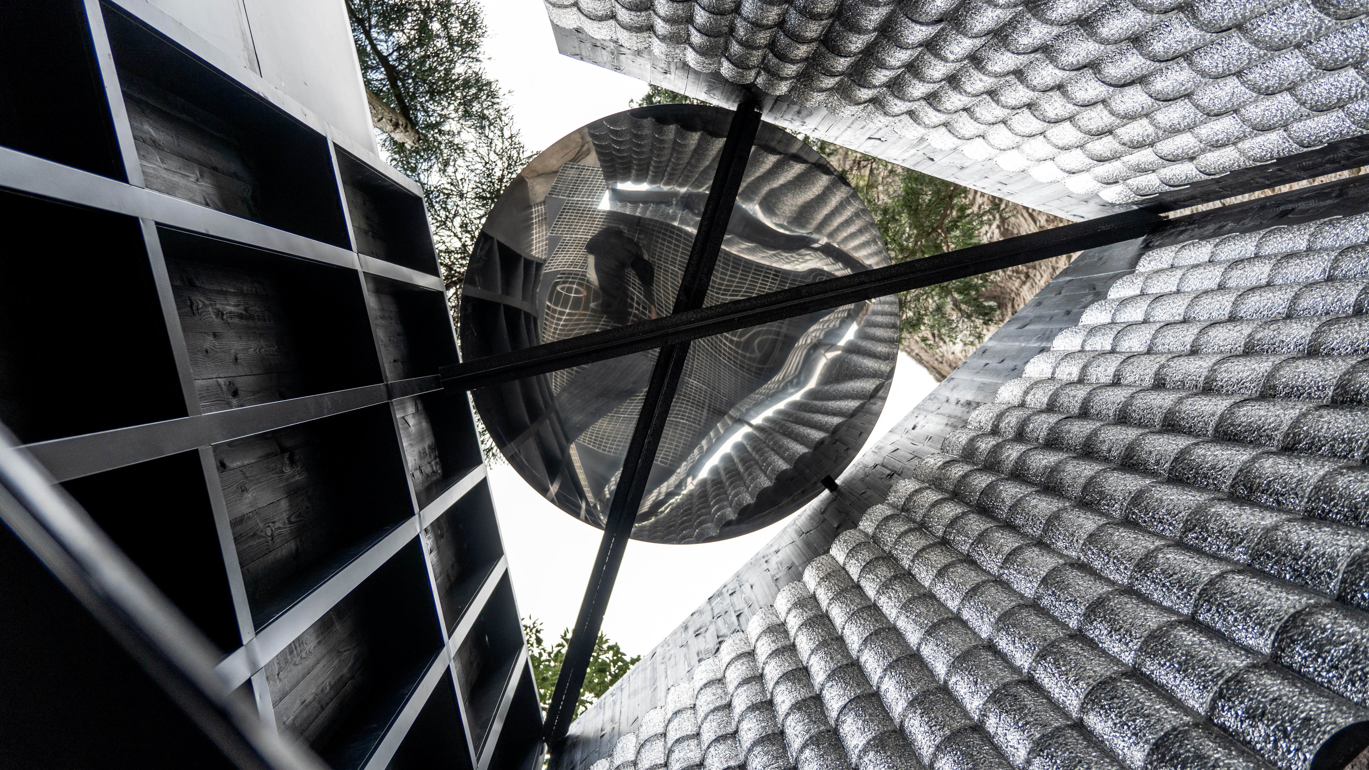 드롭-스톱은 삼각형 구조를 기반으로 하며, 상단에는 원형 스테인리스 스틸 요소가 매달려 있다. 바닥은 40×100cm 크기의 격자형 패턴으로 배치된 강철 그레이팅으로 이루어져 있으며, 이를 통해 시각적인 깊이감을 더했다. 정자 중앙에 서서 천천히 위를 바라보면, 수조에 비친 세상이 반사되어 움직이는 모습을 볼 수 있다. 그 시선이 빛의 흔들림을 따라가다 보면, 최종적으로 교차하는 철제 빔과 그 위에 비친 자신의 모습을 만나게 된다. 이는 마치 우주와 나 자신이 대화하는 장면을 연출한다.