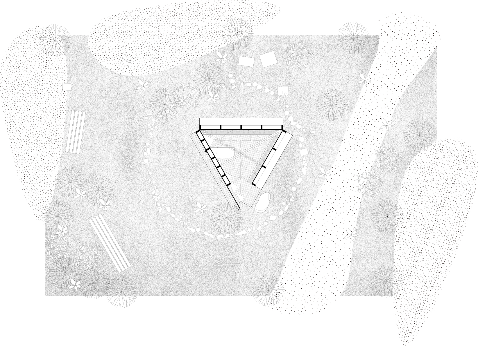세 번째 면에는 두 개의 출입구가 있는데, 메인 입구는 계단을 따라 오를 수 있는 개방형 구조로 되어있다. 비밀 입구는 아이들이 기어 들어갈 수 있도록 작은 규모로 설계되어, 공간을 탐색하는 재미 요소를 추가했다. 또한, 이 낮은 입구는 내부에서 외부로의 시야를 확장하는 역할을 한다. 입구에는 원래 이곳에 있던 돌계단과 소나무가 그대로 남아 있다. 설계 단계에서부터, 정자의 입구를 우뚝 솟은 소나무 옆에 배치하여, 그 수직적인 우아함이 건축물의 상승하는 형상과 조화를 이루도록 했다. 이 나무는 단순한 배경이 아닌, 정자의 일부로 자연스럽게 어우러지는 요소가 된다.