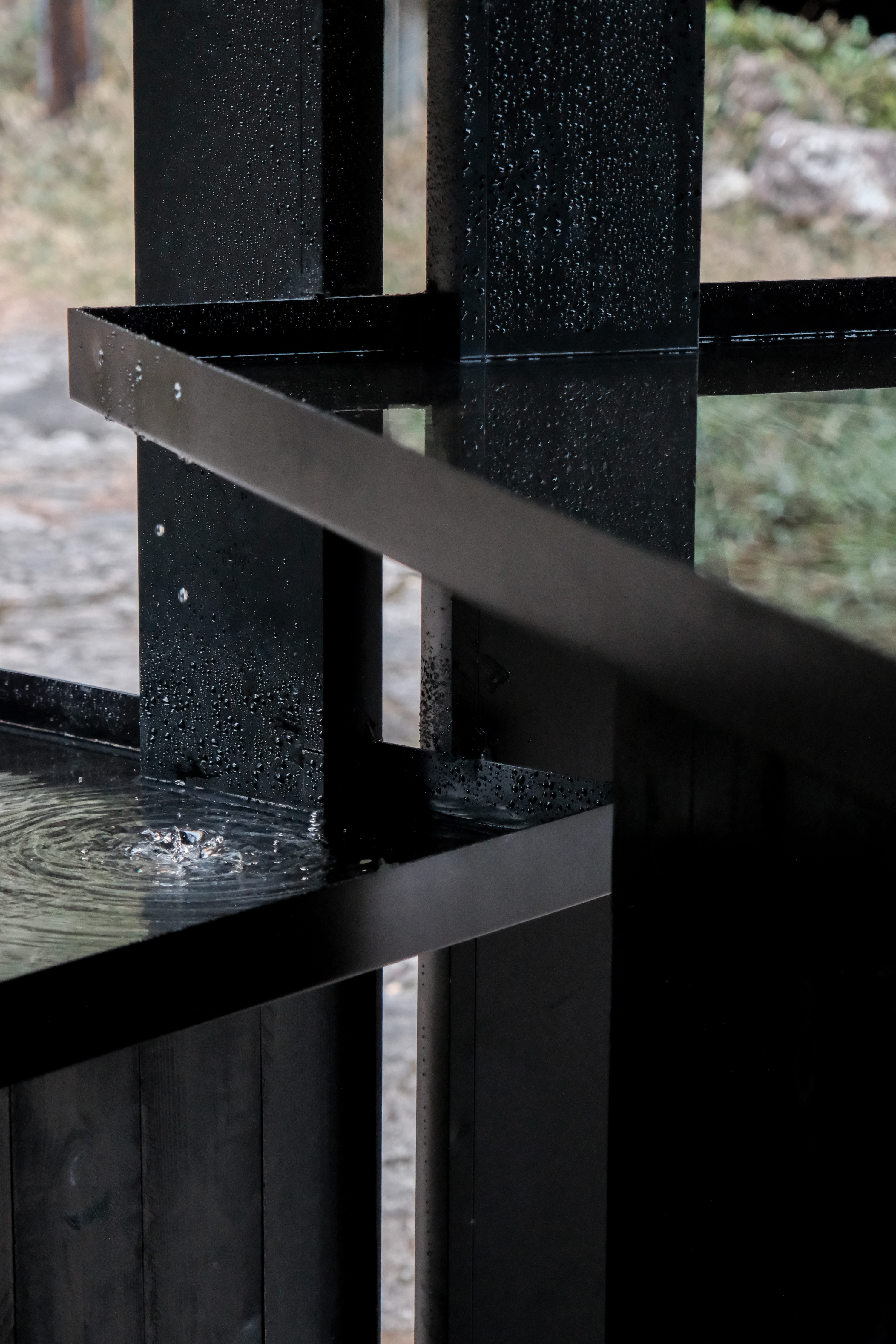이 디자인은 동양 전통 건축의 기와 사이에서 떨어지는 빗방울에서 영감을 얻었다. 우리는 기존의 처마 역할을 다시 해석하여, 외부에서 비를 막는 기능을 실내로 가져와 비를 경험하는 공간으로 변형했다. 정자의 내부에는 투명한 유리 타일이 층층이 쌓여 있으며, 이는 검게 그을린 목재 외벽과 강렬한 대비를 이룬다. 천장에서 스며드는 햇빛은 타일 사이를 통과하면서 빛과 그림자가 어우러진 시적인 장면을 만들어 낸다. 비 오는 날에는 빗물이 타일을 따라 흘러내려 스테인리스 스틸로 된 반사 수조에 떨어진다. 방문객들은 손을 뻗어 빗방울을 직접 만지고, 물에 부딪히며 생기는 잔물결을 감상하며, 빗물이 연못에서 연못으로 흐르는 고요한 소리를 들을 수 있다. 단 4㎡ 규모의 이 작은 정자 안에서, 물은 인간과 자연을 연결하는 매개체가 된다. 수조에 비친 푸른 산, 폭포, 그리고 안개는 현실과 환상을 동시에 보여 주며, 시간이 멈춘 듯한 순간을 만들어 낸다.