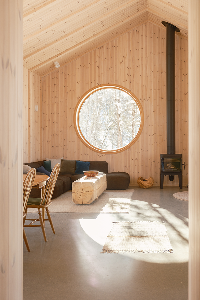 디자인은 단순하고 견고하며, 직사각형 구조에 대담한 절개부로 입구가 만들어졌다. 대형 원형 창은 실내외의 시각적 연속성을 제공하고 아늑함을 강조한다. 건물은 CLT 구조의 솔리드 우드로 시공되었고, 외장은 시간이 흐르며 회색으로 변하는 무가공 소나무 클래딩으로 마감되어 주변 자연과 조화를 이룬다.