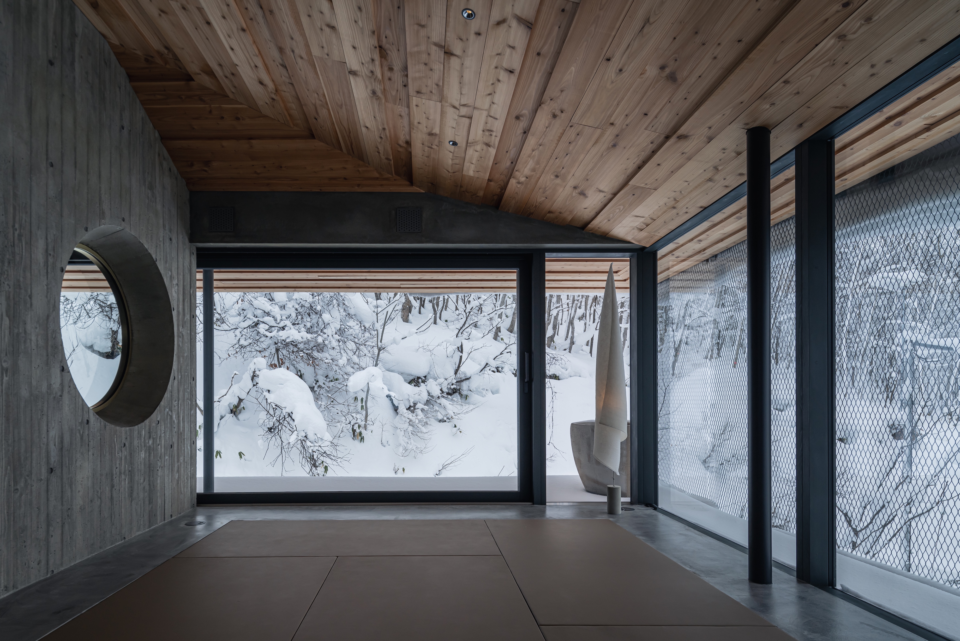 젠토는 홋카이도 니세코에 자리 잡은 건축주를 위한 휴가용 주택 ‘유키카게(Yukikage)’의 별관이다. 지하가 있는 단층 건물로, 낮고 수평적인 형태로 주변의 풍경과 연결된다. 건물은 깔끔한 직사각형 평면을 가지고 있으며, 입구를 나타내는 구조가 두드러진다. 경사진 지붕은 유리벽을 지나 땅에 닿을 것처럼 낮게 뻗어 있어 외부 환경으로부터 실내를 보호한다. 실내의 대각선 벽면은 이 건축물 내부의 유일한 벽으로 평면을 가로지르며 공간을 구분한다. 구분된 공간은 각각 북측의 숲을 향한 사적인 공간과 남측의 서재다. 남측의 서재에는 메쉬 커튼이 걸려 있어 프라이버시를 제공하고 외부로부터 유입되는 풍경을 부드럽게 감싼다.