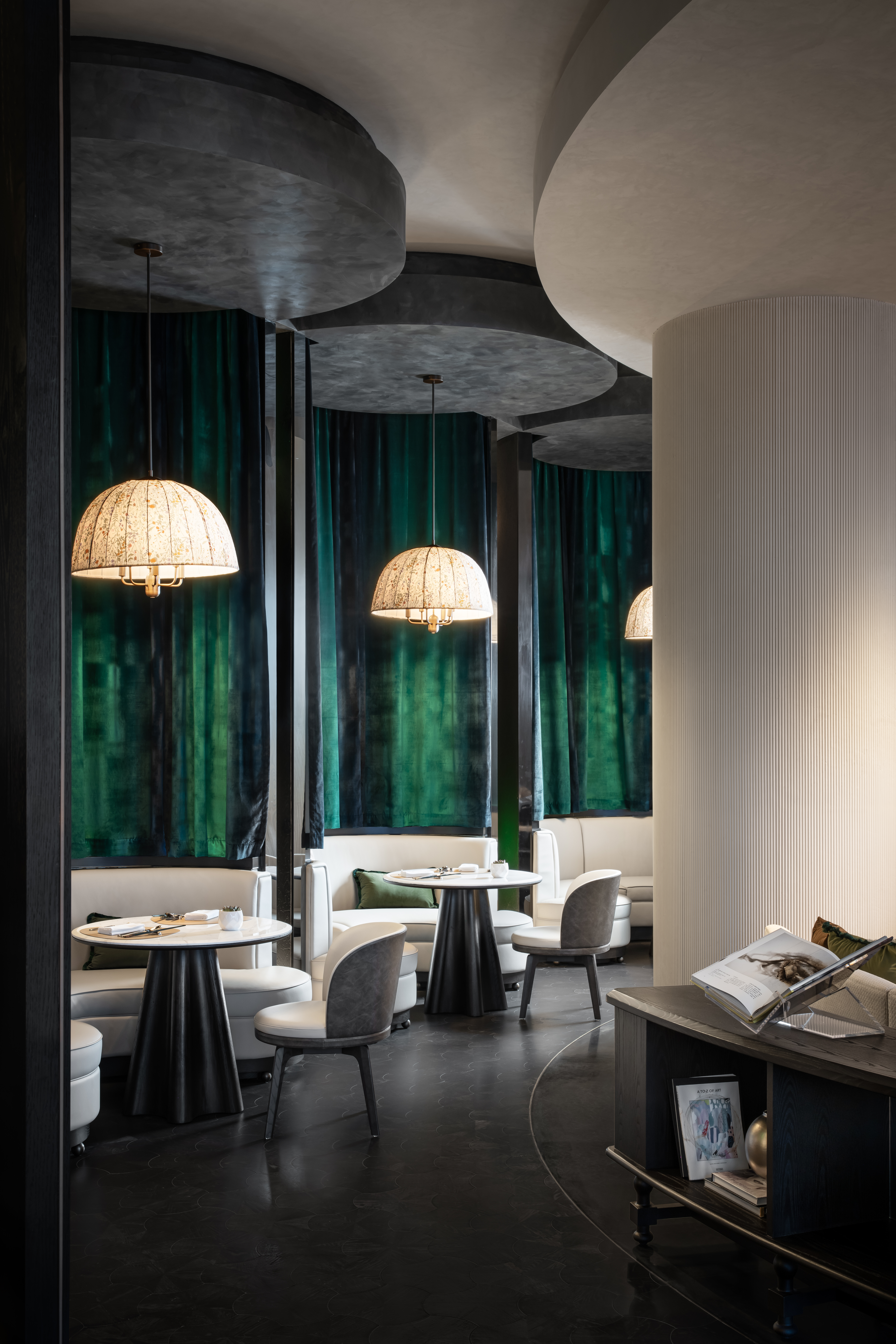 ‘Harmonia’ 다이닝 레스토랑은 오즈의 마법사를 모티브로 하여 짙은 녹색을 중심으로 한 밝은 색조로 신비로우면서 밝은 분위기를 조성했다. 빨강과 초록의 그라디언트 벨벳 커튼은 현대의 상하이와 중국 이미지를 연상시키며 우아한 분위기를 연출한다. 중식 레스토랑인 ‘Jin Lin’은 중국의 고전적인 회화에서 영감을 받아 붉은 금속과 검은 참나무의 텍스처를 사용했다. 겹겹히 쌓인 파티션은 시각적인 깊이를 만들어 내며, 상하이 지역의 시간의 흐름과 새로움을 상징하는 요소다. 홀 공간에는 메쉬 커튼을 통해 반개방형 공간을 형성하여 이용 고객들의 프라이버시와 개방성 사이의 균형을 이루고 있다.