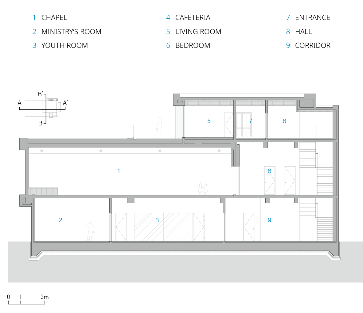 1층은 종교 활동을 보조하고 교육, 강연 등 다목적으로 사용 가능한 공간으로 목양실, 청년부실과 식당, 소예배당을 배치하여 모임과 친교를 장려한다. 청년부실과 식당 사이 복도는 유리 월로 계획하여 식당에서 마당까지 시각적으로 열려있다. 2층에는 예배당이 있으며 기존 교회의 박공 지붕을 예배당 내부에 노출콘크리트 박공 천장으로 담고, 벽은 따뜻한 색감의 우드톤 흡음 보드로 마감됐다. 파노라마로 펼쳐진 예배당 동측면의 베란다는 실내로 자연광을 은은하게 유입하고 자연의 변화를 내부에서도 느낄 수 있게 한다. 3층은 목사 부부를 위한 사택이 있다. 남측으로 배치한 개방감 있는 전면창 밖으로 콘크리트 지붕과 근경, 원경에 나지막하게 펼쳐진 자연이 겹쳐지며 평온한 분위기가 연출된다.