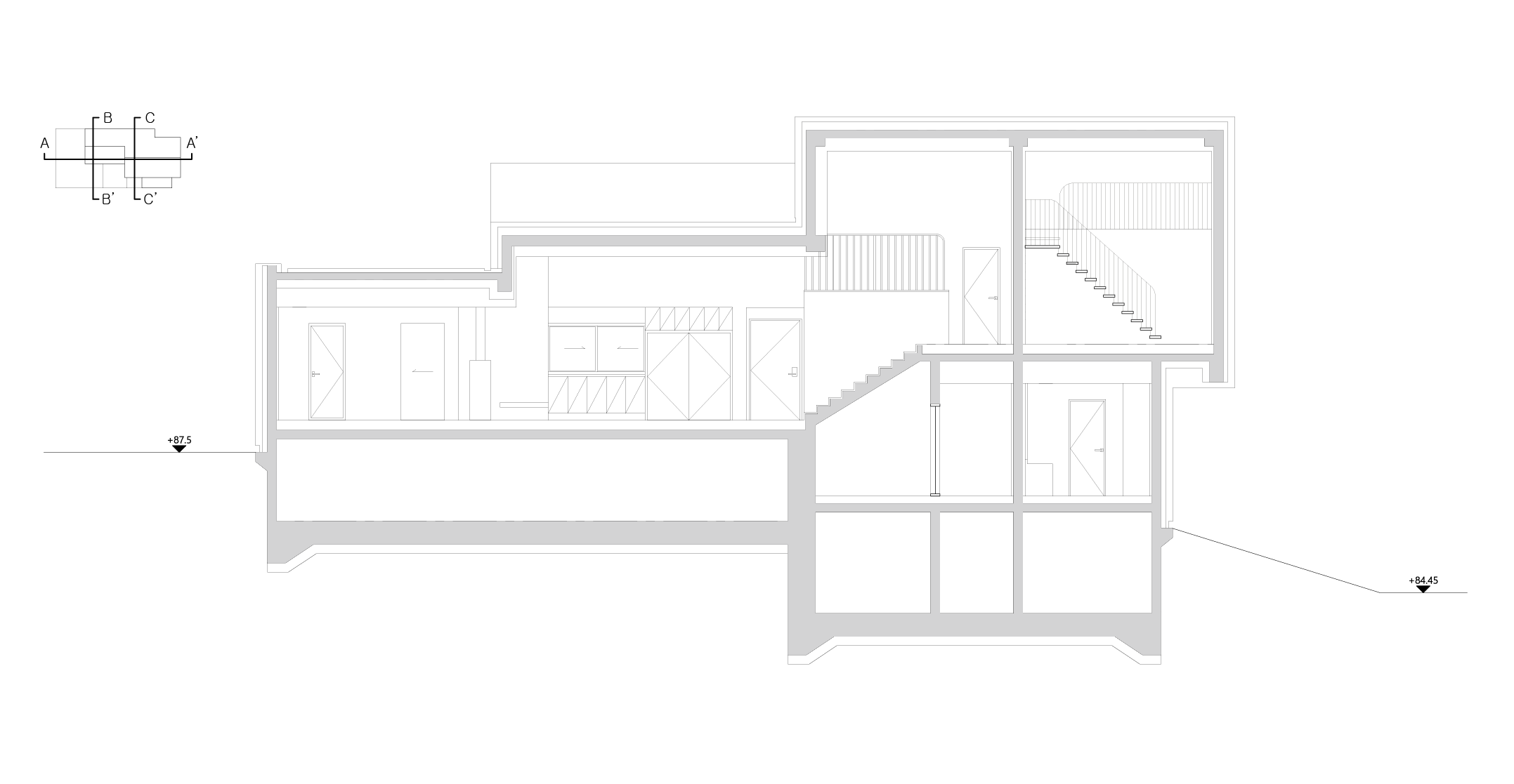 가사루 빌라는 대지의 경사를 반영하여 스킵플로어 형식으로 계획됐다. 중간 레벨에는 거실과 주방, 식당 같은 가족 공용 공간을 배치하고, 반 층의 위아래로 각각 가족 구성원의 개인 공간을 두었다.